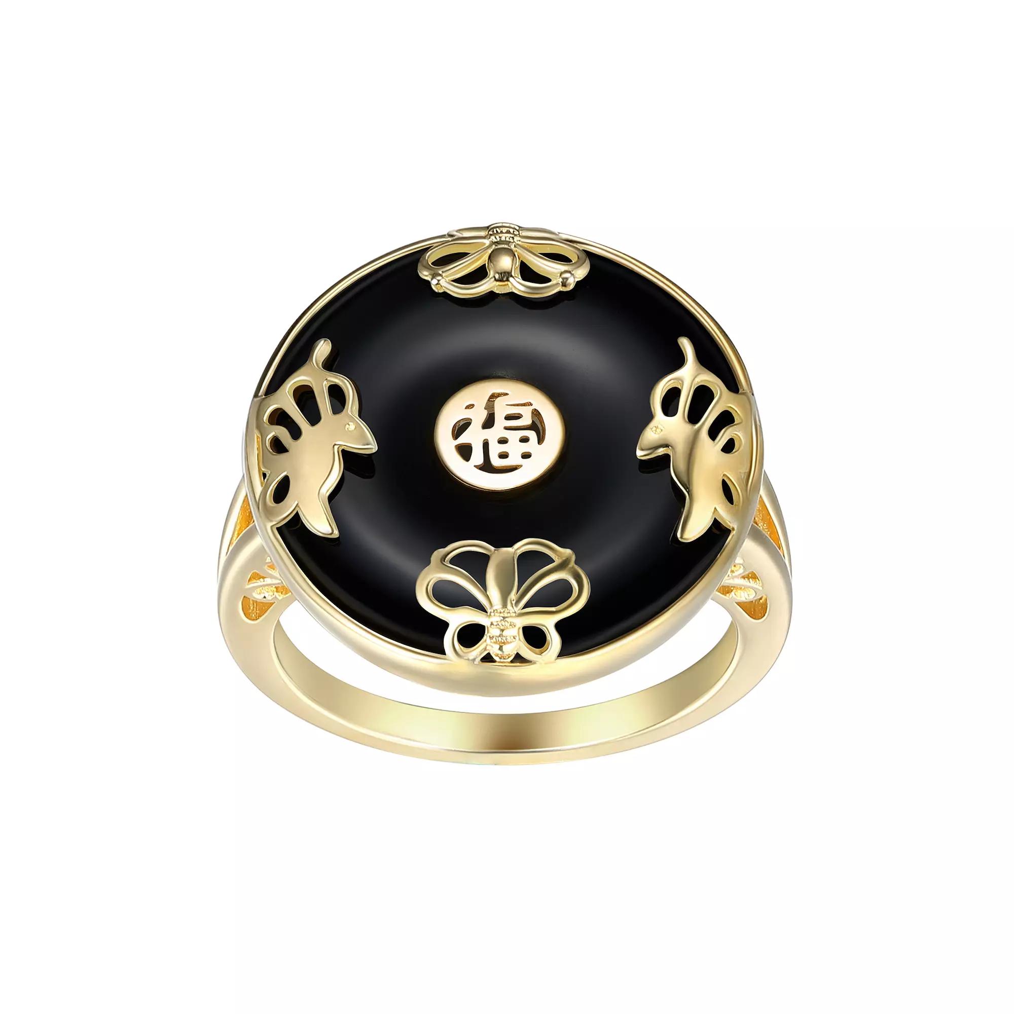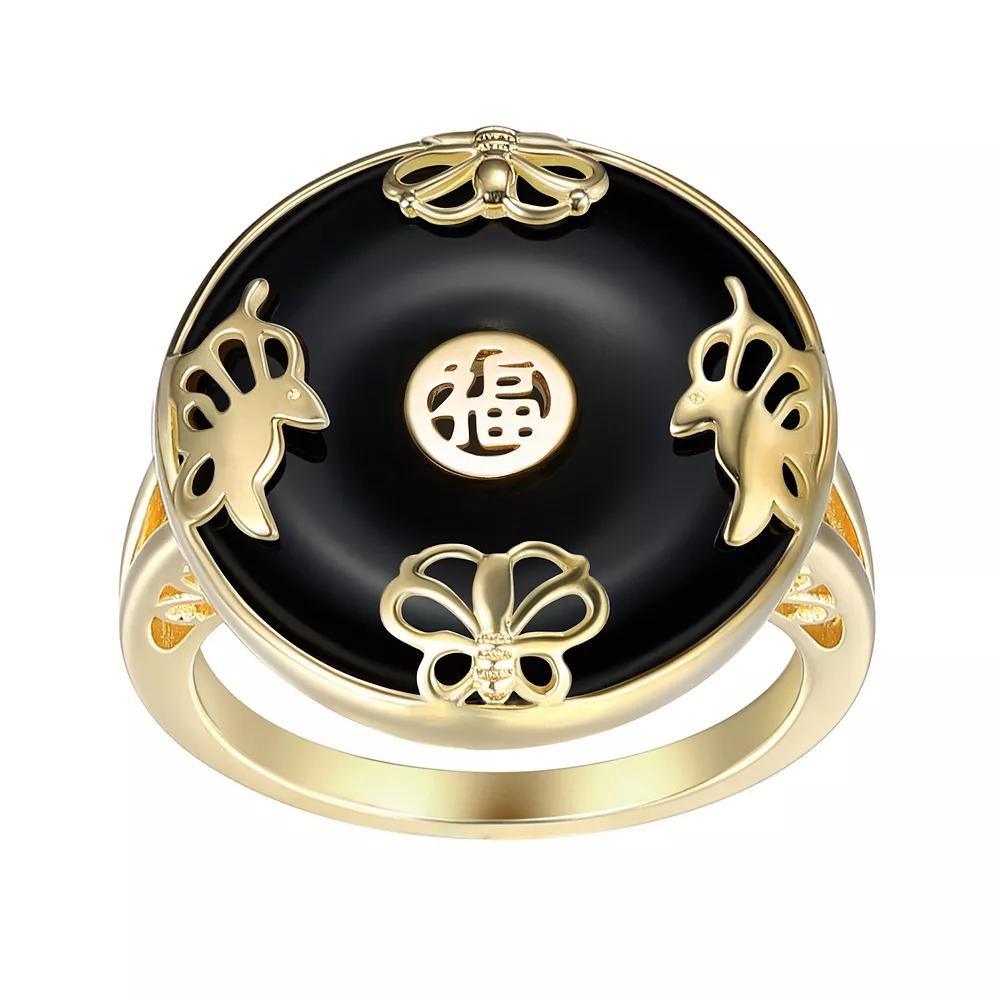 Elegantly decorated with flower and butterfly details, and the Chinese symbol for "good fortune," this black agate ring beautifully complements your wardrobe. Elegantly decorated with flower and butterfly details, and the Chinese symbol for "good fortune," this black agate ring beautifully complements your wardrobe. Width: 18 mm Metal: sterling silver Plating: 18k gold Finish: polished Packaging: boxedSTONE DETAILS Center stone size: 18 mm x 4 mm Shape: round cabochon Gender: female. Age Group: adult. Material: Gold Over Sterling.