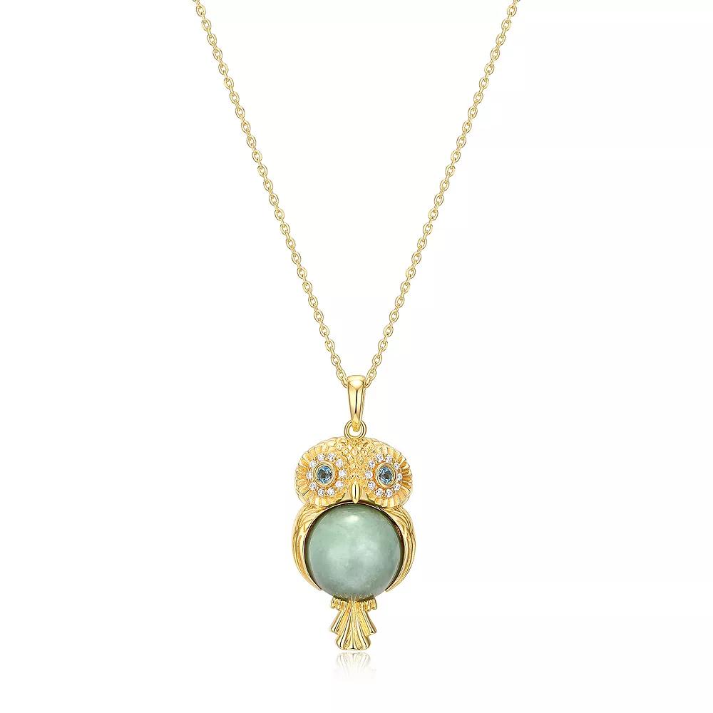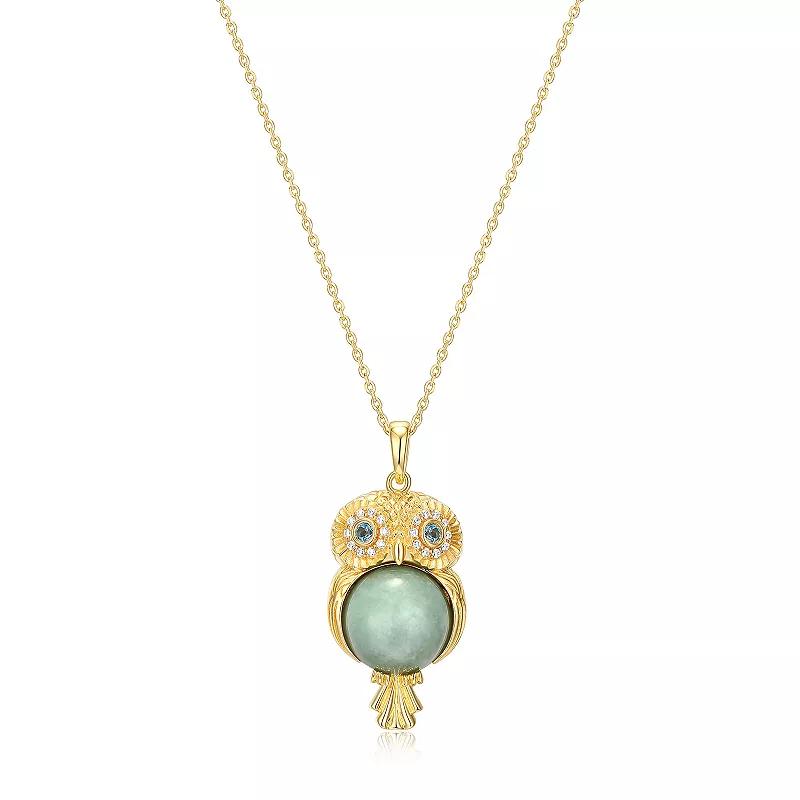 Add a quirky finishing touch to any ensemble with this unique jade, Swiss blue topaz, and cubic zirconia-embellished Dynasty Jade 18k gold plated owl pendant necklace. Click on this JEWELRY & WATCHES GUIDE to learn about fit, styles, materials and more! Add a quirky finishing touch to any ensemble with this unique jade, Swiss blue topaz, and cubic zirconia-embellished Dynasty Jade 18k gold plated owl pendant necklace. Click on this JEWELRY & WATCHES GUIDE to learn about fit, styles, materials and more! FEATURES Pendant dimensions: 33.25 mm x 15.79 mm Chain length: 18 in. Chain type: cable Clasp: lobster-claw Nickel safe Metal: sterling silver Plating: 18k gold Finish: polished Packaging: boxed ImportedSTONE DETAILS Stone type: cubic zirconia, jadeite jade, Swiss blue topaz Total weight: 5 3/8 ct. Center stone weight: 5 1/5 ct. Center stone size: 12 mm x 12 mm Shape: cabochon, round Setting: bezel, glue/epoxy, pave Gemstones may have been treated to enhance their appearance. Special care may be required. Please visit our Gemstone Treatment & Special Care Guide for more information. Size: 18. Color: Green. Gender: female. Age Group: adult. Material: Gold Over Sterling.