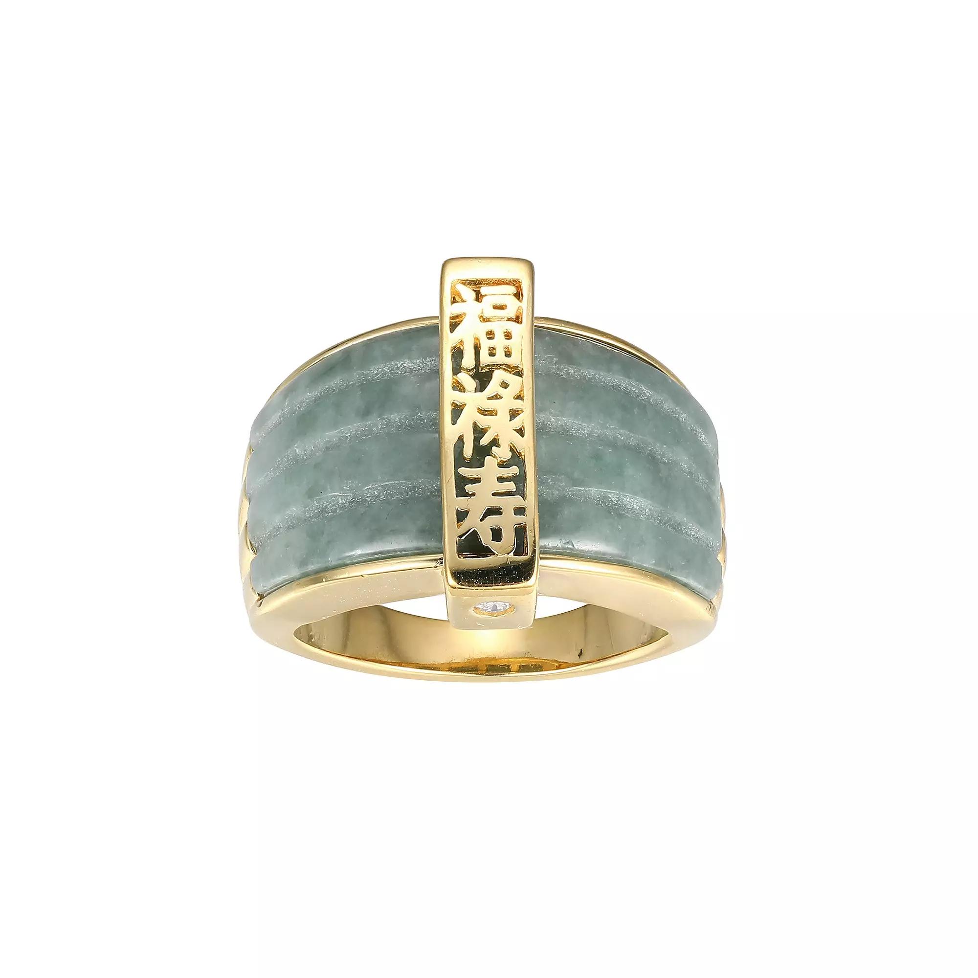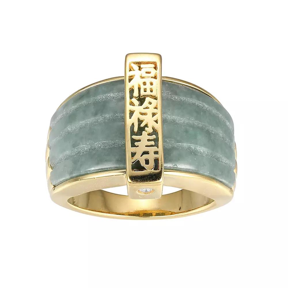 You'll feel lucky when you wear this 18k gold plated jade and lab-created white sapphire ring. You'll feel lucky when you wear this 18k gold plated jade and lab-created white sapphire ring. Width: 17.5mm Nickel free Metal: sterling silver Plating: 18k gold Finish: polished Inscription: Good Fortune Long Life Packaging: pouchSTONE DETAILS Stone type: jadeite jade, lab-created white sapphire Total weight: 14 1/2 ct. Shape: cabochon Setting: flush, glue/epoxy Gemstones may have been treated to enhance their appearance. Special care may be required. Please visit our Gemstone Treatment & Special Care Guide for more information. Image(s) may be enlarged to show detail. Please note, due to the high value of this item, a signature may be required upon delivery. Color: Green. Gender: female. Age Group: adult. Material: Gold Over Sterling.