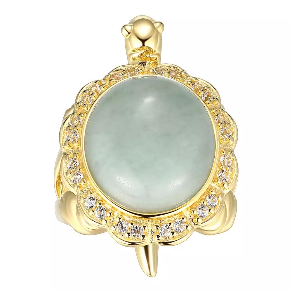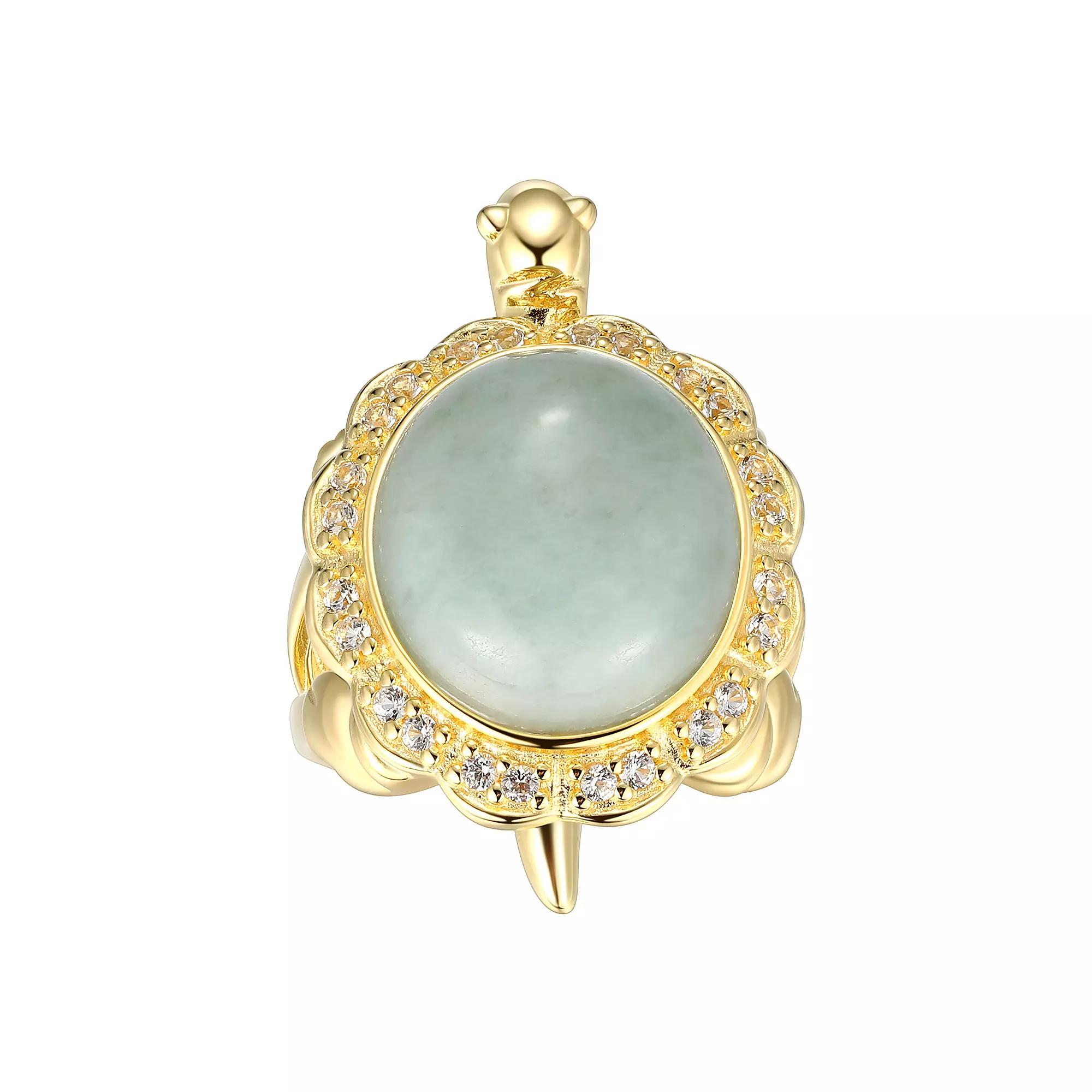 Add style to your look with this 18k Gold Over Sterling Silver Jade & Lab-Created White Sapphire Turtle Ring. Click on this JEWELRY & WATCHES GUIDE to learn about fit, styles, materials and more! Add style to your look with this 18k Gold Over Sterling Silver Jade & Lab-Created White Sapphire Turtle Ring. Click on this JEWELRY & WATCHES GUIDE to learn about fit, styles, materials and more! FEATURES Width: 32 mm Shank style: split Band fit: half-round Nickel free Metal: sterling silver Plating: 18k gold Finish: polished Packaging: boxedSTONE DETAILS Stone type: jadeite jade, lab-created white sapphire Center stone: 16 mm x 14 mm Shape: oval, round Setting: glue/epoxy, prong Gemstones may have been treated to enhance their appearance. Special care may be required. Please visit our Gemstone Treatment & Special Care Guide for more information. Size: 9. Color: Green. Gender: female. Age Group: adult.