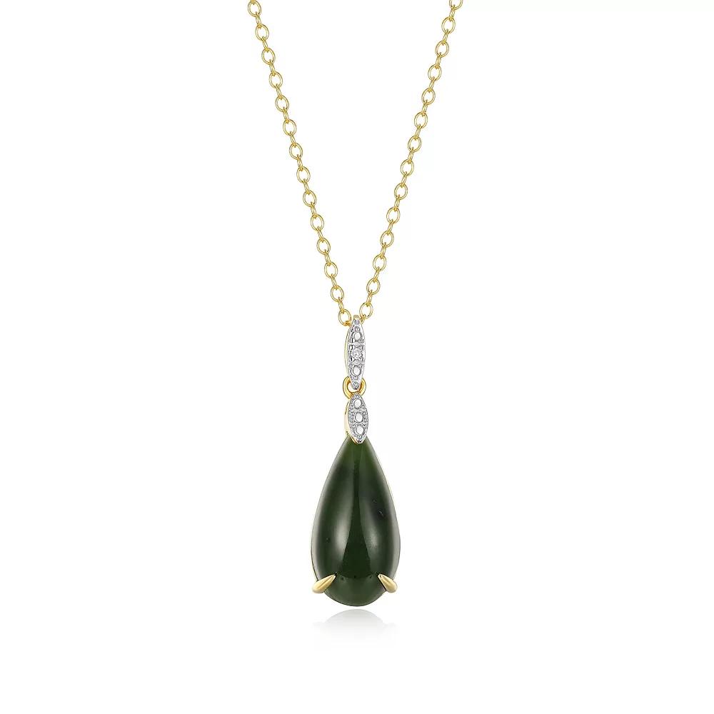 Accessorize in style with this Dynasty Jade 18k gold over sterling silver nephrite jade & diamond accent teardrop pendant necklace. Click on this JEWELRY & WATCHES GUIDE to learn about fit, styles, materials and more! Accessorize in style with this Dynasty Jade 18k gold over sterling silver nephrite jade & diamond accent teardrop pendant necklace. Click on this JEWELRY & WATCHES GUIDE to learn about fit, styles, materials and more! FEATURES Pendant size: 1.04"L x 0.31"W Chain length: 18 in. Chain type: cable Clasp: lobster-claw Nickel safe Metal: sterling silver Plating: 18k gold Finish: polished Packaging: boxedSTONE DETAILS Stone type: nephrite jade Shape: cabochon, pear Setting: prongDIAMOND DETAILS Total weight: less than 1/10 ct. Color grade: I Clarity: I3 Shape: round Setting: micro pave Gemstones may have been treated to enhance their appearance. Special care may be required. Please visit our Gemstone Treatment & Special Care Guide for more information. Diamond weights are approximate. Diamond Total Weights may vary between .01 and .13 ct. Some diamonds consist of fewer than 17 facets. Image(s) may be enlarged to show detail. Size: 18". Color: Gold Tone. Gender: female. Age Group: adult.