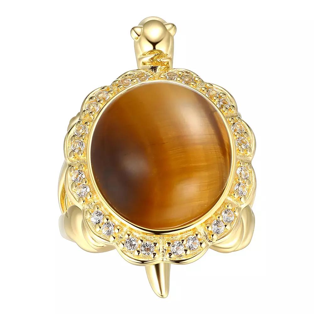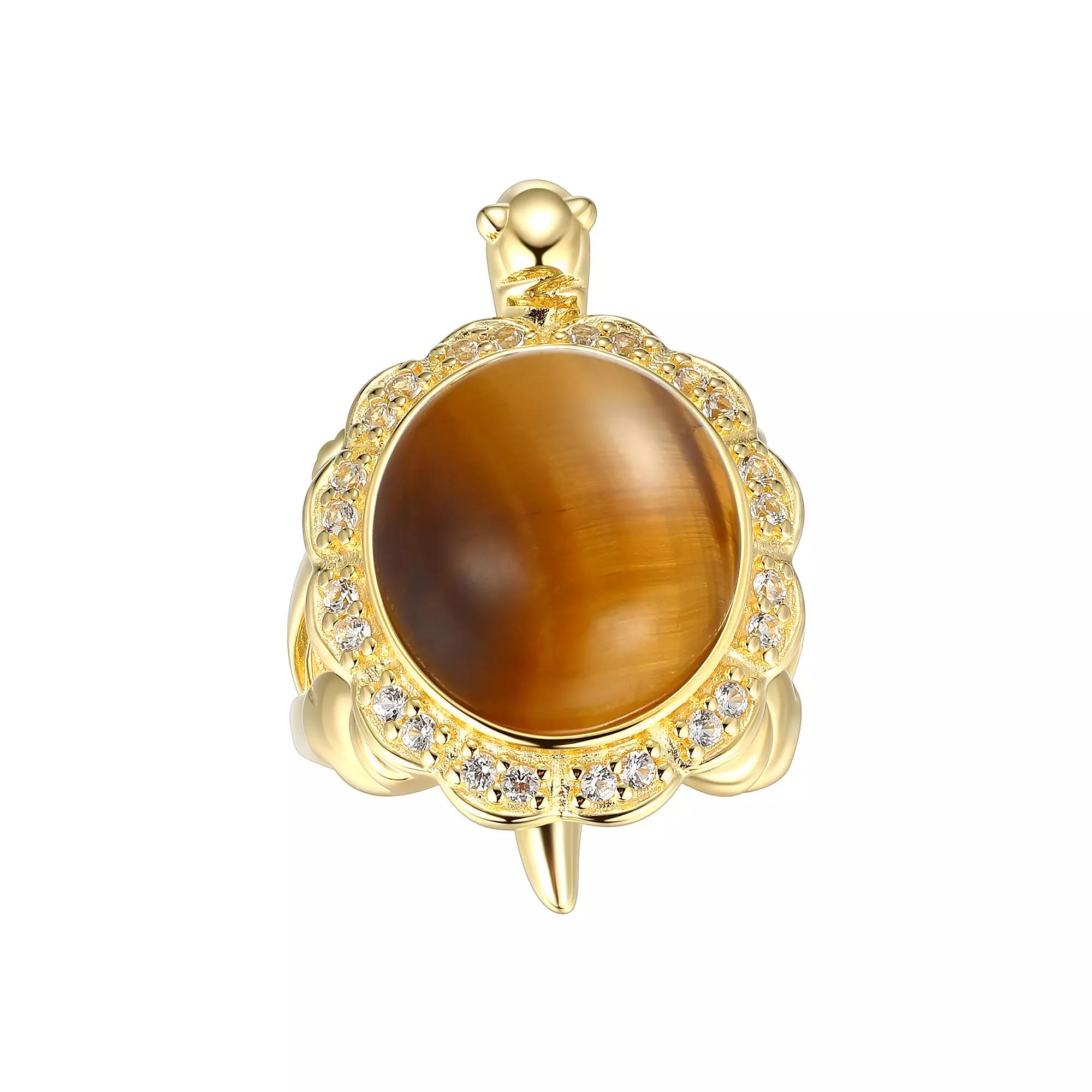 Add style to your look with this 18k Gold Over Sterling Silver Tigers Eye & Lab-Created White Sapphire Turtle Ring. Click on this JEWELRY & WATCHES GUIDE to learn about fit, styles, materials and more! Add style to your look with this 18k Gold Over Sterling Silver Tigers Eye & Lab-Created White Sapphire Turtle Ring. Click on this JEWELRY & WATCHES GUIDE to learn about fit, styles, materials and more! FEATURES Width: 32 mm Shank style: split Band fit: half-round Nickel free Metal: sterling silver Plating: 18k gold Finish: polished Packaging: boxedSTONE DETAILS Stone type: lab-created white sapphire, tigers eye Center stone: 16 mm x 14 mm Shape: oval, round Setting: glue/epoxy, prong Gemstones may have been treated to enhance their appearance. Special care may be required. Please visit our Gemstone Treatment & Special Care Guide for more information. Size: 9. Color: Brown. Gender: female. Age Group: adult.