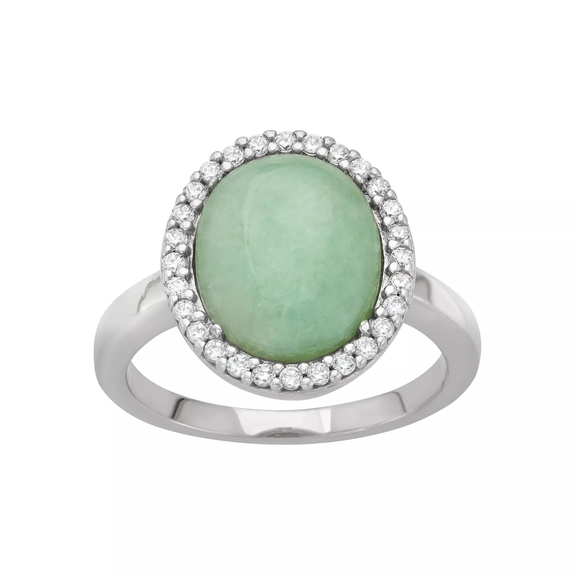Featuring a jadeite jade cabochon surrounded by dazzling CZ accents, this sterling silver halo ring offers timeless style. Featuring a jadeite jade cabochon surrounded by dazzling CZ accents, this sterling silver halo ring offers timeless style. Width: 9/16 in. Metal: sterling silver Plating: rhodium Finish: polished Packaging: boxedSTONE DETAILS Stone type: jadeite jade Total weight: 4 5/8 ct. Center stone size: 12 mm x 10 mm Shape: oval cabochon, round Please note, due to the high value of this item, a signature may be required upon delivery. Color: Green. Gender: female. Age Group: adult.