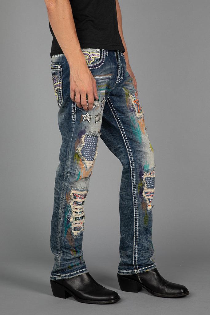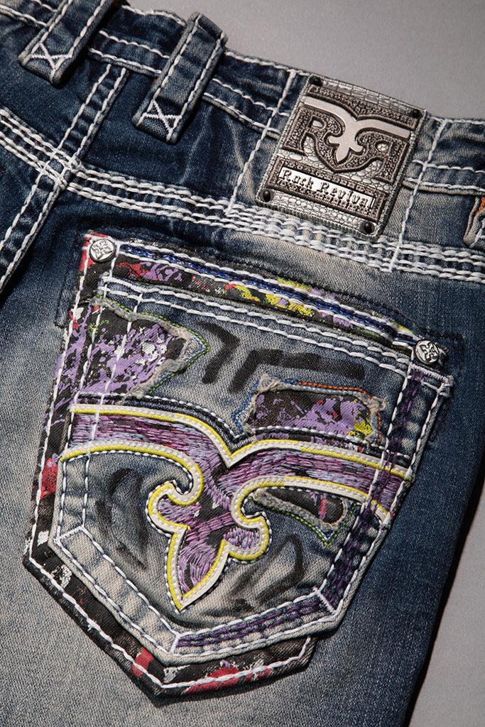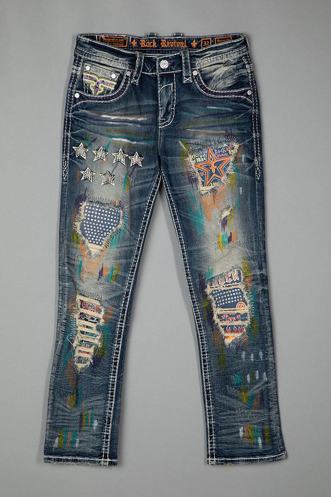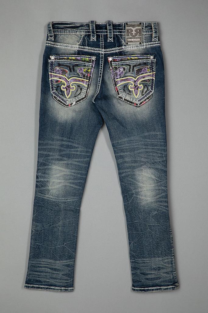 Exhibition series, custom silver white buttons, and rivets decoration throughout. Heavily distressed front legs, decorated multi-color paint, and art patchwork and clear crystals. Featuring the iconic reversed Fleur De Lis frayed back pockets decorated with purple embroidery and color stitching. "Rock Revival" metal engraved on a silver-gray snakeskin leather patch on the belt loop. Designed with care and creativity in Los Angeles, California.