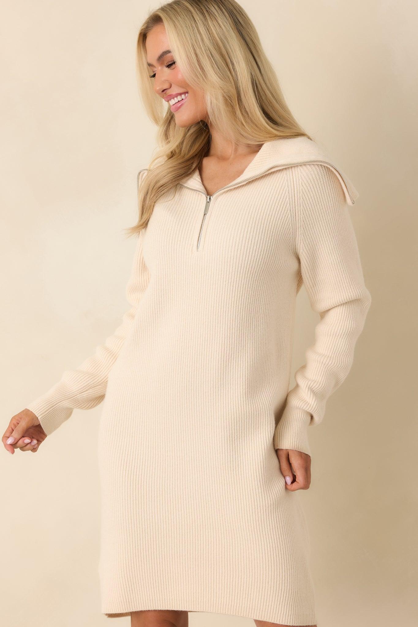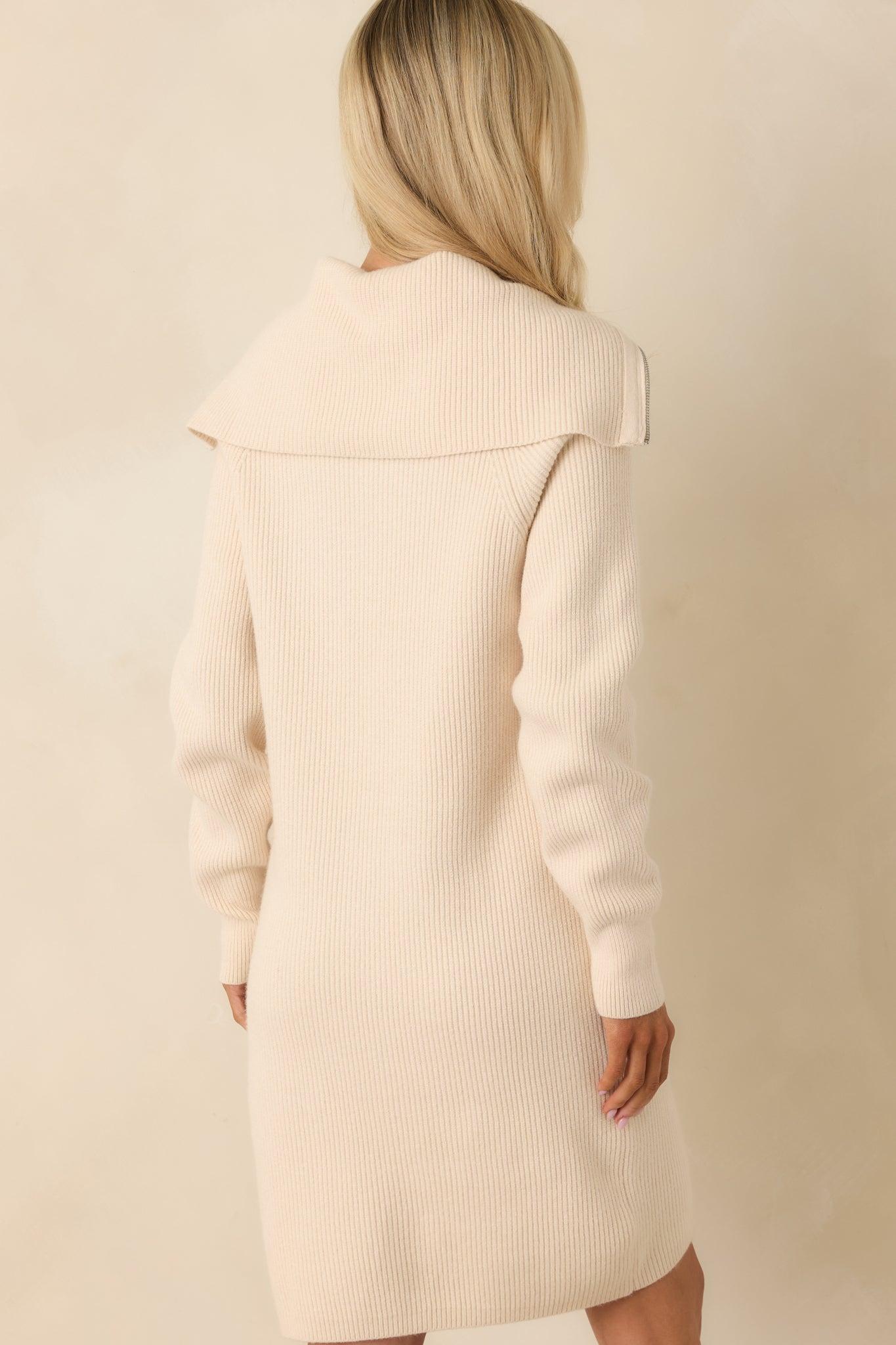 The Ease Into It Beige Knit Half-Zip Funnel Collar Longline Sweater Dress is made for slower starts and polished finishes. Its soft ribbed knit and relaxed longline silhouette feel cozy without looking casual, while the half-zip funnel collar adds an effortless, styled touch. Whether you’re heading out or settling in, this is the kind of layer that makes getting dressed feel simple and intentional. This beige knit sweater dress features a ribbed fabric with a relaxed longline fit and a half-zip funnel collar neckline. Designed with long sleeves, ribbed cuffs, and a straight hemline, it offers comfortable coverage and easy layering. The vertical ribbing creates subtle texture throughout.