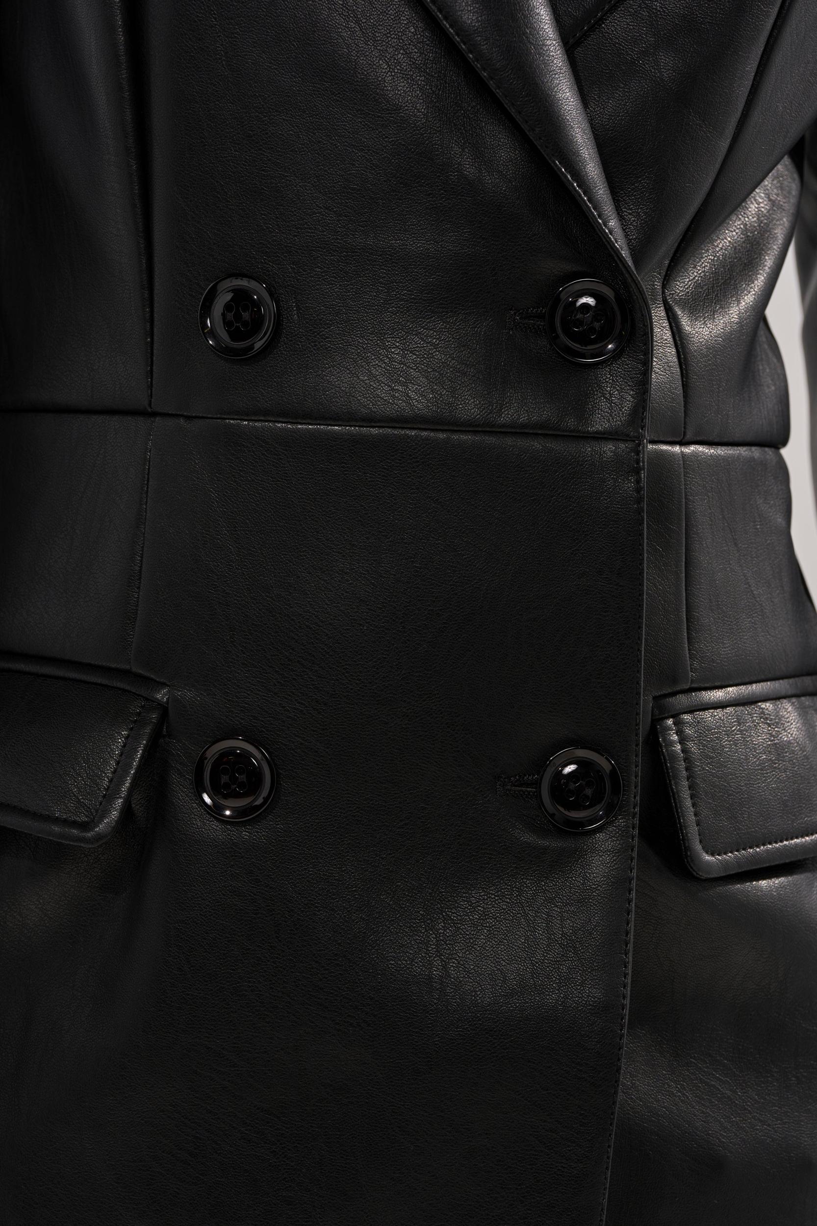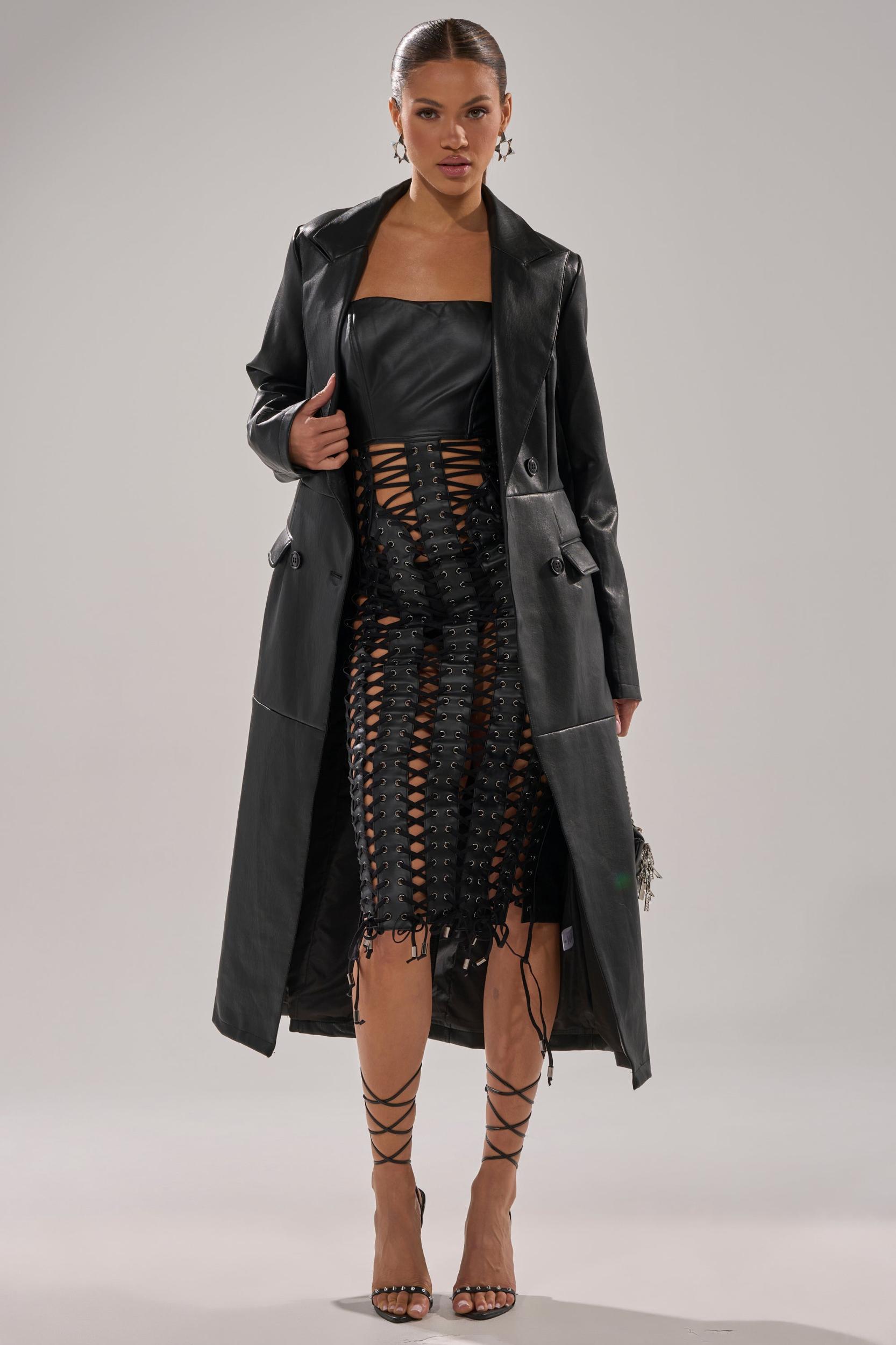 Take a chill pill in The AKIRA Label Easy Does It Faux Leather Trench. Crafted from sleek leather, this refined jacket features a classic notched lapel, long sleeves, a welted chest pocket, two flap waist pockets, a double-breasted front closure, and a back vent slit. Complete with a longline silhouette. - Face: 100% PU, Base: 90% Polyester 10% Viscose, Lining: 100% Polyester- No Stretch- Imported (all measurements approximate from size small)- 49” Shoulder to Hem- 15” Shoulder to Shoulder- 26” SleevesProduct ID: 1060499 (all measurements approximate from size 1X)- 51” Shoulder to Hem- 17” Shoulder to Shoulder- 28” SleevesProduct ID: 1060503