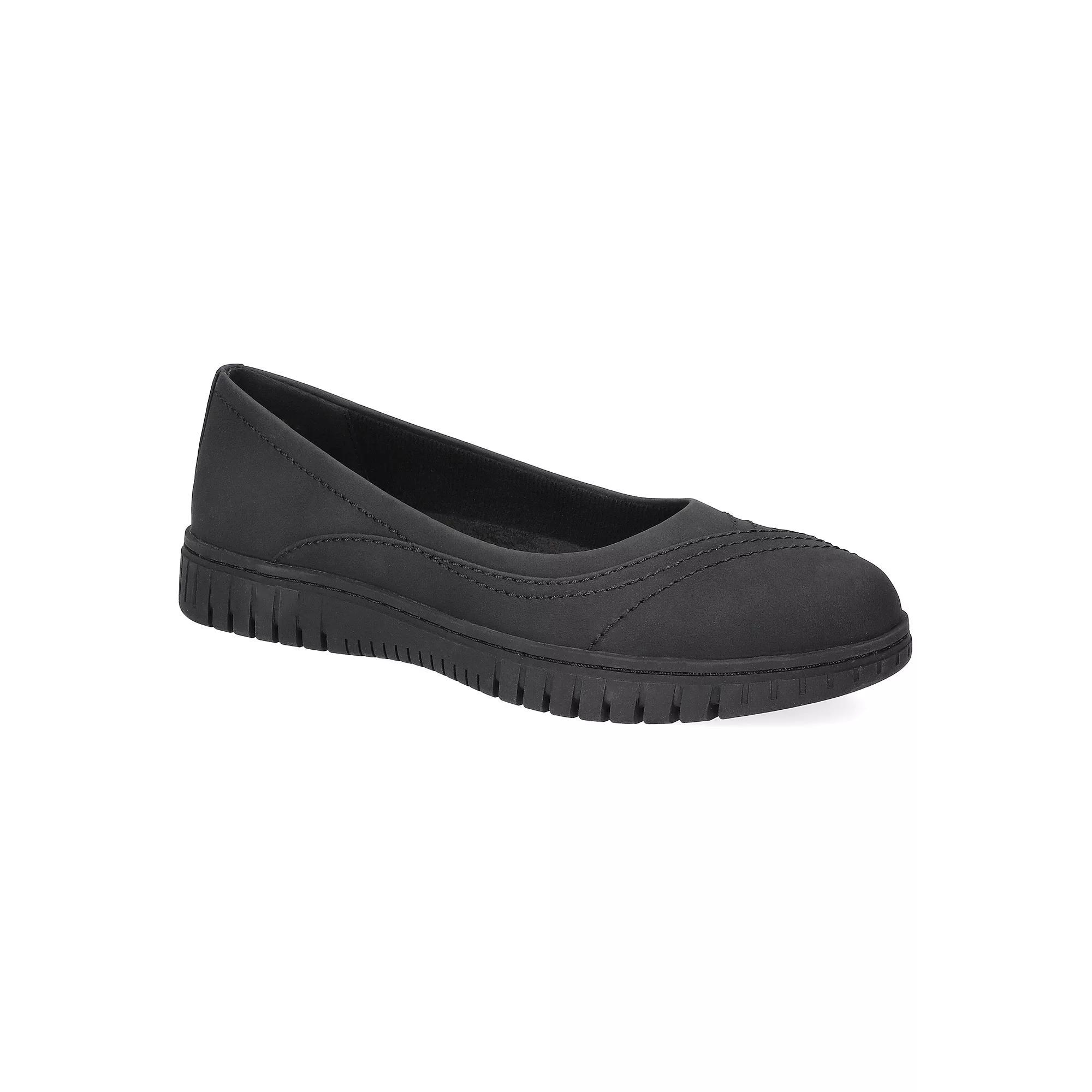 Uncover all-day comfort with the ballet inspired Cosma flat by Easy Street. The contemporary stitch detailing adds a touch of sophistication, making it the perfect companion for all your favorite casual outfits. Featuring, a new super flexible and lightweight Comfort Wave construction that moves in every direction and enhanced with a removable Easy Motion by Easy Street ultra-light insoles for the ultimate comfort experience. Click this FOOTWEAR GUIDE to find the perfect fit and more! - https://www.kohls.com/feature/shoesizeguide.jsp. FEATURES: Removable insole. DETAILS: Synthetic upper, Fabric lining, Rubber outsole, Round toe, Slip-on, Foam footbed, Heel height: 1 in., Spot clean, Imported. Size: 8.5. Color: Black. Gender: female. Age Group: adult.