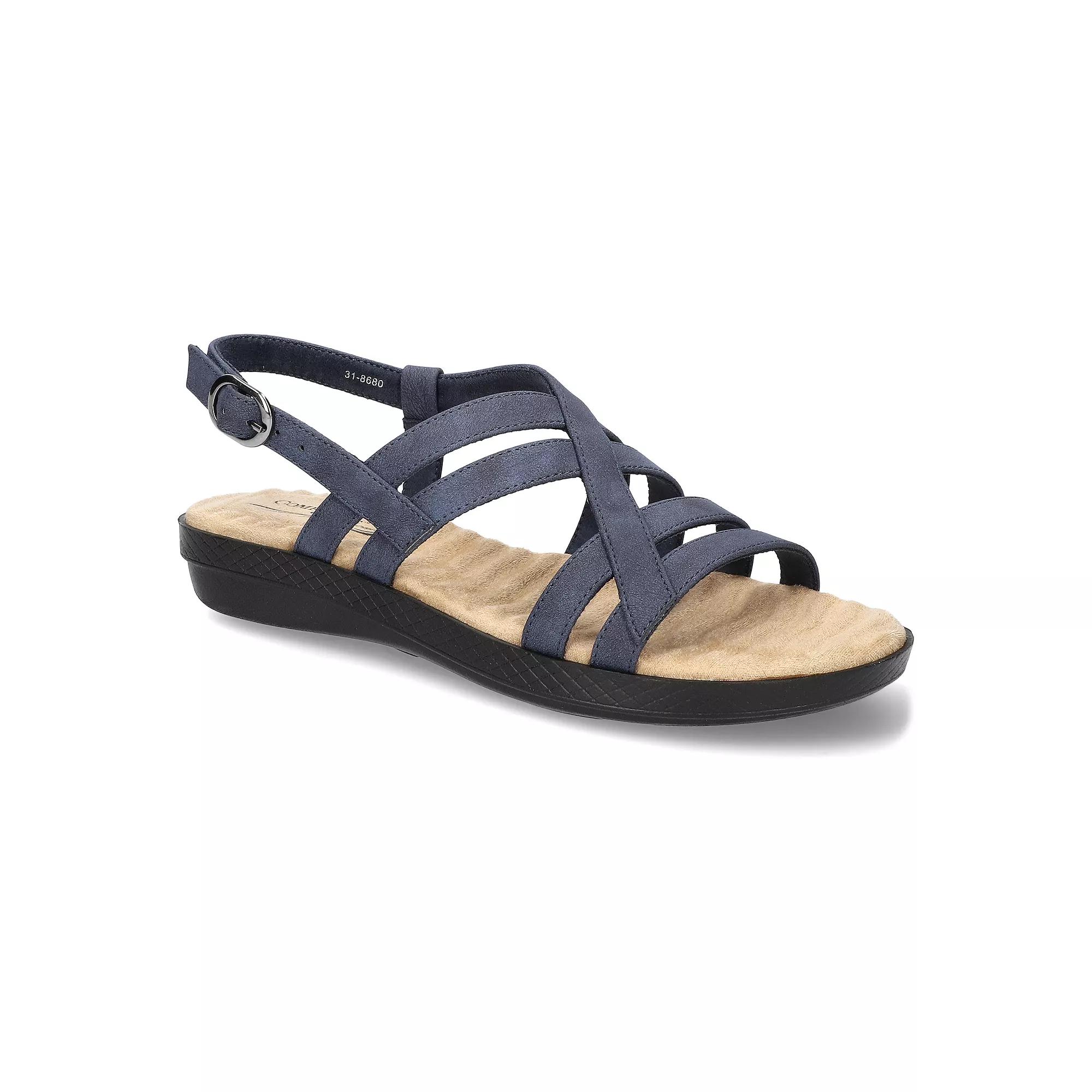These on-trend Easy Street Lobo strappy slingback sandals are perfect for spring and summer. Click this FOOTWEAR GUIDE to find the perfect fit and more! These on-trend Easy Street Lobo strappy slingback sandals are perfect for spring and summer. Click this FOOTWEAR GUIDE to find the perfect fit and more! FEATURES Lightweight and flexible design Foam footbed for all day comfort Ankle buckle closure for a secure fitDETAILS Synthetic upper and outsole Fabric lining Open toe Buckle closure Foam footbed 1-in. heel height Spot clean Imported Size: 8.5. Color: Navy. Gender: female. Age Group: adult.