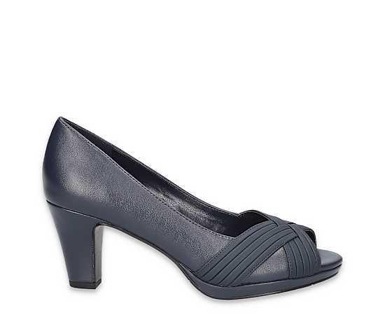 Easy Street Lavish Women's Pump Dress elegantly on-trend in the Lavish Pump from Easy Street. With a faux leather upper featuring a multi-material strip overlay, this peep-toed Shoe is perfect for a special evening. The insole cushions, while the block heel offer just enough stable lift. Synthetic upper Slip-On Padded insoleSlight platform2 block heel