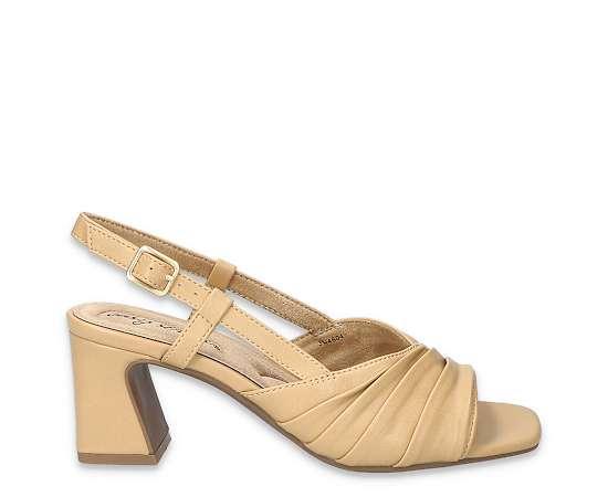 Easy Street Lucie Women's Sandal BeigeComplete your warm weather look with the Easy Street Lucie Sandal. With a ruched faux leather upper , this Shoe is all things trendy. The pillowy footbed cushions your steps, while the block heel gives the perfect lift. Synthetic upper Buckle strap closure Pillow foam footbedSynthetic outsole2 block heel