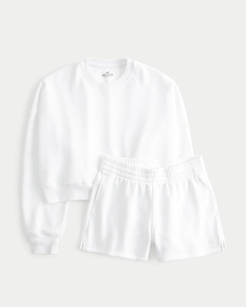 Includes a super soft fleece sweatshirt designed with an easy fit, crew neckline and long sleeves, plus fleece shorts with a banded waist and pockets.