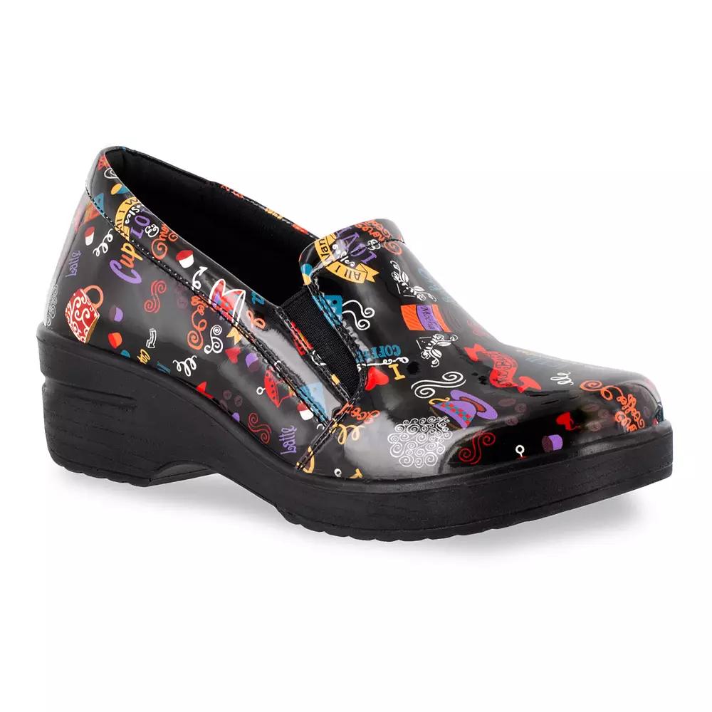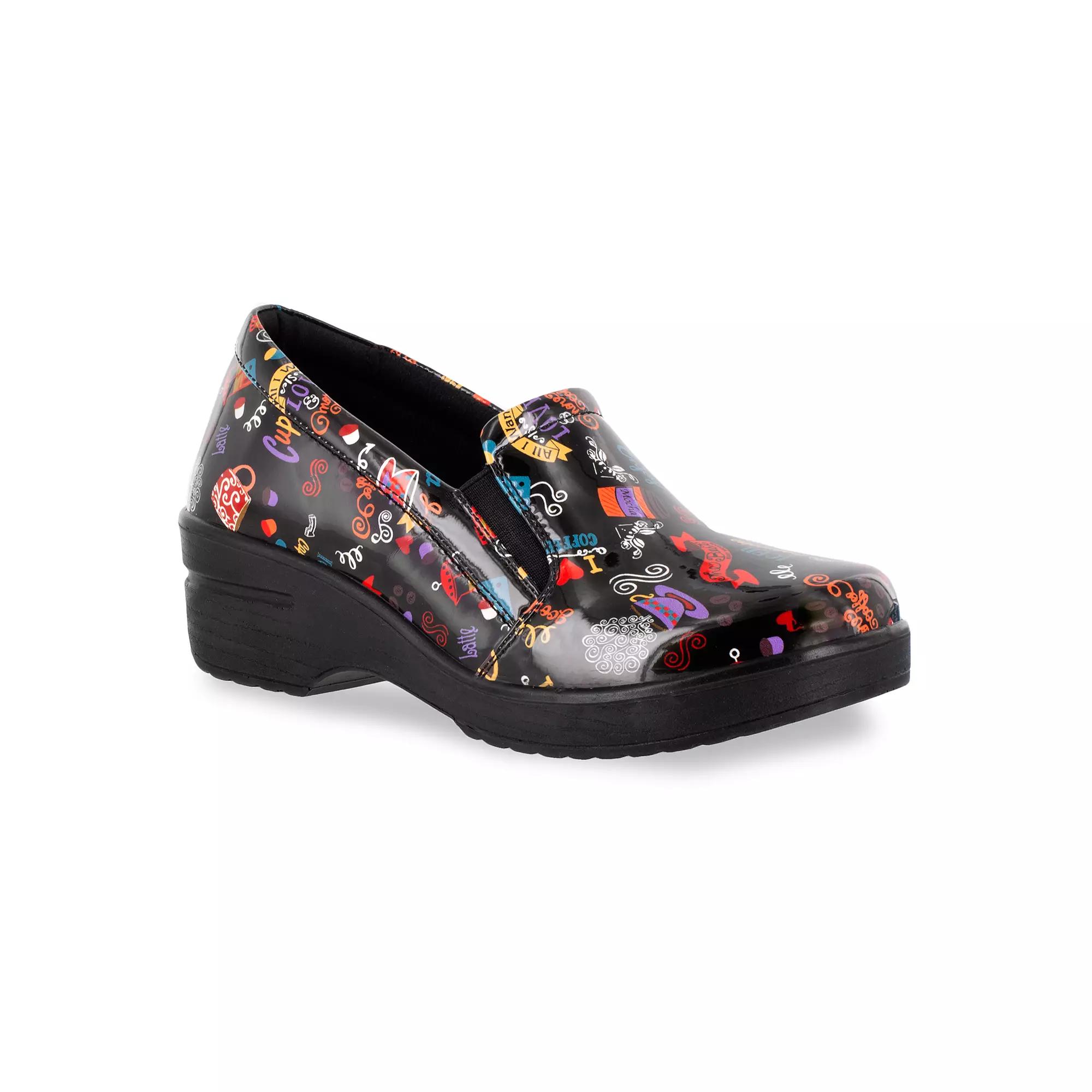 Keep your feet comfortable with these womens Easy Works by Easy Street work clogs. Click this FOOTWEAR GUIDE to find the perfect fit and more! SHOE FEATURES Removable insole Treaded sole Side elastic goring Generous toe box Easy-to-clean upper Slip-resistant outsole Heel has broad striking surface EasyMotion Technology provides premium foam insole with antimicrobial lining & arch support SHOE CONSTRUCTION Synthetic upper Fabric lining Foam footbed Manmade PU outsole SHOE DETAILS Round toe Slip-on Padded footbed 2-in. heel The antimicrobial properties do not protect users or others against bacteria, viruses, germs, or other disease organisms. Size: 5. Color: Black. Gender: female. Age Group: adult.