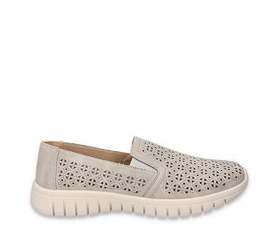 Easy Works Mosaic Women's Slip-On Sneaker GreyWear a unique, yet simple look with the Mosaic Slip-On Sneaker from Easy Works by Easy Street. Featuring a perforated upper with twin goring, this athleisure Shoe also has embossed detailing. WThe removable footbed is anti-microbial with arch support built-in, while the 1 wedge adds subtle lift. Synthetic upper Slip-On Perf designEasy Motion Pro Comfort System footbedSlip-resistant outsole