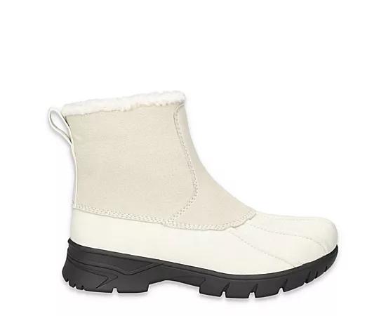 Easy Works by Easy Street Yuka Women's Duck Boot - WhiteStylish enough for everyday, but tough enough for the elements: the Easy Works by Easy Street Yuka women's duck Boot. Featuring a mixed material upper with a waterproof inner shell, this inside zip Boot has warm faux fur around the collar. The Easy Motion insole is removable and contoured to cradle your foot, while the slip-resistant sole keeps you steady on a low 1 heel. Synthetic upper Inside zip closure Faux fur trimEasy Motion insole Rubber traction outsole