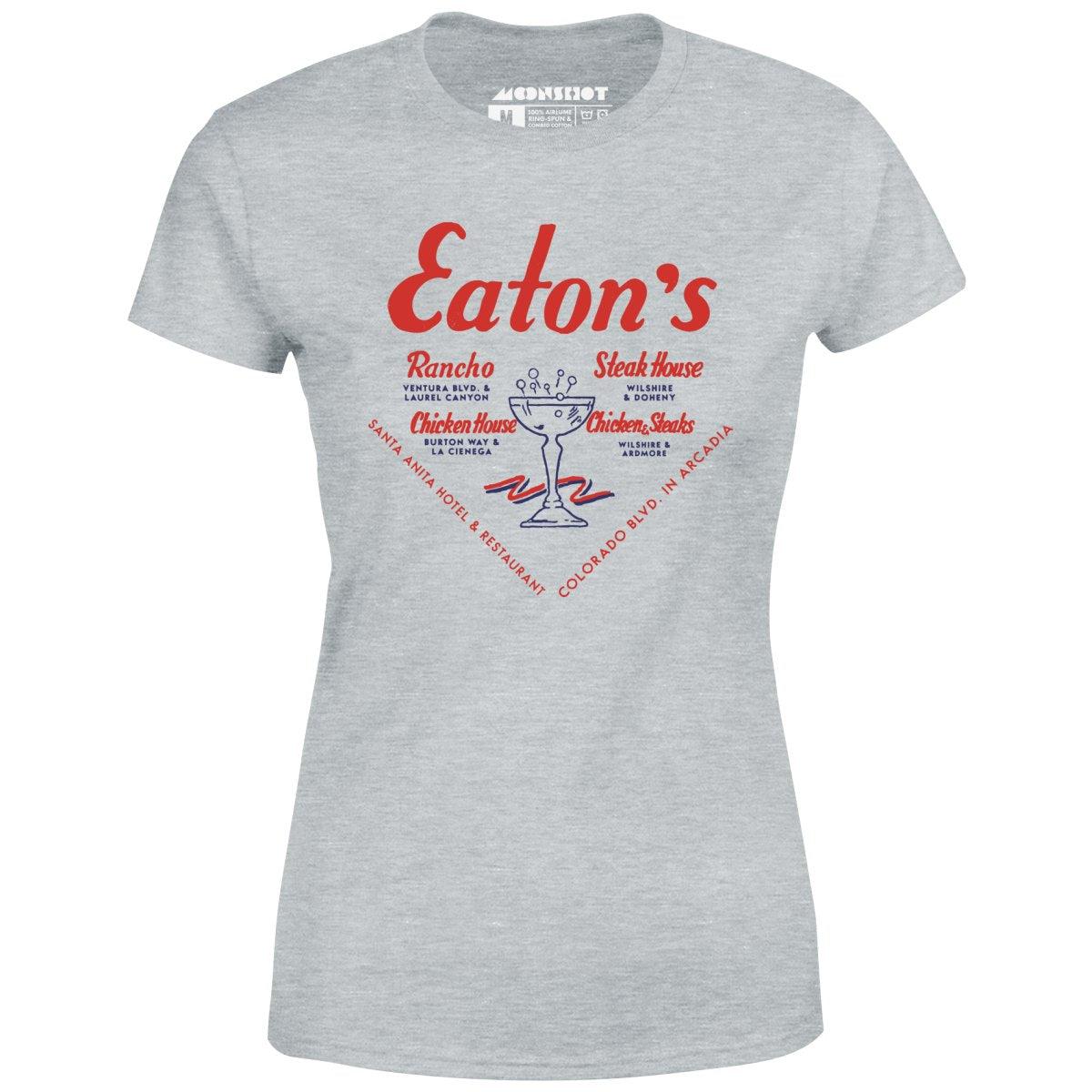 Eaton's Restaurant was located inside their Santa Anita Hotel on Colorado Blvd. in Arcadia, California. They also had a chain of restaurants in and around Los Angeles, California. Including Eaton's Rancho on Ventura Blvd. & Laurel Canyon, Eaton's Steak House on Wilshire & Doheny, Eaton's Chicken House on Burton Way & La Cienega and Eaton's Chicken & Steaks on Wilshire & Ardmore. This retro design is part of our collection featuring the old school vintage American restaurants, diners and coffee shops of yesteryear. Printed on our super soft 100% ringspun & combed cotton women's T-Shirt. Or upgrade to our Luxury 52/48 cotton/poly vintage heather edition for an even softer classic look. We print & ship all of our high quality graphic tees in the USA.