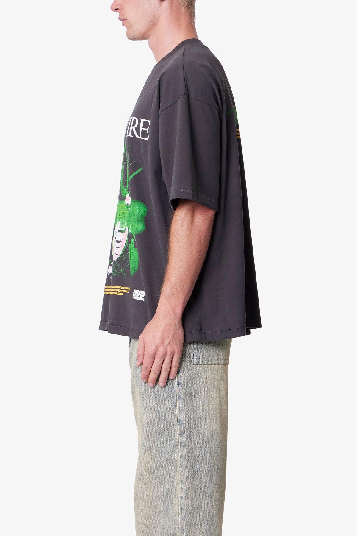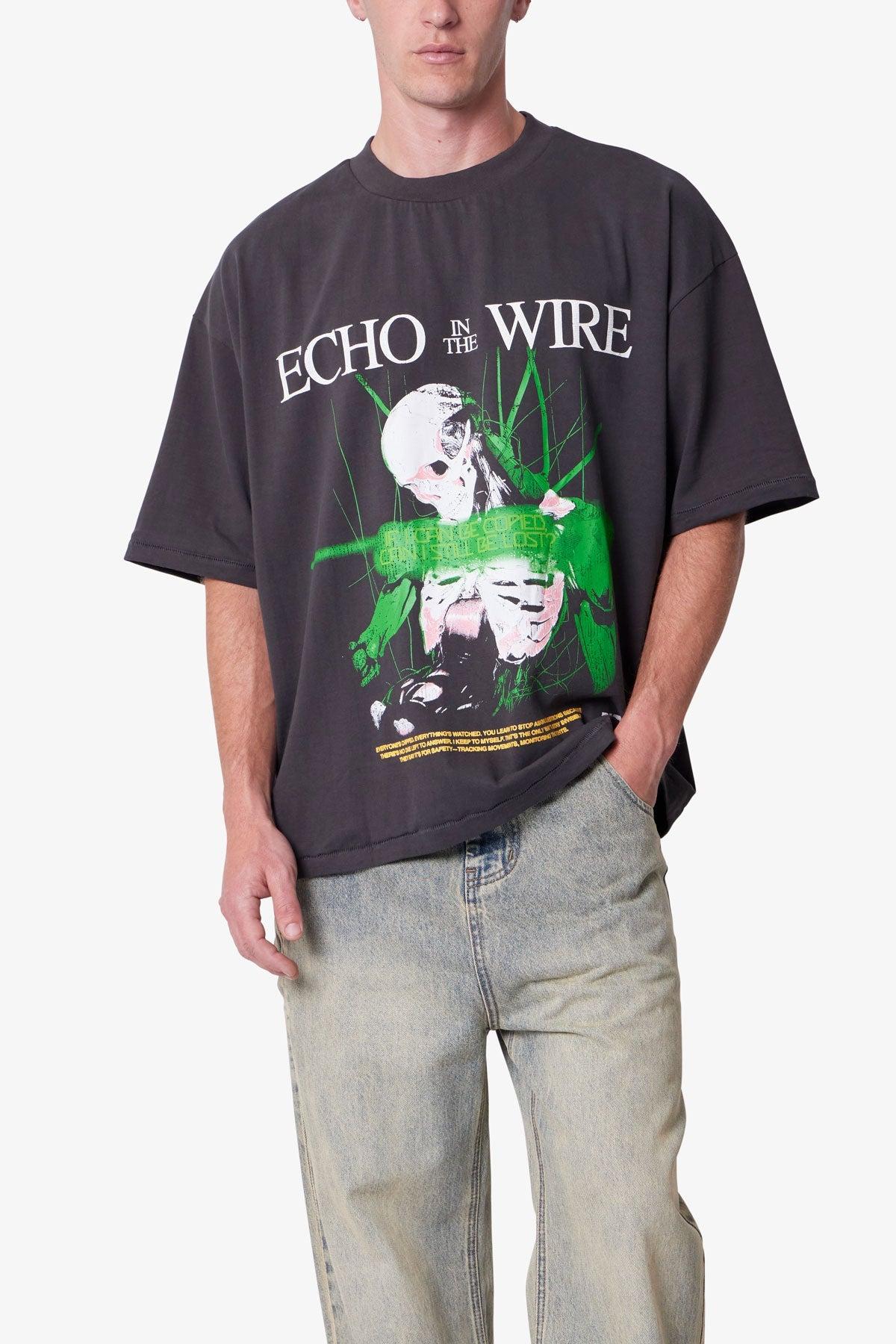 Constructed from 300 gsm cotton jersey with a pigment dye finish, the Echo Tee features a boxy silhouette with a slightly wider fit than a standard tee. Designed with front and back screen printed graphics, including distressed detailing for a worn vintage effect. Finished with a standard neck rib and sleeve hem. detai