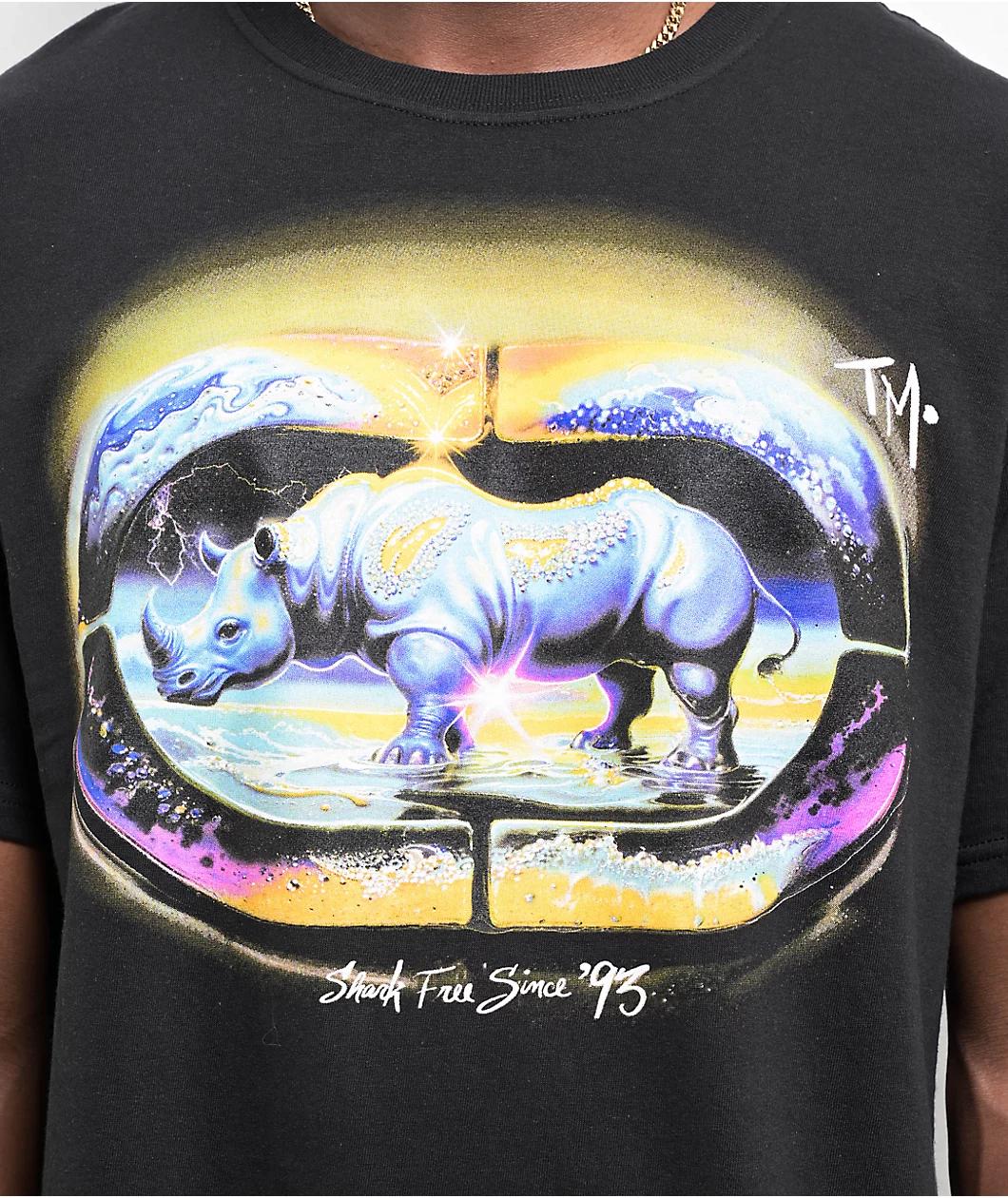 Add a colorful neon touch to any casual outfit with the Shark Free t-shirt from Ecko. Maximalist graphics of a rhino on the beach decorate both sides of the washed black tee, with text reading "Shark Free since '93" adding a funny touch. The back rhi