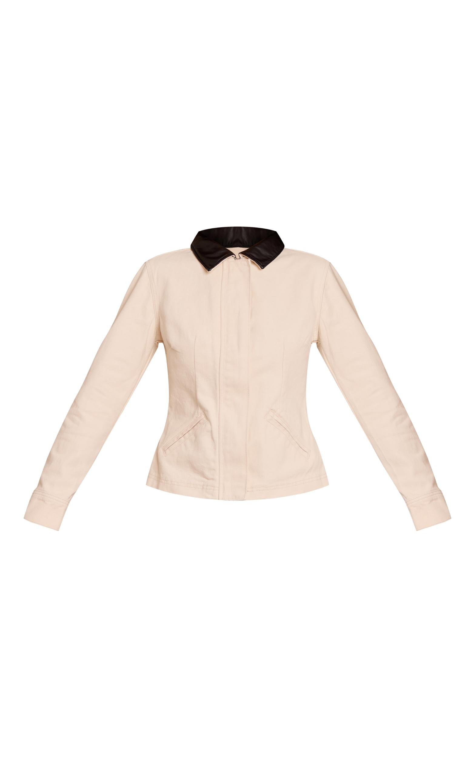 Denim, elevated. The ecru contrast cord collar cinched denim jacket redefines classic outerwear with an artful edge. This stone-hued piece makes a knowing statement with its sharp black cord collar, while a flattering cinched waist defines the silhouette, complemented by a concealed placket and precise contrast stitching along the tailored sleeves and angled flap pockets. Elevate this essential with tailored wide-leg pants and sleek closed toe heels for a look that commands attention without effort. Finish with delicate stud earrings to complete an ensemble that is undeniably confident and utterly self-aware.Length approx 48.5cm/19inch (Based on sample size US 4)Model wears size UK 8/ EU 36/ AUS 8/ US 4Model Height - 5ft 9inchp]:!mb-4inch>Brand: PrettyLittleThingCategory: DenimProduct type: Cropped Denim JacketColor: Ecru.Material: Rigid DenimOccasion: Day