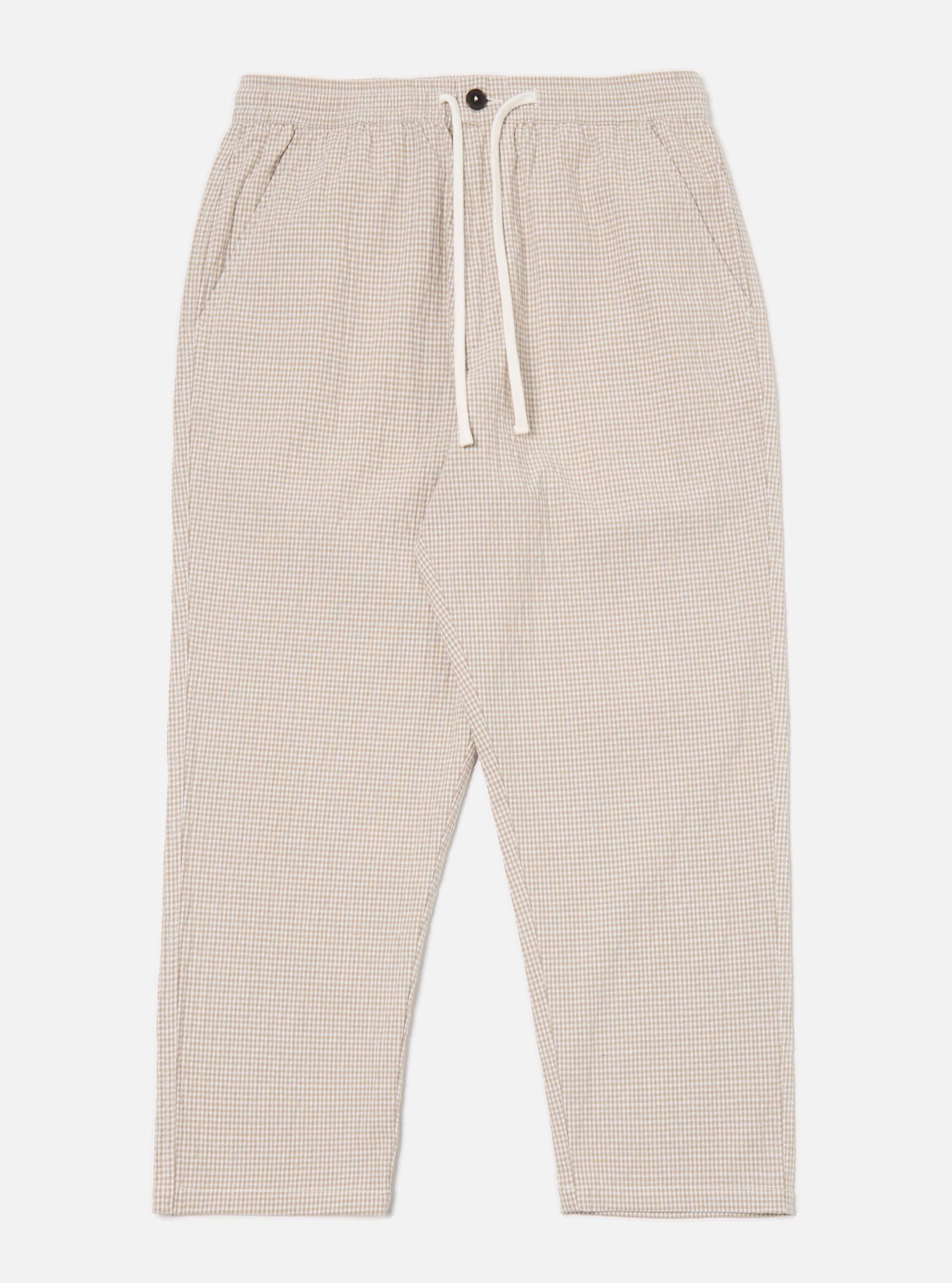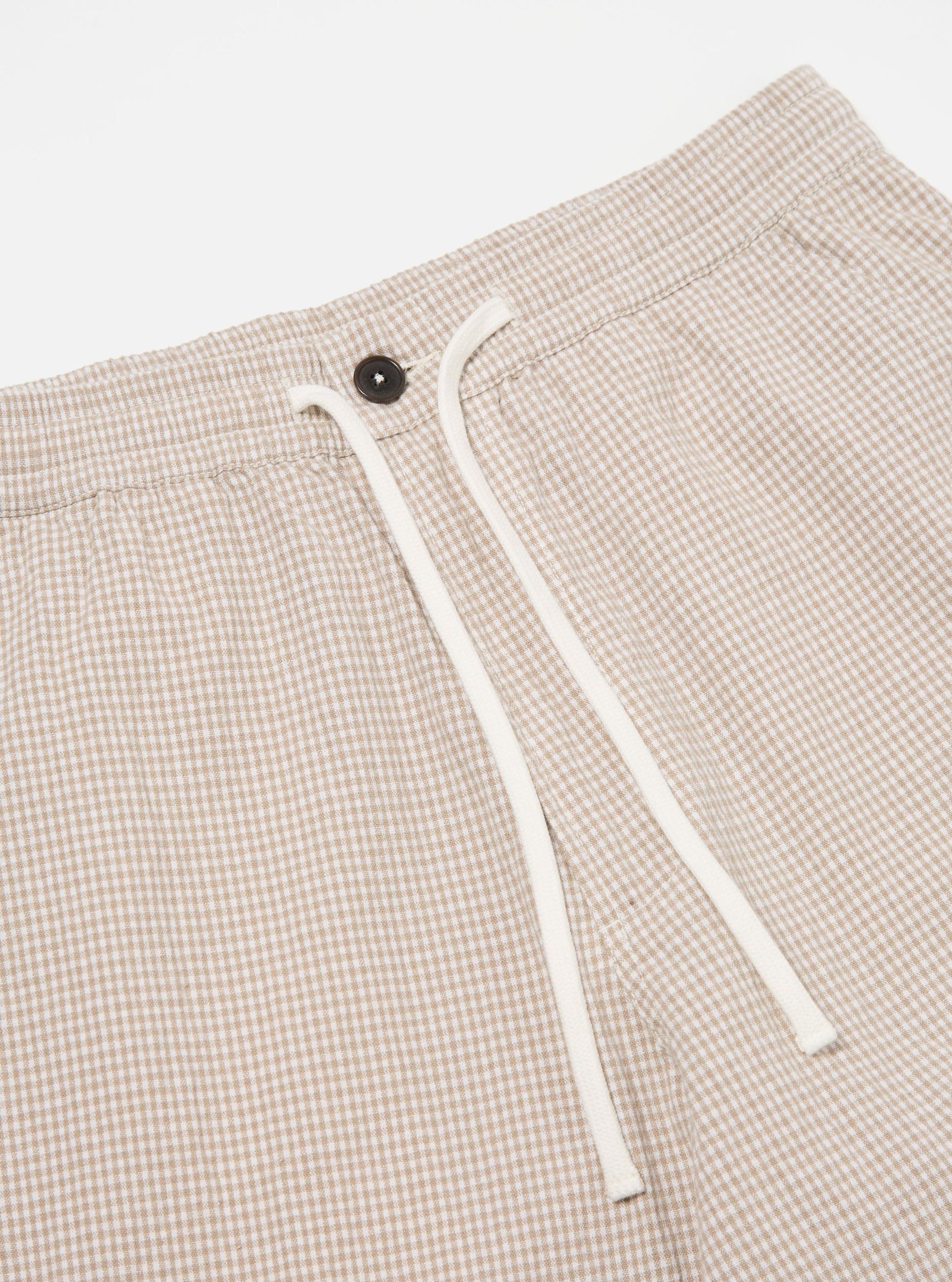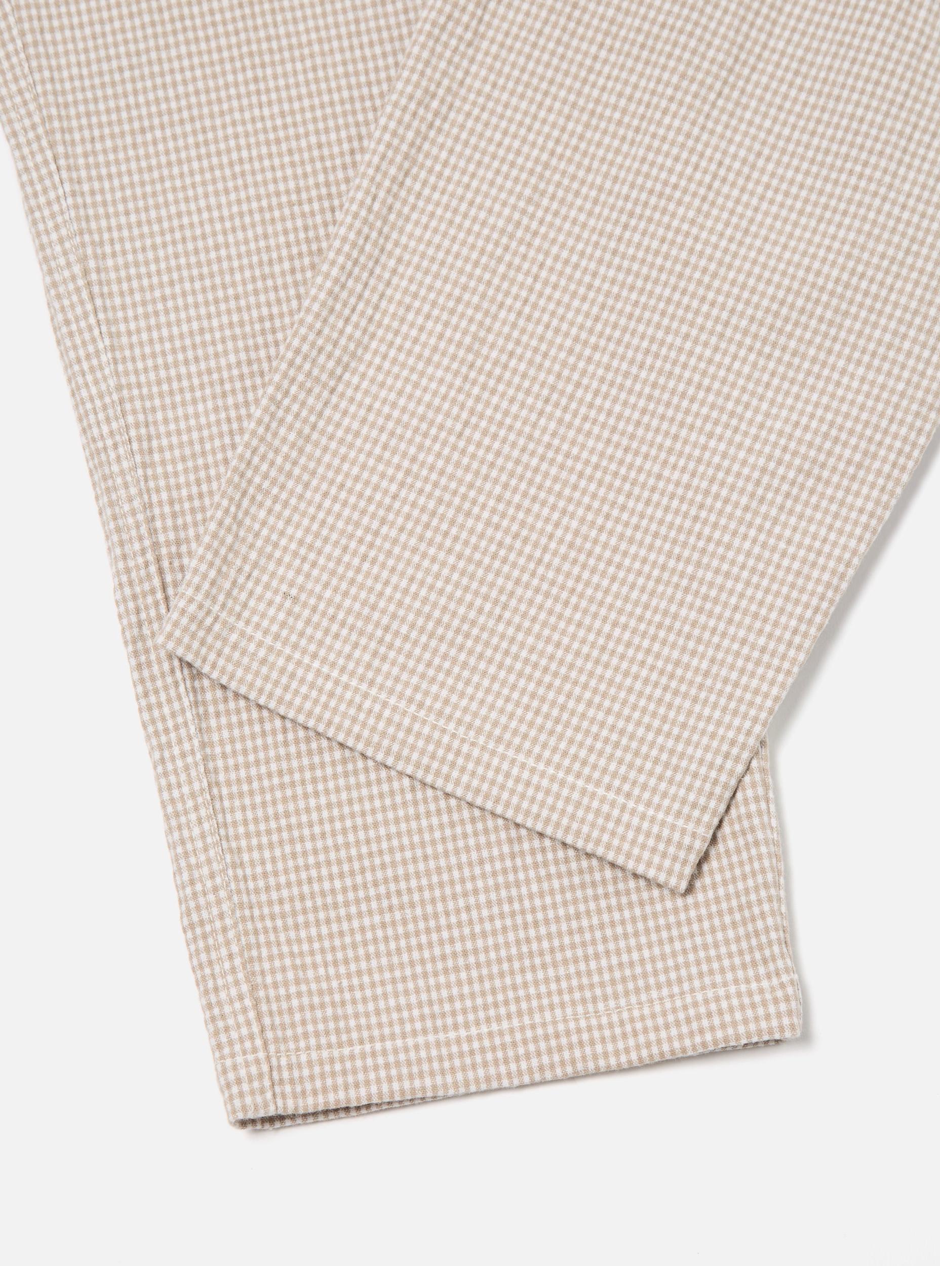 A slightly cropped trouser, handy for avoiding getting wet at high tide. Designed to sit above the ankle, these pants have a loose, super casual fit. Our model is 6' 0'' with a 32’ Waist and is wearing a size ‘32.’ A simply woven, airy fabric in a blend of upcycled fibres with a seersucker effect and a dry hand feel. Made in this two-colour small check, or our plain navy Ospina Cotton. • Drawcord adjustable waist. • Slightly cropped leg length. • Two slanted hand pockets. • Two back patch pockets. • Fabric Content: 65% Recycled Cotton, 25% Recycled Polyester, 5% Viscose, 4% Other Fibres, 1% Elastane. Trim: 100% Cotton. • Washcare: Do not machine wash. Do not bleach. Do not tumble dry. Warm iron. Dry clean only. Do not iron decoration. • Please be aware that the measurements above are technical measurements that are based on the garment laid flat and are useful as a general guide only. Measured in Centimetres. 26 28 30 32 34 36 38 Outside Leg Including Waistband. 91.5 91.5 91.5 94.5 98.5 101.5 101.5 Waist. 32 34.5 37 39.5 42 44.5 47 Thigh - 2.5cm Below Crotch. 31 32.5 34 35.5 37 38.5 40 Hem Opening Width. 18.5 18.5 18.5 19.5 20.5 21.5 22.5 Front Rise Including Waistband. 31.5 32.5 33.5 34.5 35.5 36.5 37.5 Back Rise Including Waistband. 38 39 40 41 42 43 44