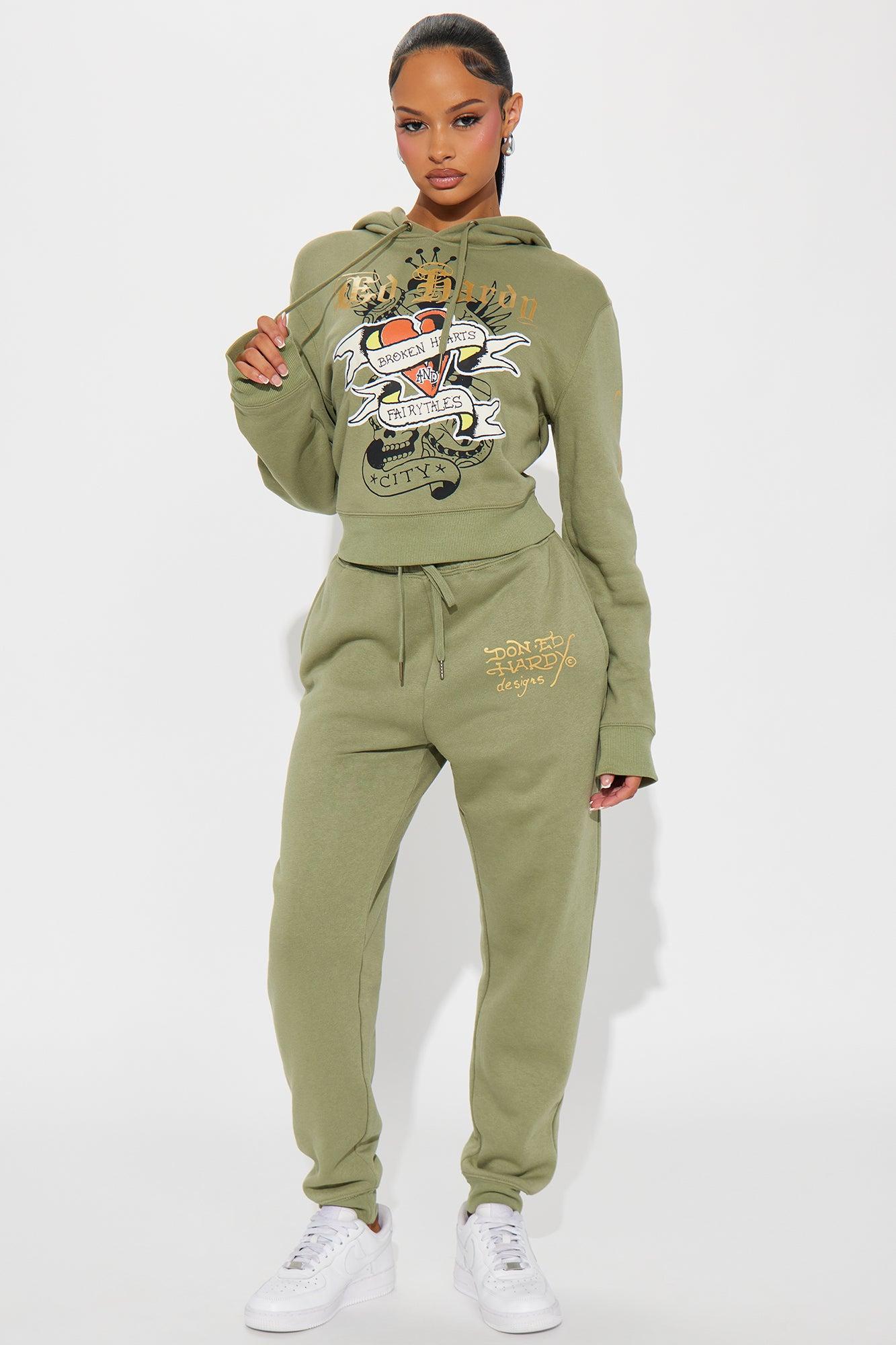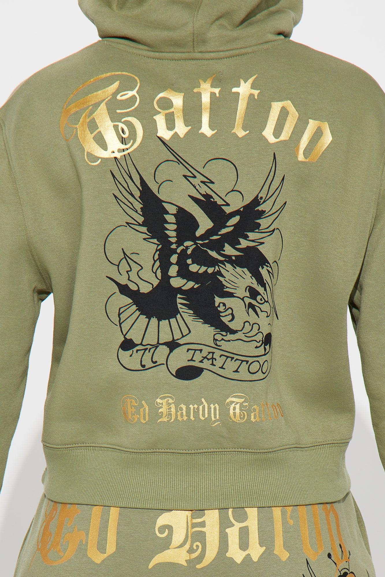 Available In Sage. Long Sleeve Hood With Drawstring Ed Hardy Graphic Front, Back and Sleeve Screen Stretch Pair To "Ed Hardy Broken Hearts Jogger" 55% Cotton 45% Polyester Imported