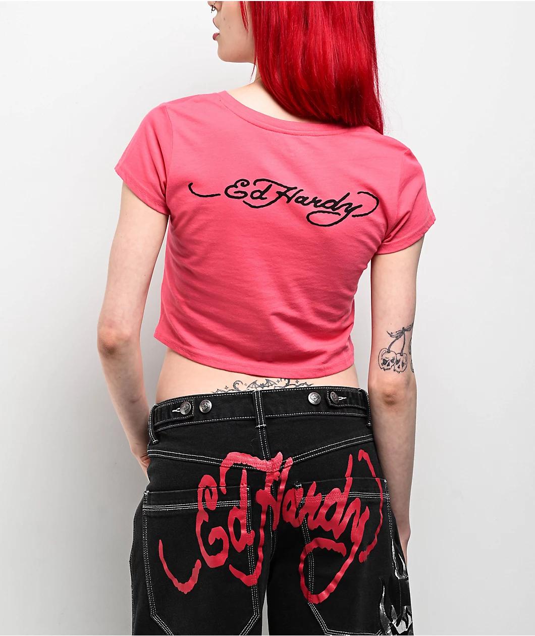 Available from Ed Hardy in a hot pink cotton blend, the Cherry t-shirt is presented in a flattering cropped silhouette with printed graphics on the front and back. Boasting a traditional tattoo-style image of a Cherry on the chest, the back of the sh