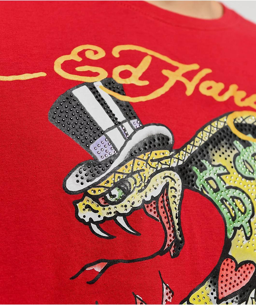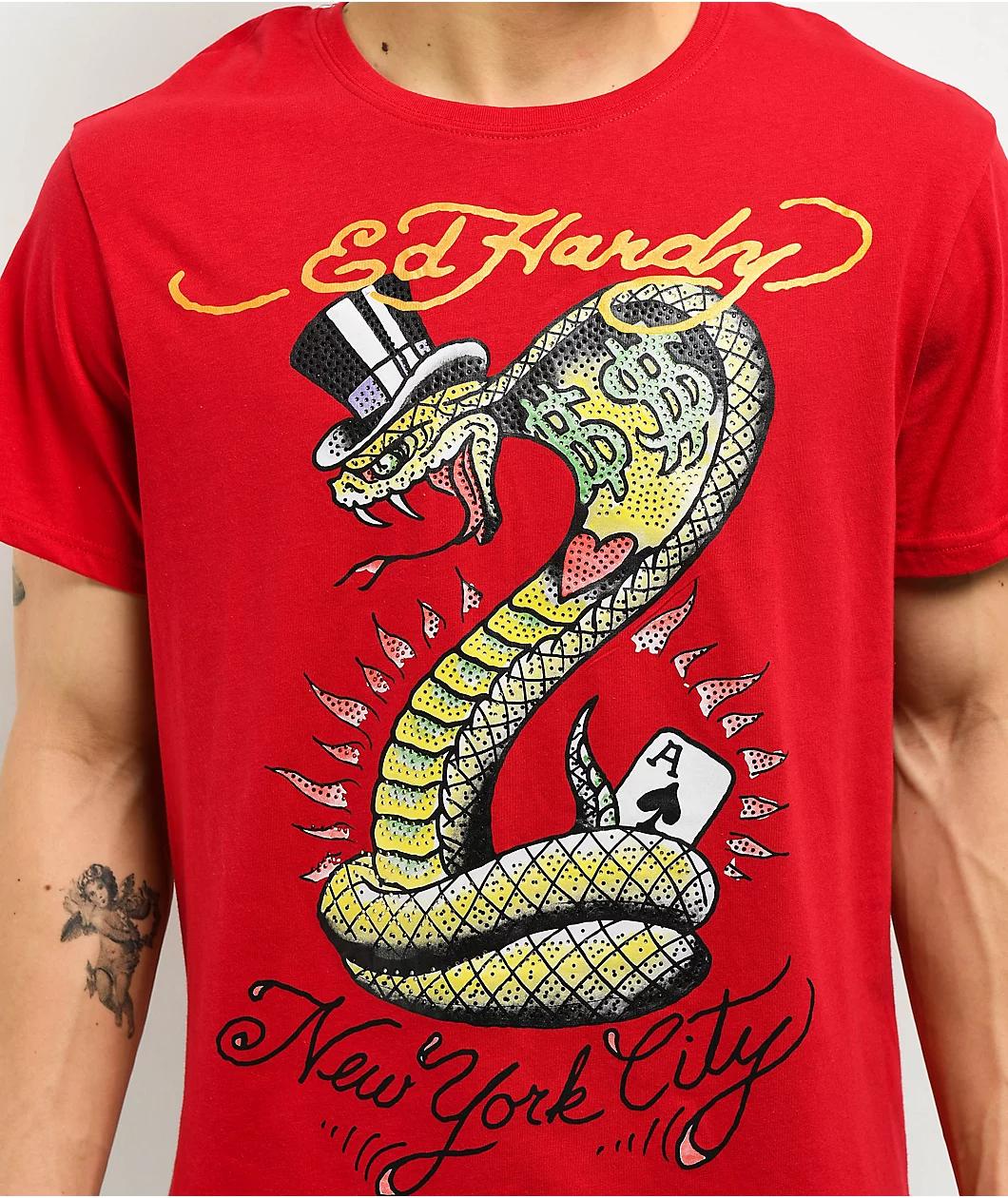 Add a high roller vibe to any outfit with the Cobra t-shirt from Ed Hardy, landing in a brilliant red colorway and featuring Rhinestone embellishments across the front. Classic tattoo artwork on front of a snake with the ace of spaces clutched in its