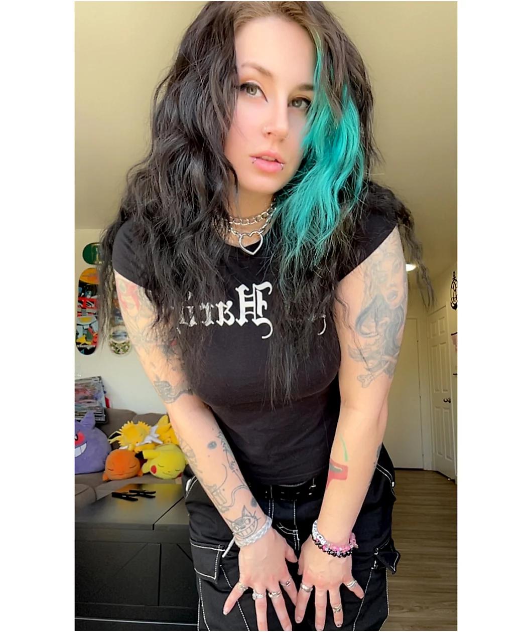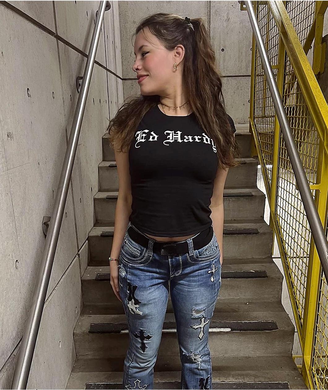 Add Y2K style to your outfit with the Cross Heart black t-shirt from Ed Hardy. This slim-fitting shirt has capped sleeves and is adorned with bold branding across the chest in an Old English font. Screen-printed on the back of the tee is traditional tatto