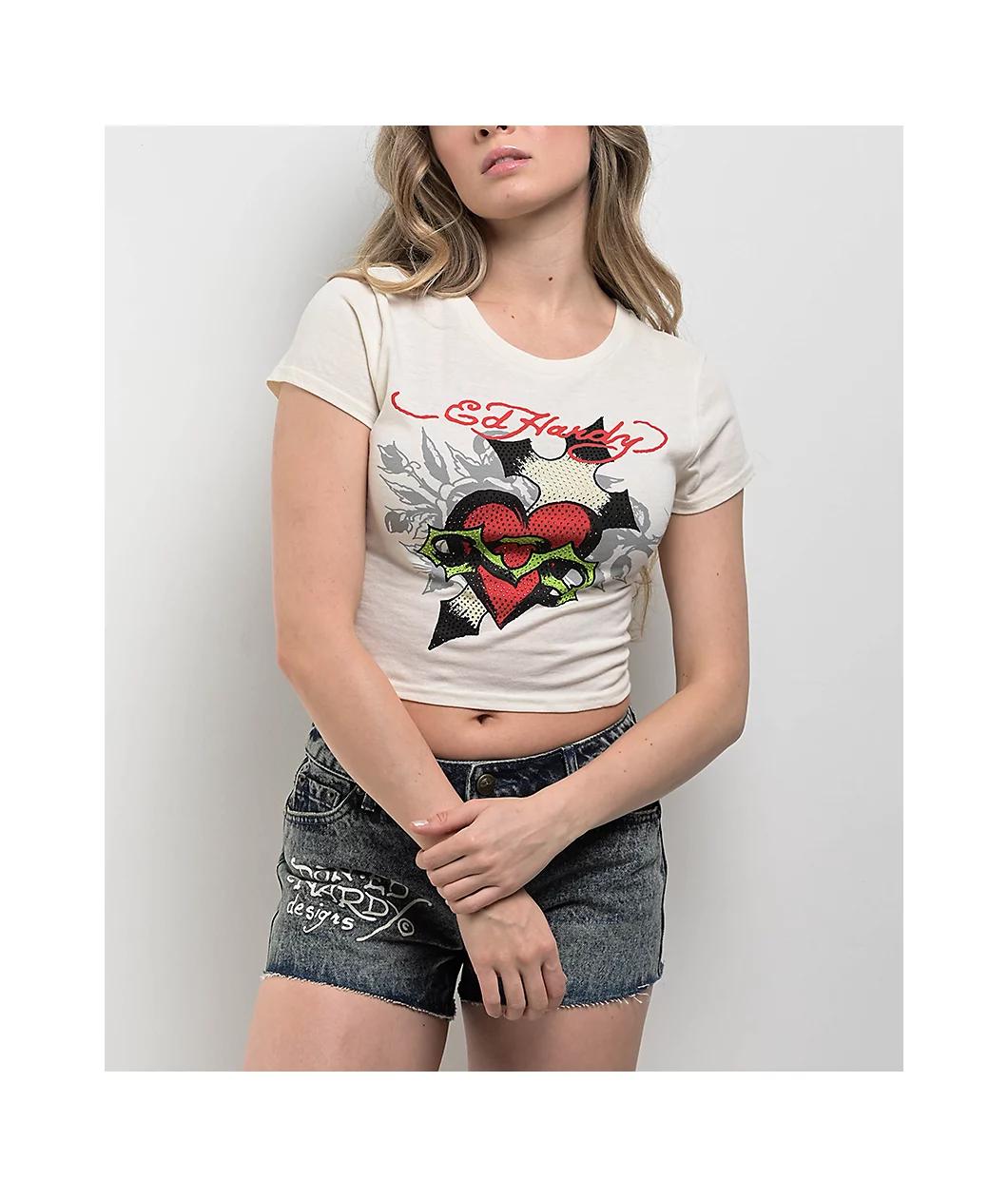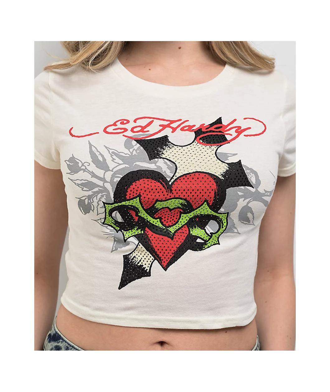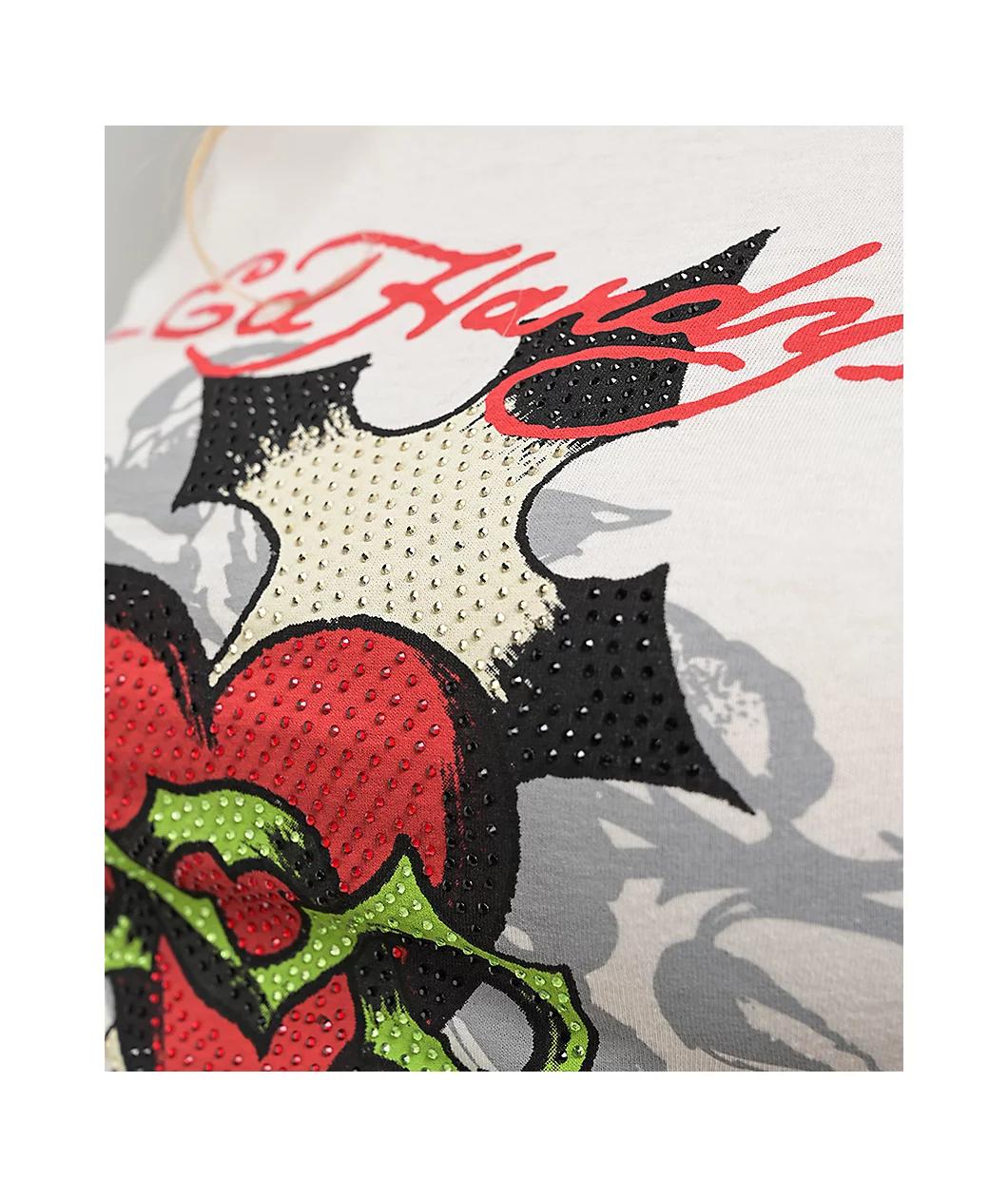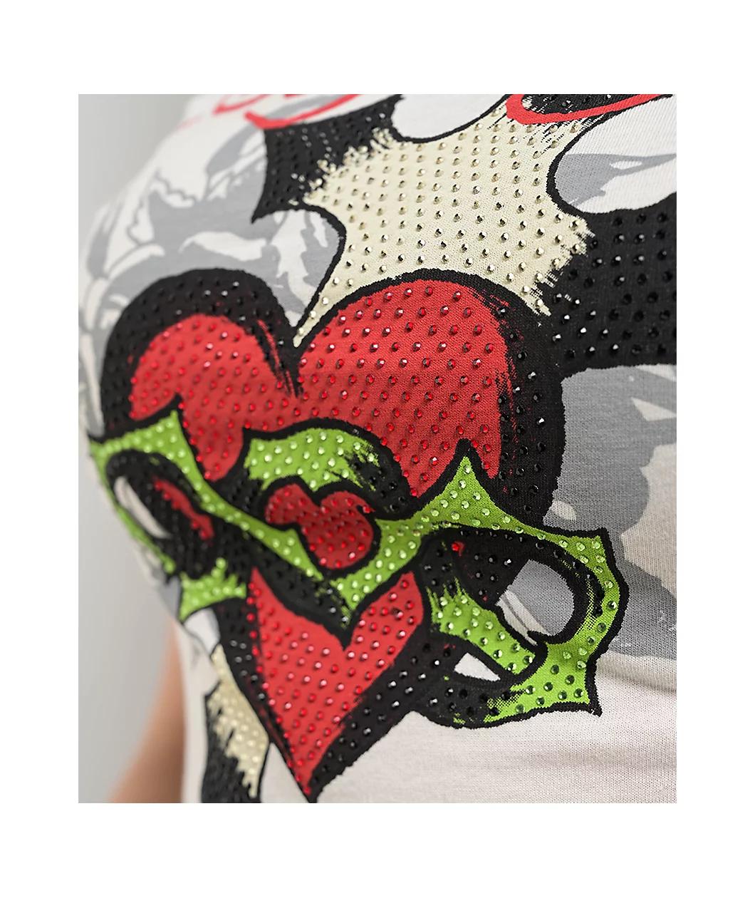 Landing in an "Ivory" white colorway, the Cross Heart crop t-shirt from Ed Hardy features vintage tattoo art with rhinestone embellishments across the chest for eye-catching sparkle. The red, green, and silver stones highlight the classic, edgy desig