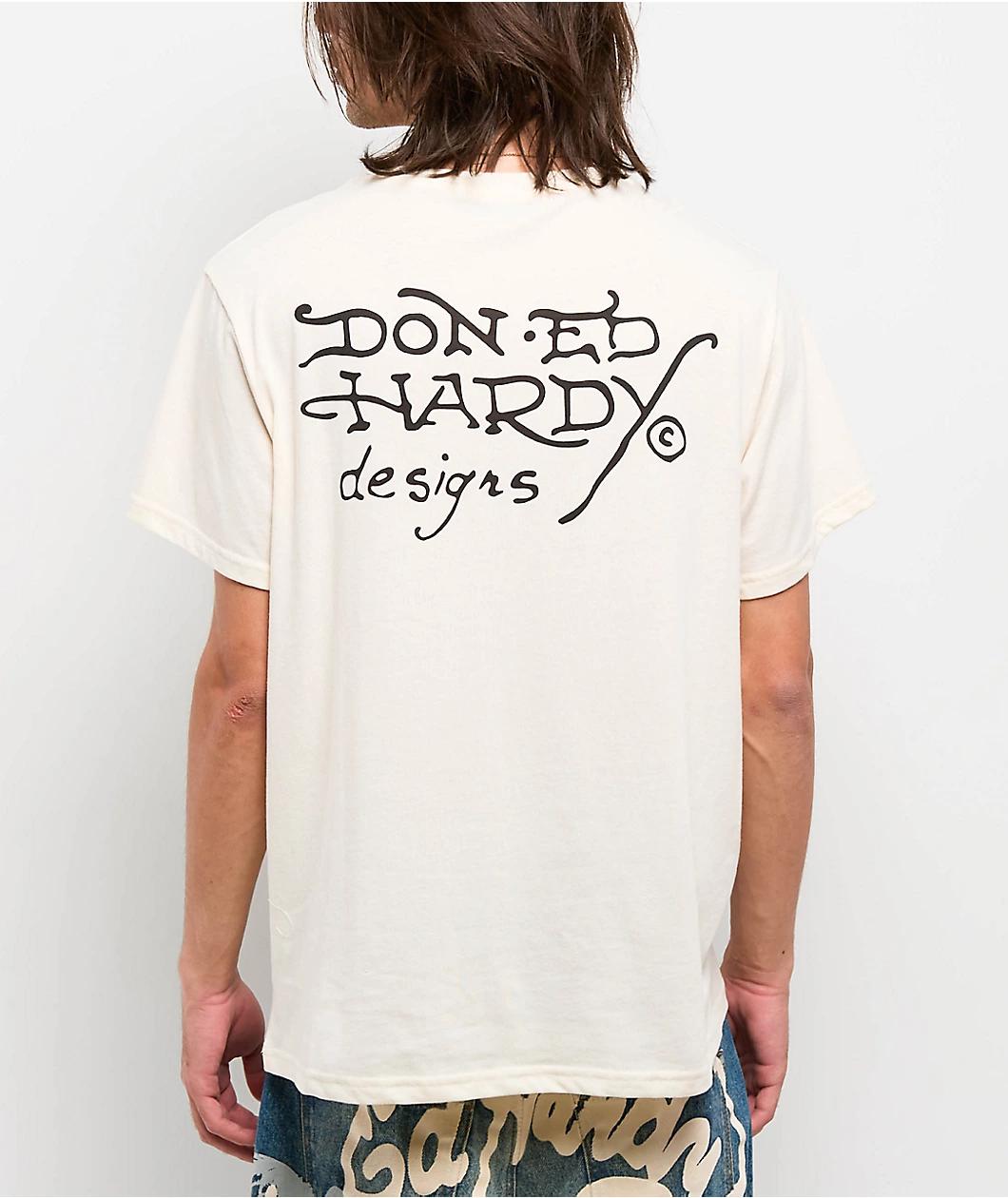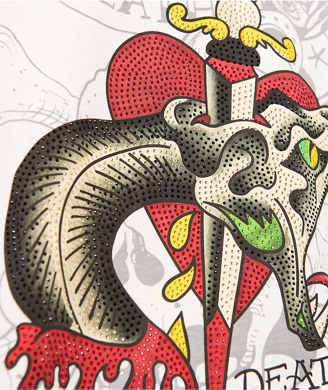 The Dagger Snake t-shirt by Ed Hardy comes in a natural cotton blend with shiny rhinestone detailing and a printed graphic on the front. Using custom Ed Hardy tattoo artwork, the shirt shows bold branding above a large rendition of a Dagger stabbing
