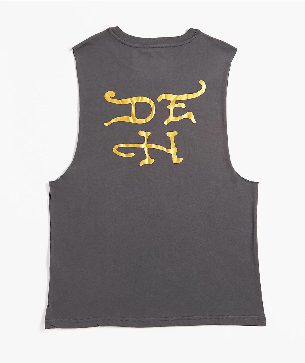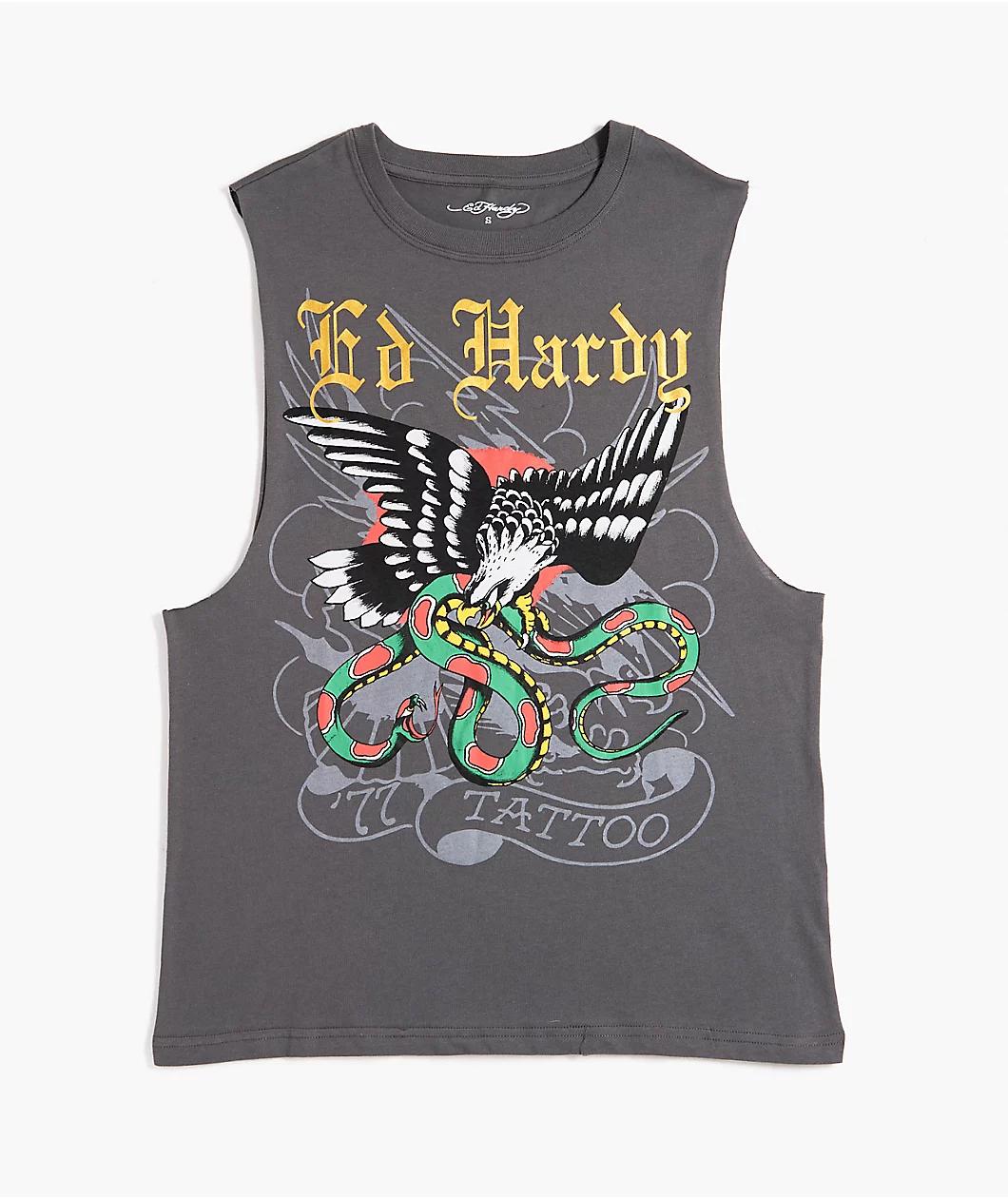 Add an Americana look to your outfit with the Ed Hardy DBD Eagle tank top in a vintage grey colorway. Printed on the front of the tee is bold Old English branding while a tattoo-inspired soaring Eagle tussling with a Snake adorns the front for an edg