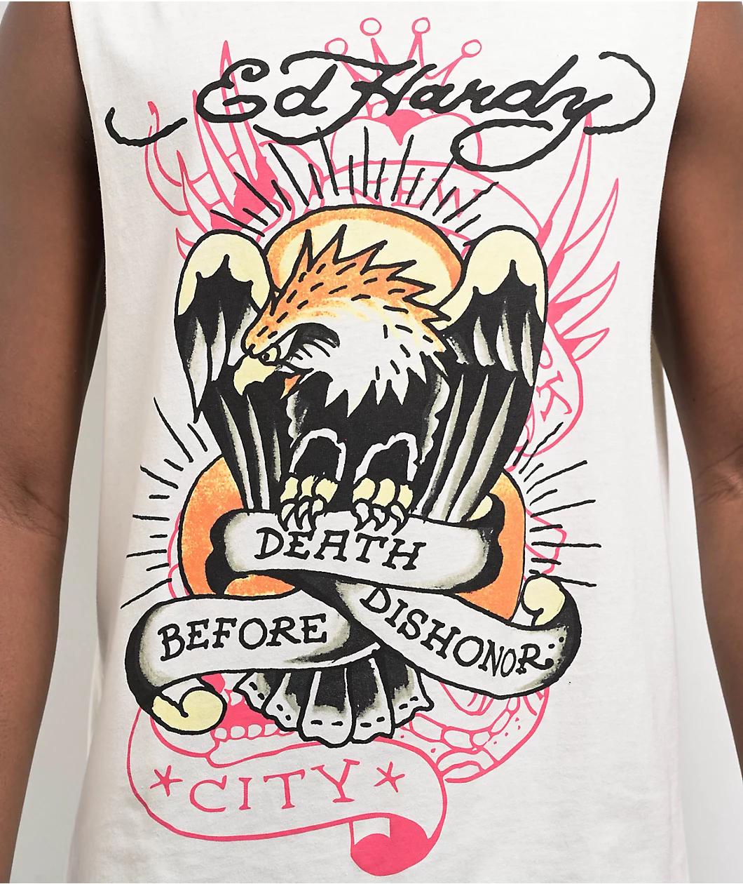 Ed Hardy presents the Death Before Dishonor Eagle tank top in an "Ivory" off-white colorway. The front of the muscle tee displays a traditional tattoo-inspired Eagle sitting on a script that reads "Death Before Dishonor" adorned with branding on the
