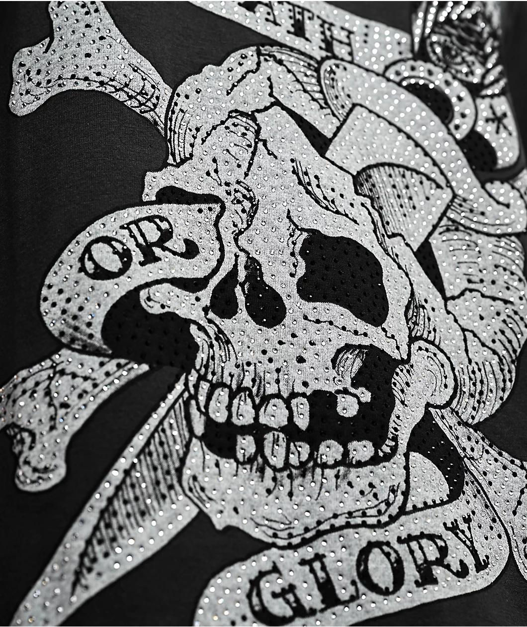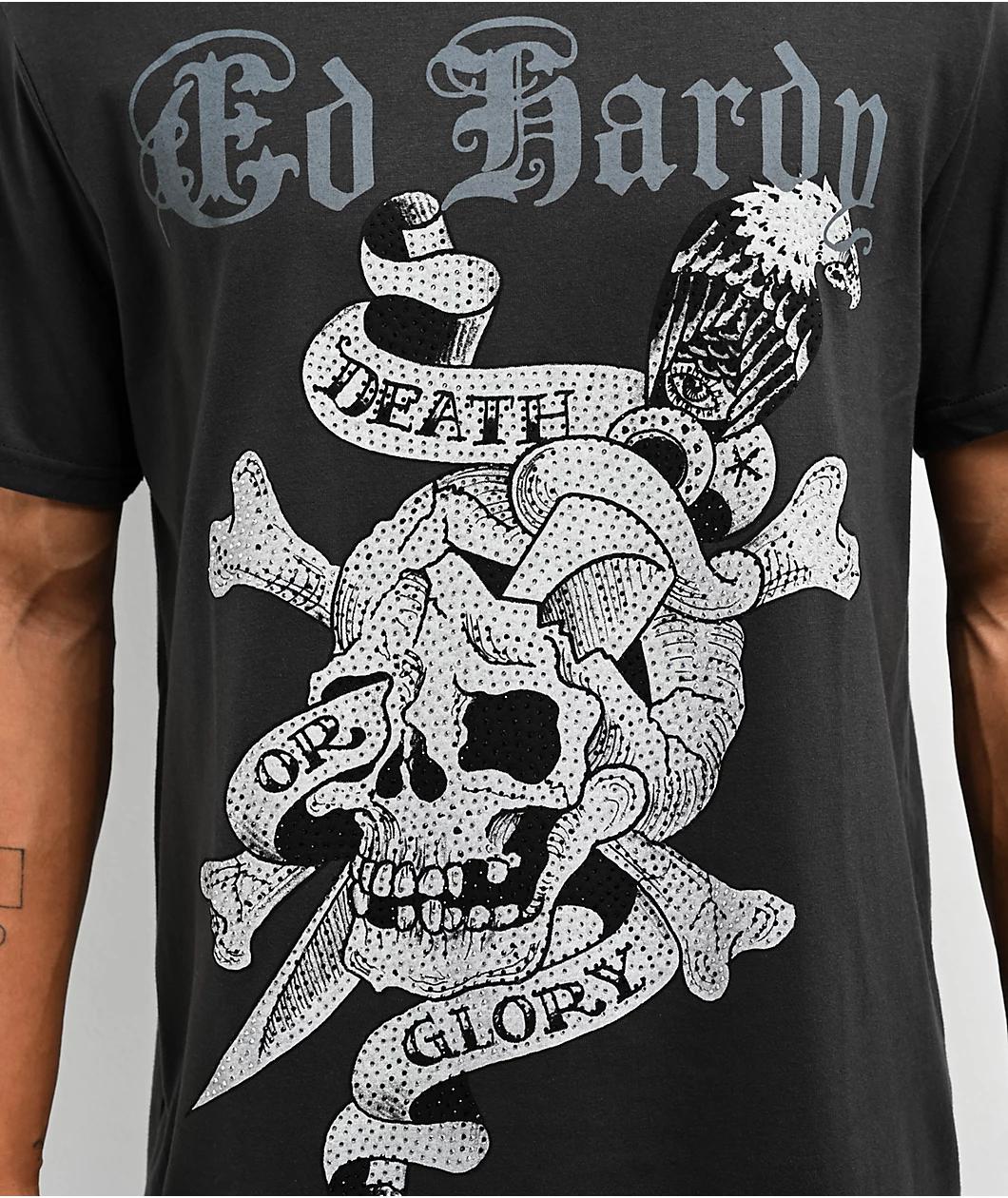 Landing in a cotton blend with a charcoal color, the Death Or Glory t-shirt arrives from Ed Hardy with ornate rhinestone detailing on the front. The lightweight short sleeve displays screen-printed graphics on the front, featuring Old English brandin