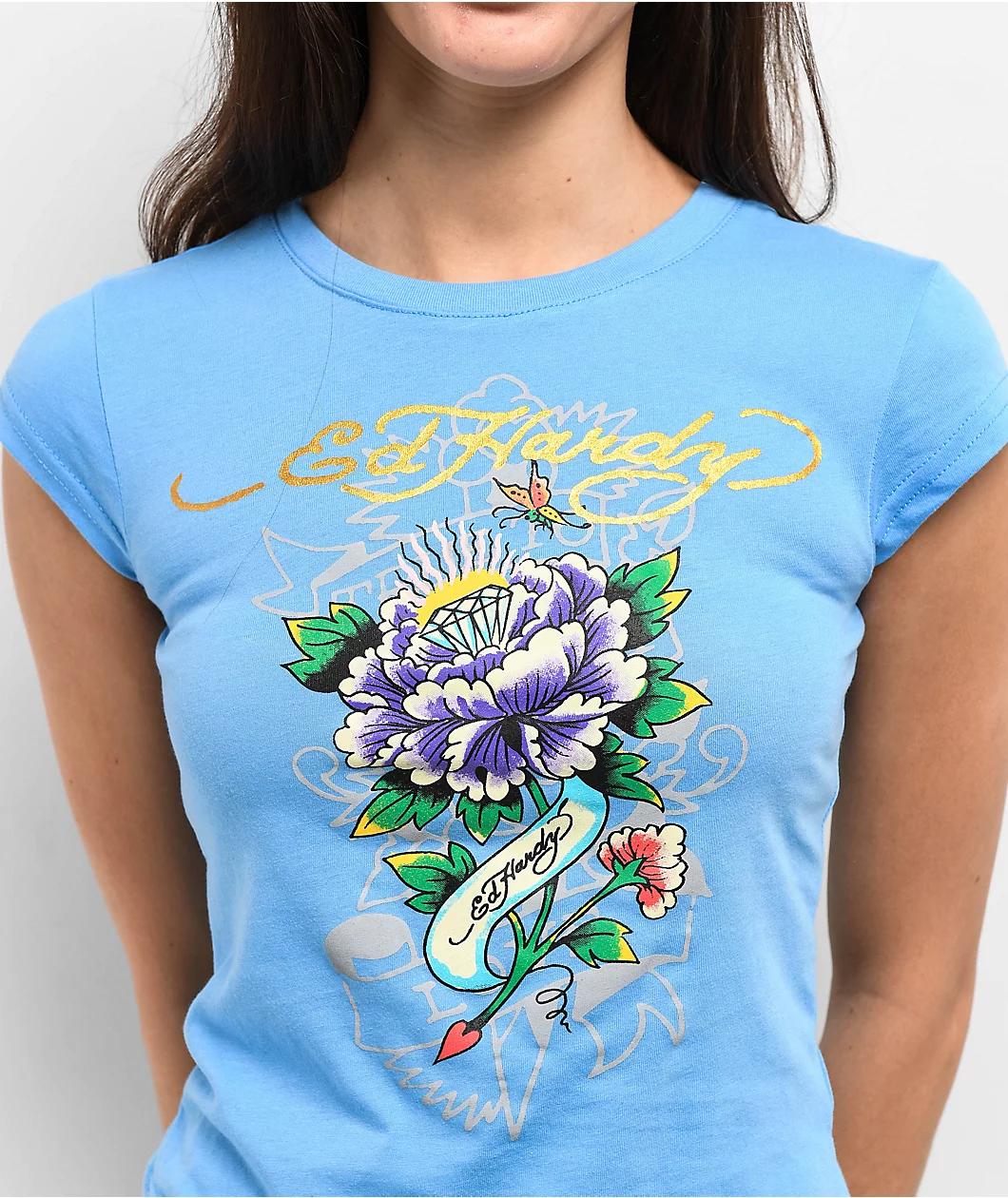 Arriving in a pastel Powder Blue, the Diamond Flower crop t-shirt from Ed Hardy adds a Y2K feel to any outfit. The crop top features delicate cap sleeves, as well as vintage tattoo artwork of a Flower with a Diamond at its center on the front. Gold br