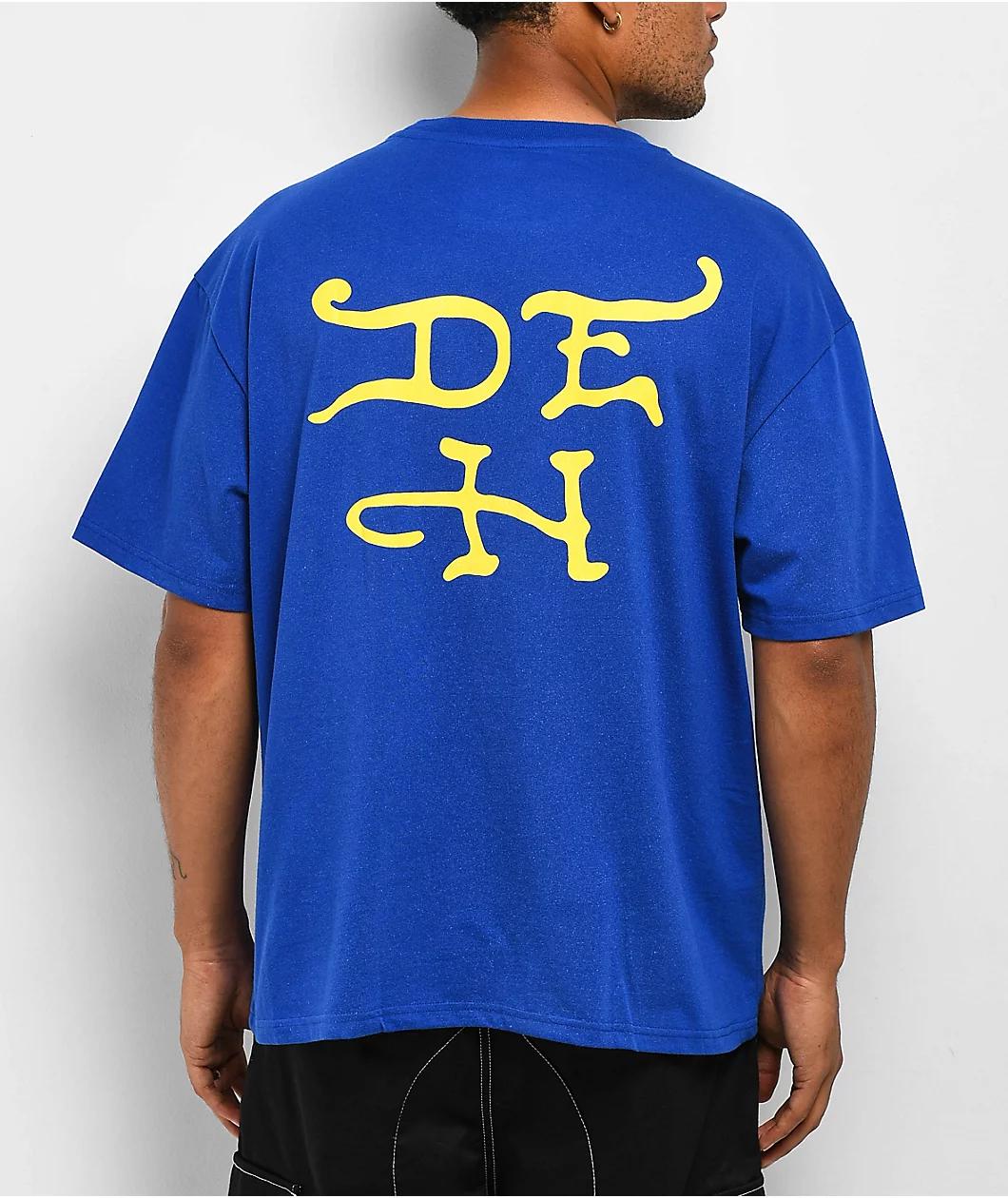 The Dragon Head Vintage Blue T-Shirt from Ed Hardy brings serious attitude with tattoo-style artwork and bold branding. The front features a fierce dragon head in blue and yellow tones, accented with rhinestone details and Old English script. The bac