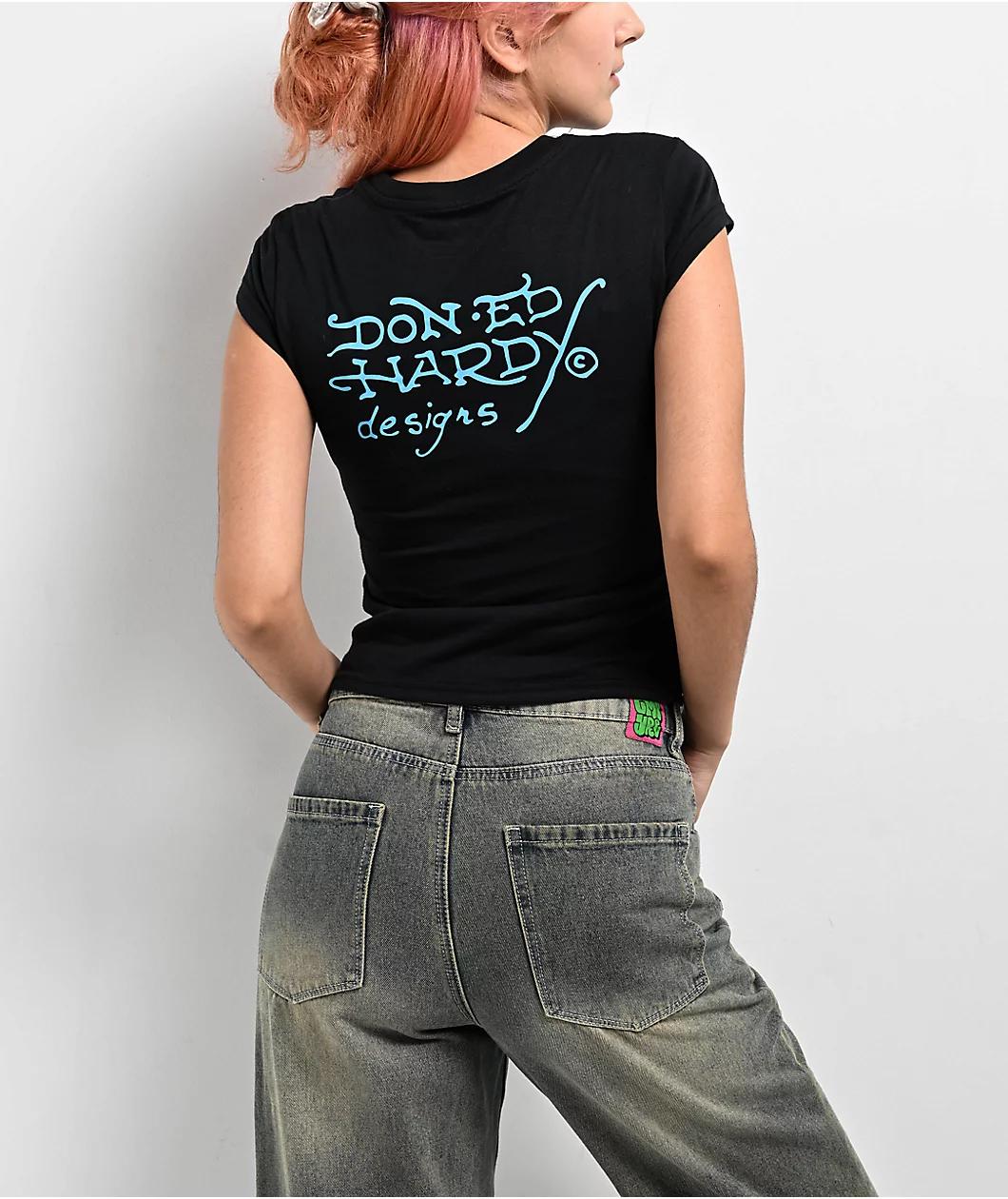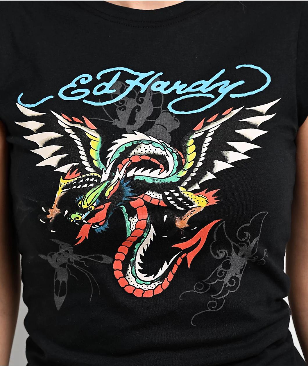 Arriving in a black colorway, the Ed Hardy Dragon Wings crop t-shirt has a Y2K look with tattoo-inspired imagery on the front. The graphics depict an eagle-winged dragon soaring through the sky aggressively, adorned with grey butterflies for depth. D
