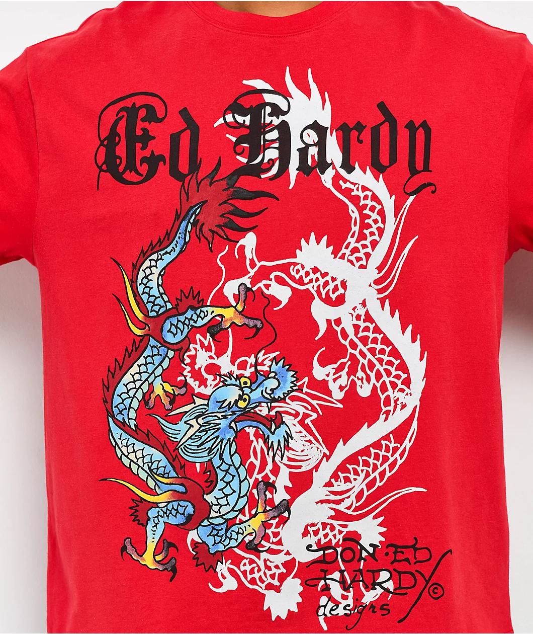 Unleash a fiery Y2K edge with the Dragons Vintage Boxy Red T-Shirt from Ed Hardy. A bold dragon design and Old English branding take over the front, while the back's stylized characters give it a rebellious touch. Made from a soft cotton-poly blend,