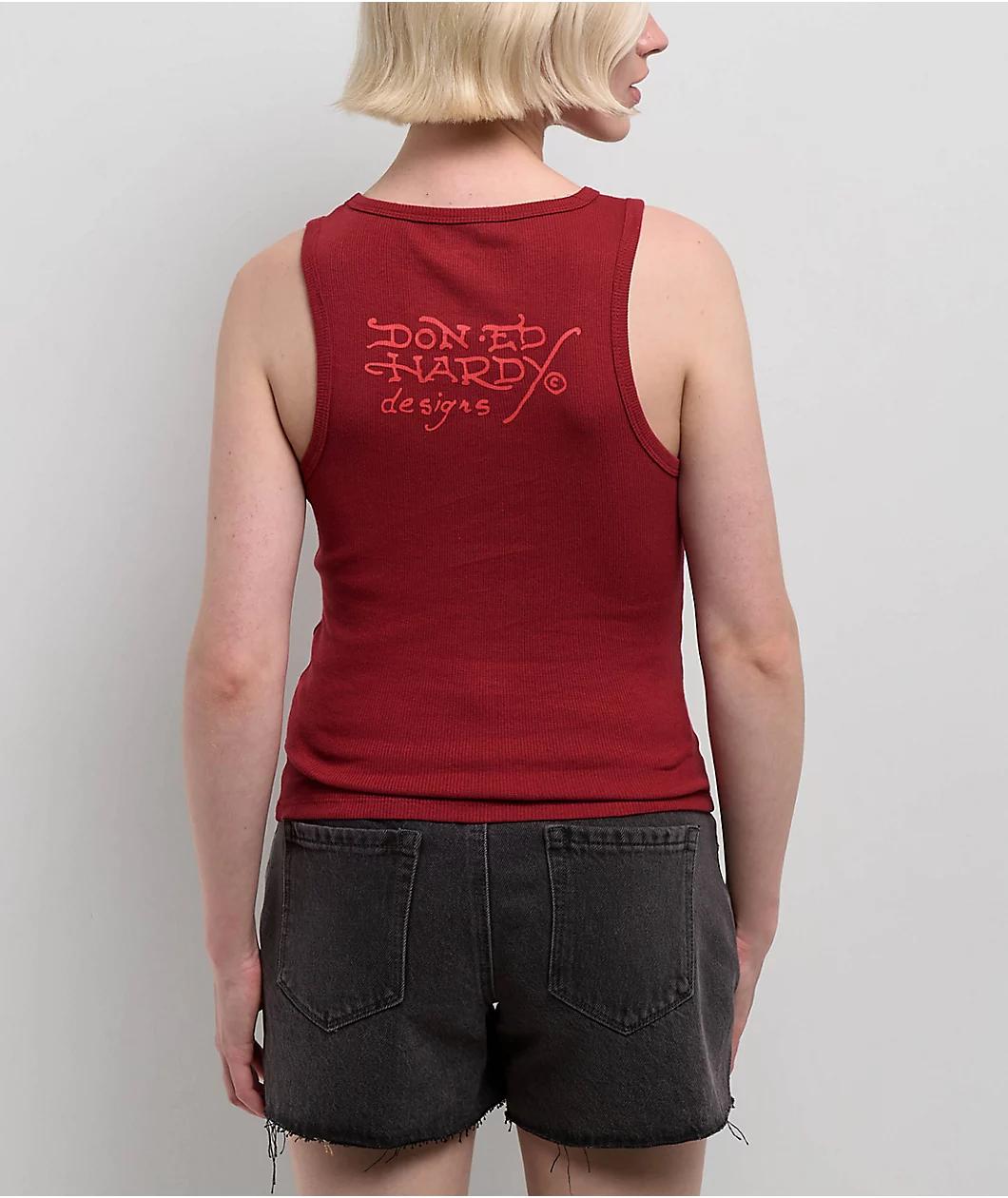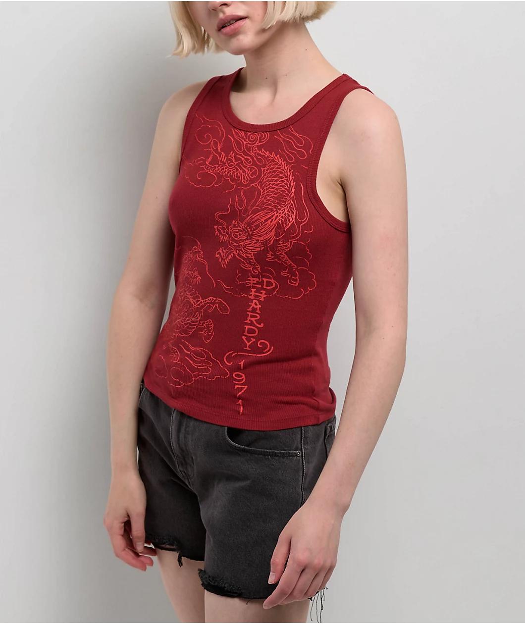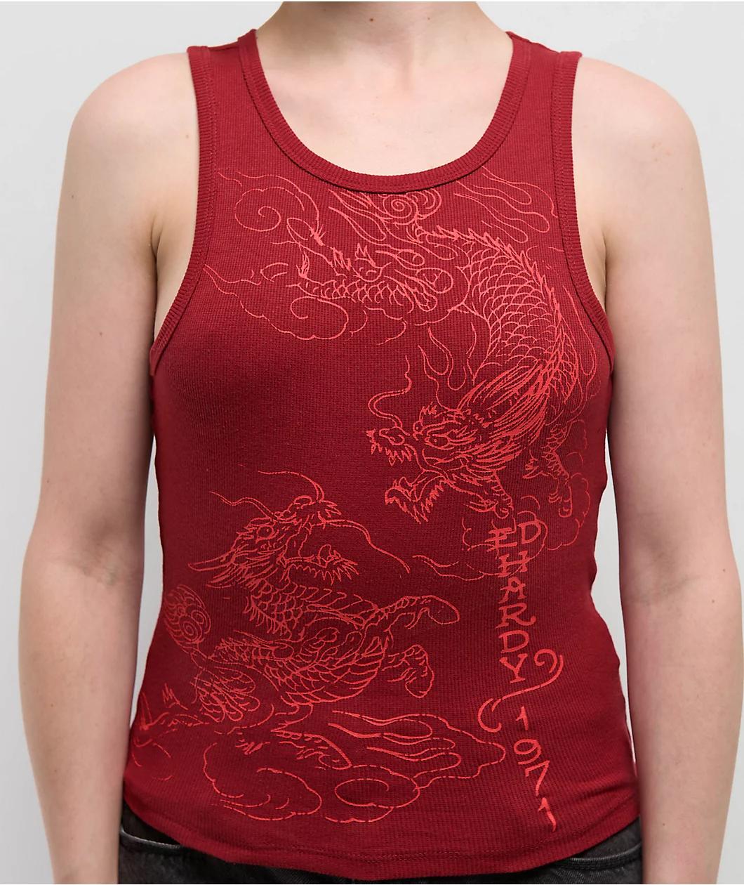 Add a classic vibe to any outfit with the Dragons tank top from Ed Hardy, landing in a Wine red. Vintage tattoo artwork of two Asian-inspired Dragons decorates the front, with signature branding adorning the back for a retro feel. A ribbed constructi