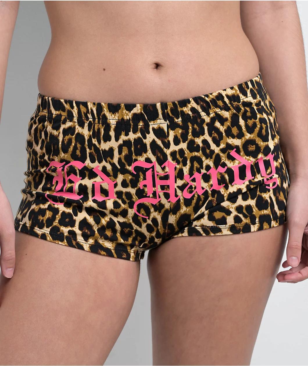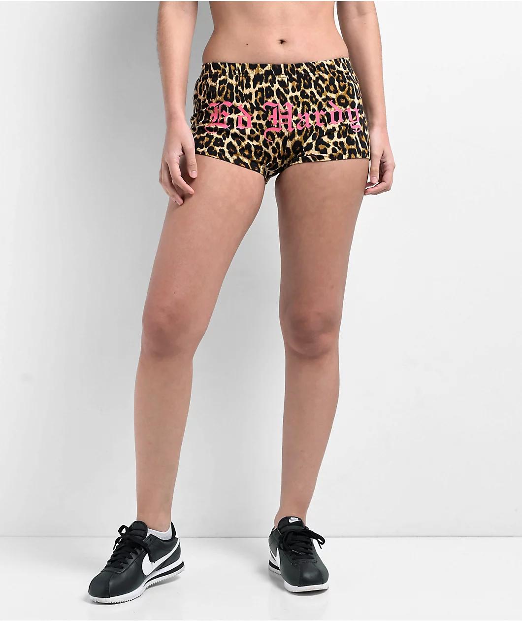 Add bold Y2K style even to your at-home outfits with the Heart Wings lounge shorts from Ed Hardy. A sublimated leopard print throughout has an early 2000's look, with vintage Ed Hardy artwork and branding printed on the front and back furthering the
