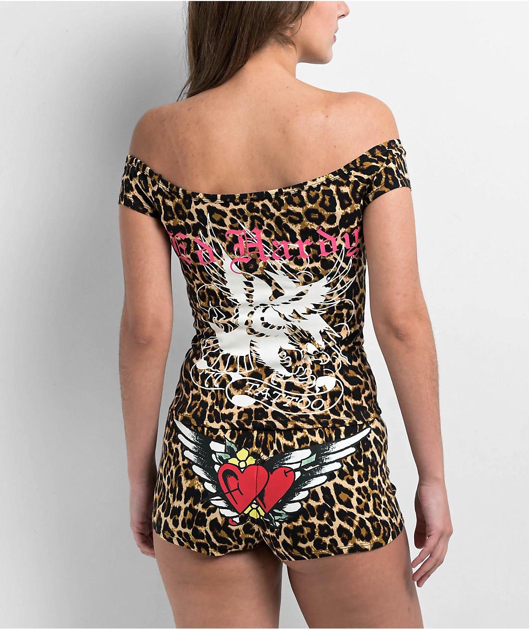 Throwback any outfit to the Y2K era with the Hearts off shoulder crop top from Ed Hardy. Featuring a bold leopard print throughout, the slim fit t-shirt uses classic Ed Hardy tattoo artwork on the front and back to further the vintage vibes. A printe