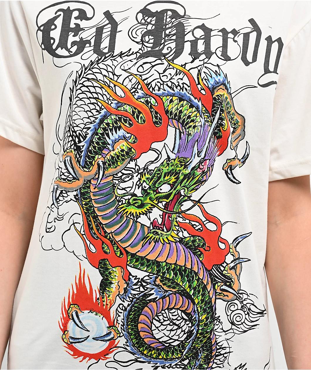 Capturing nostalgic look with a Japanese influence, Ed Hardy presents the Japan Dragon t-shirt in a natural beige hue with screen-printed tattoo-style graphics on the front and back. The front of the short sleeve delivers a maximalist vibe with a col
