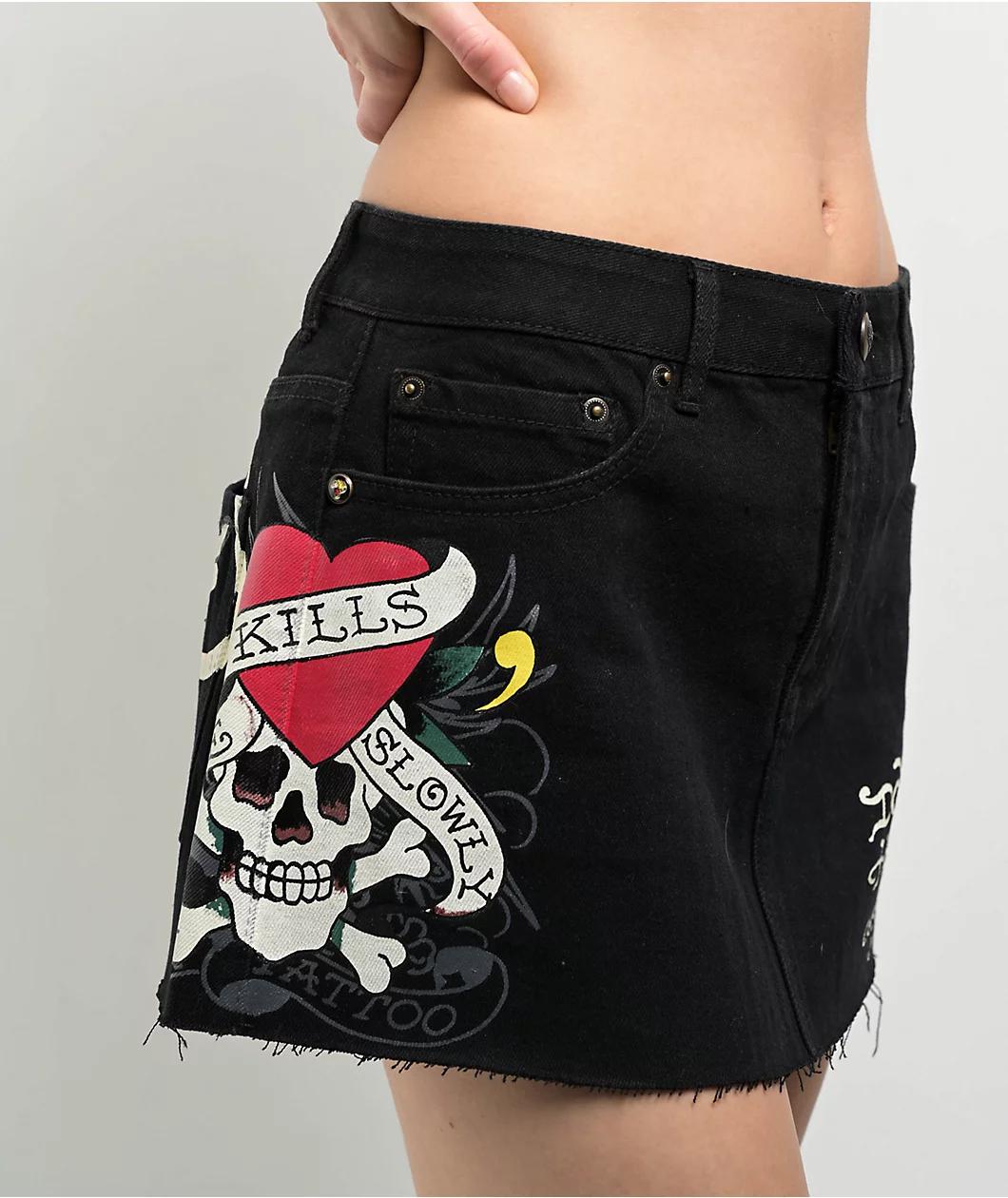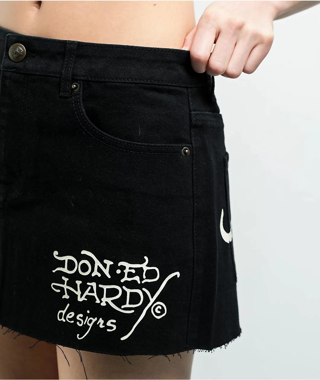 Inspired by classic silhouettes from the early 2000's, Ed Hardy welcomes the LKS Skull mini skirt in a solid black denim build with a frayed, unfinished bottom hem for a DIY cutoff look. Covered with screen-printed graphics throughout, the right side