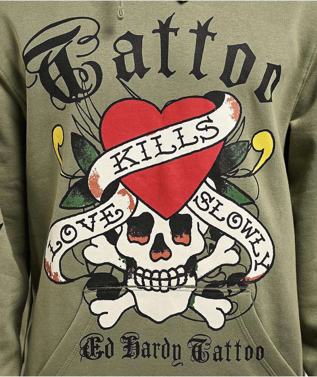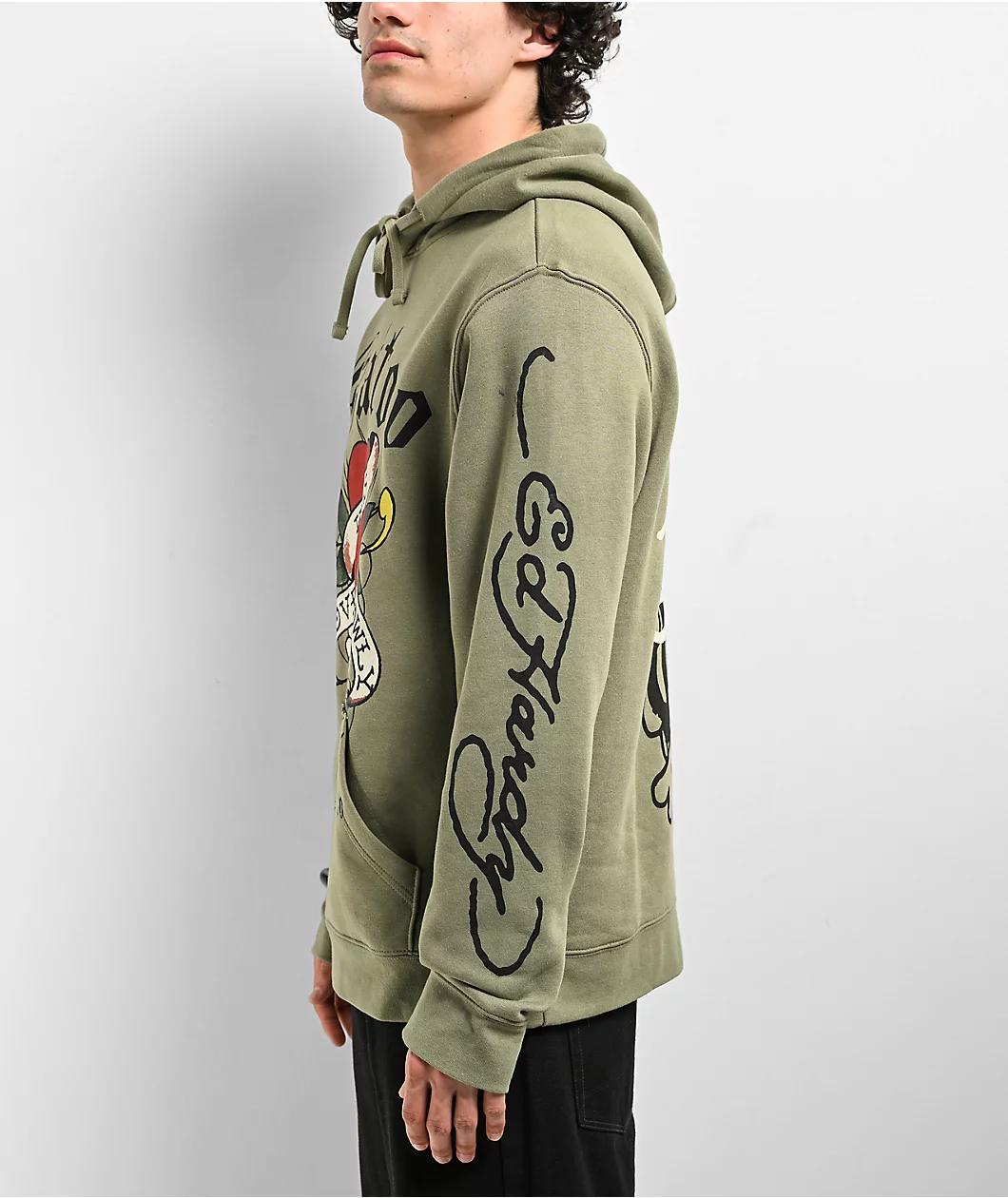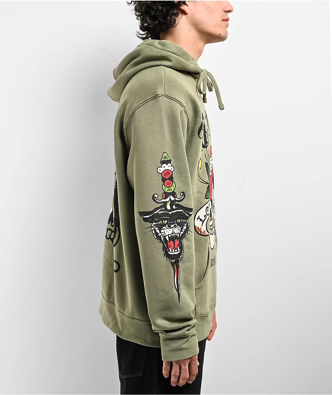 A pioneer in Modern tattoo culture, Ed Hardy presents the LKS Skull hoody in a green color scheme with multicolor screen-printed graphics throughout displaying the artist's iconic work. Featuring a soft brushed interior for cozy comfort, the long sle
