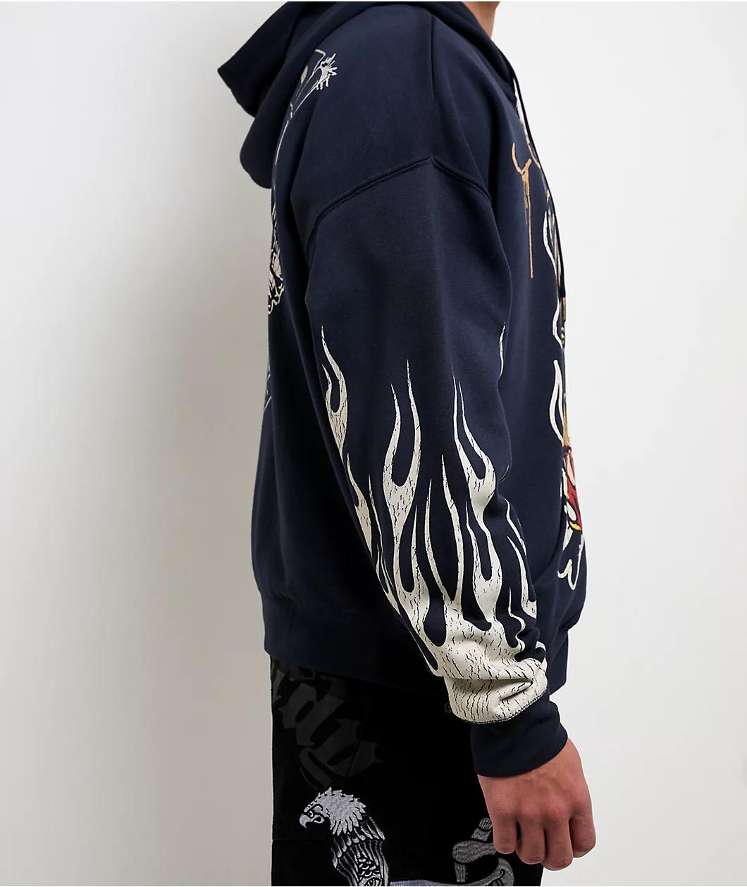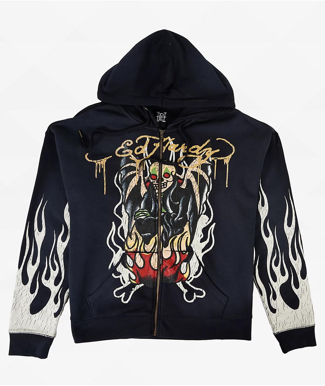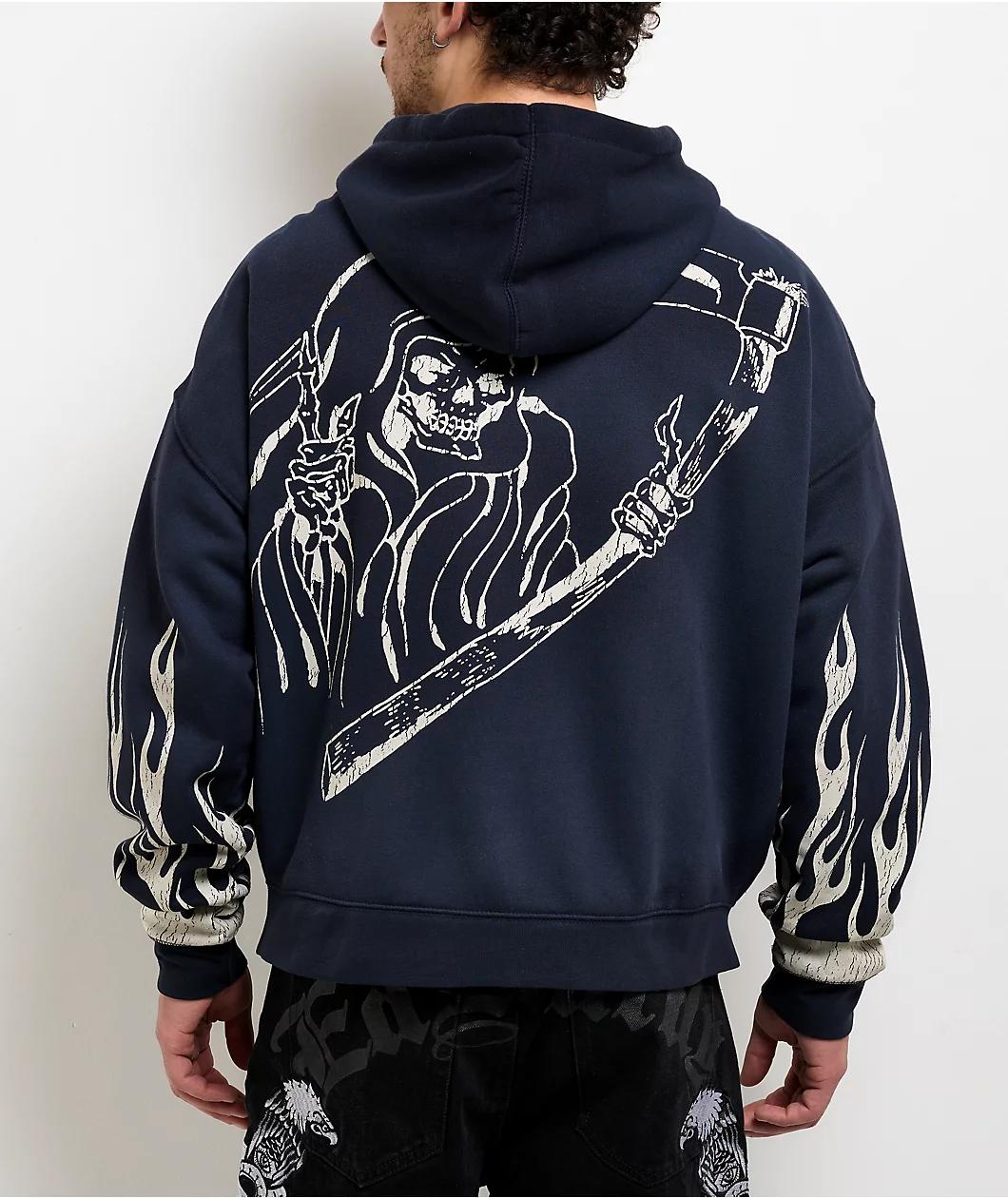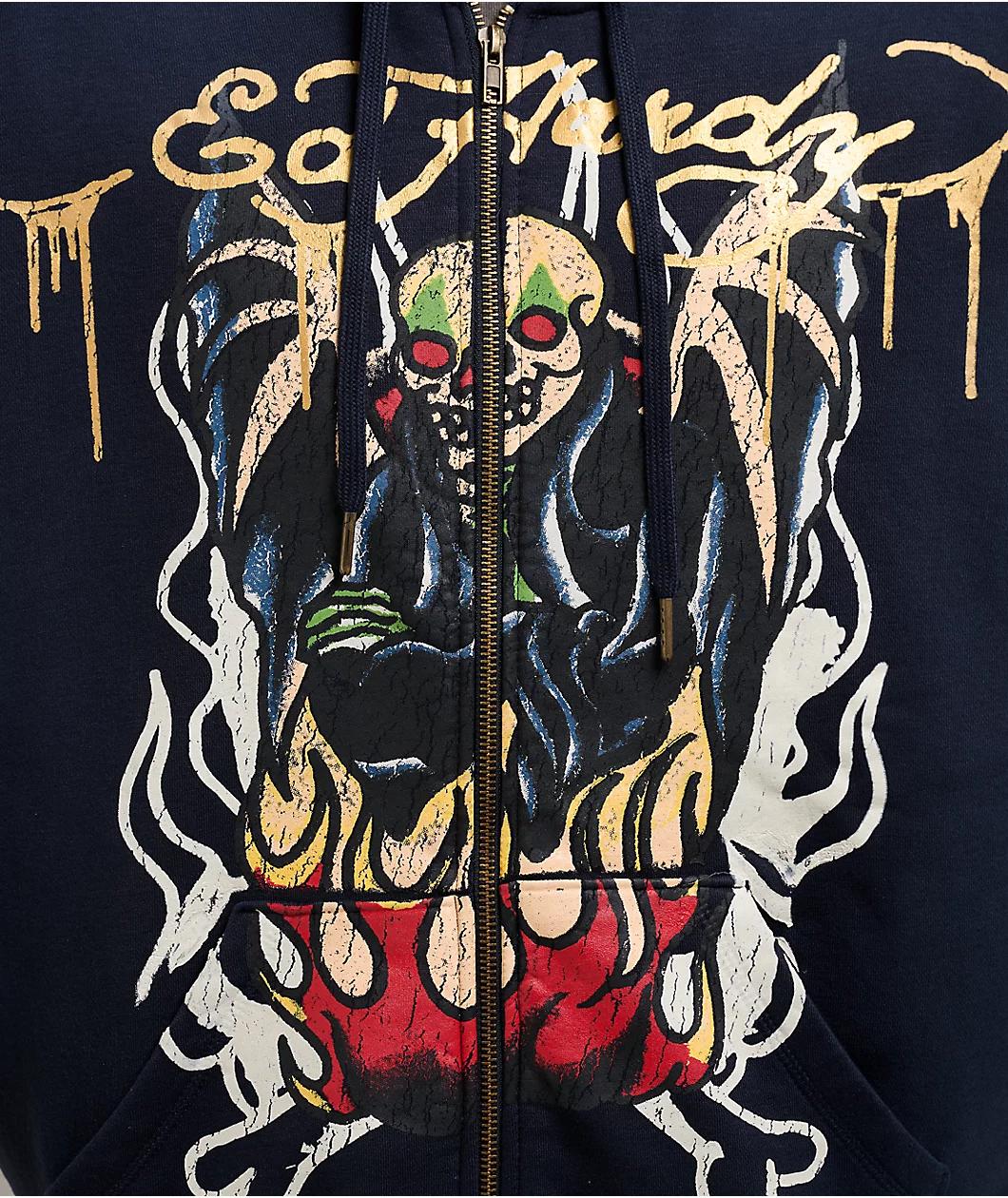 The Lord Sunfade zip hoodie from Ed Hardy stands out with thick screen prints across the chest and sleeves. A large reaper illustration on the back and mysterious figure on the front add depth to the dark navy backdrop. Finished with a zip front and
