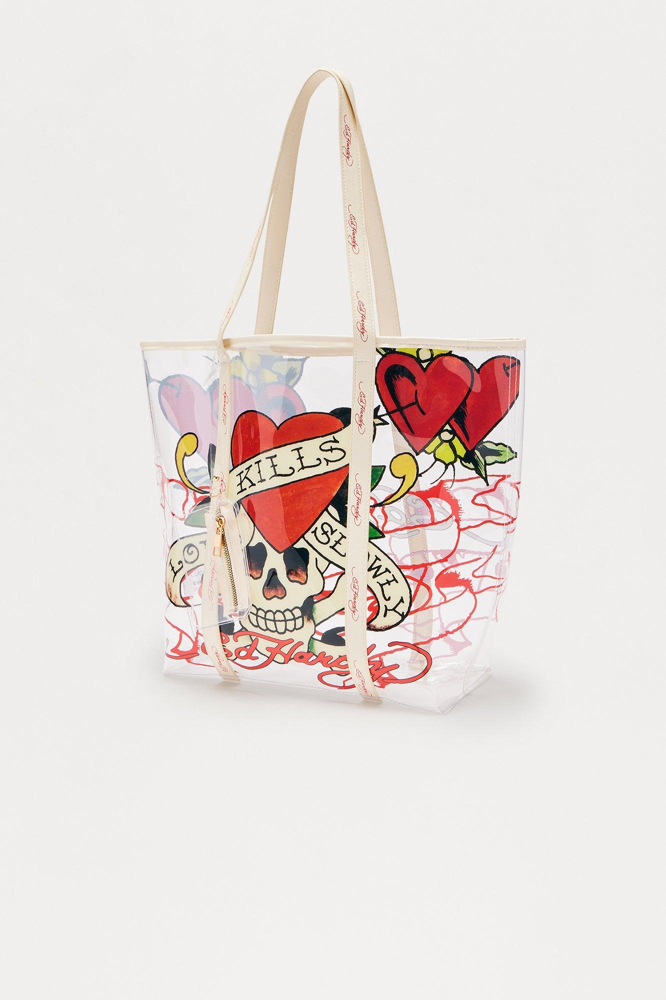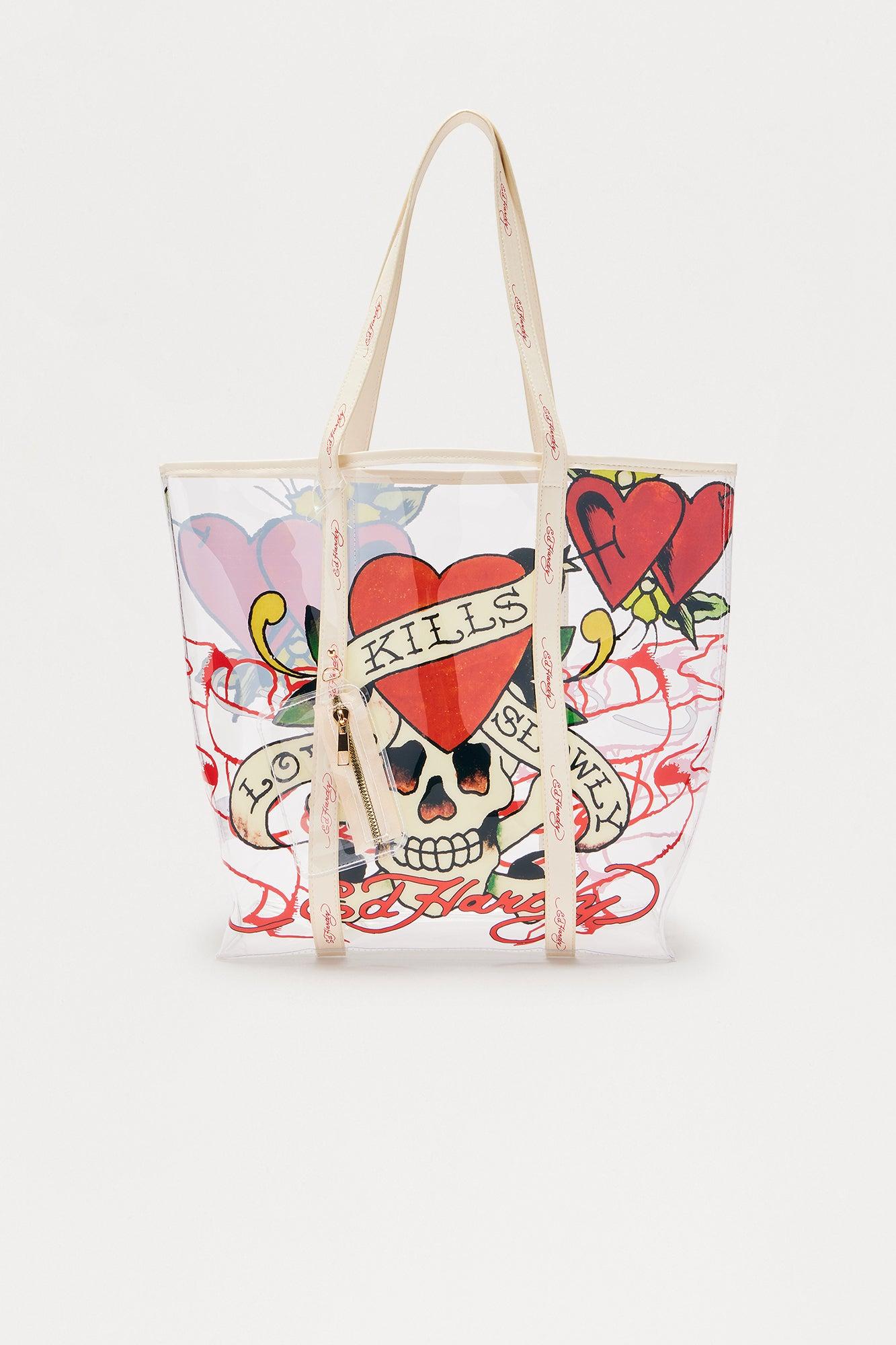 Available In White/combo. Clear Tote Top Zip Closure Heart And Scull Design Ed Hardy Branded Verbiage Detail 10.5" 4" 10" Imported California Proposition 65WARNING: Cancer and Reproductive Harm - www.P65Warnings.ca.gov.