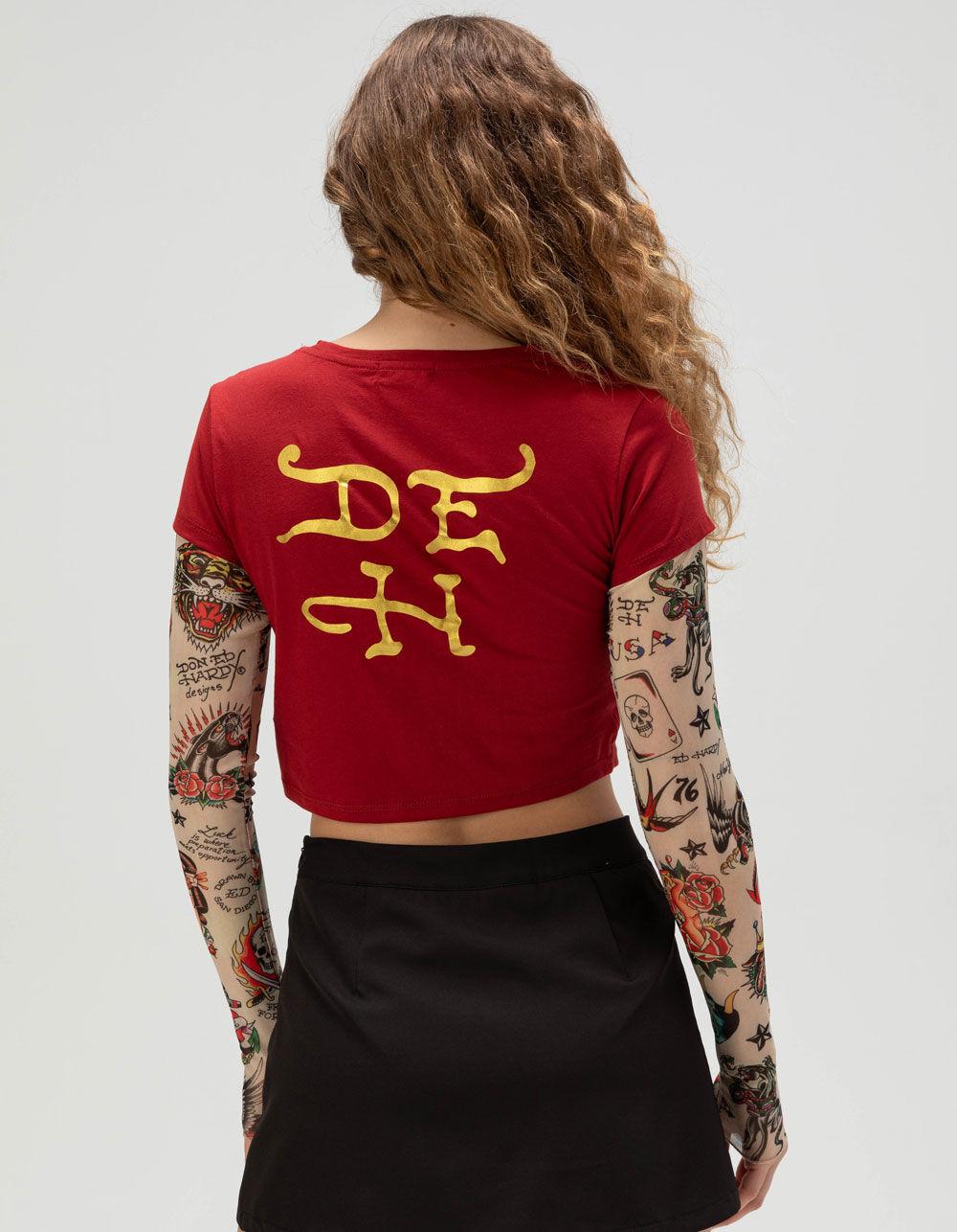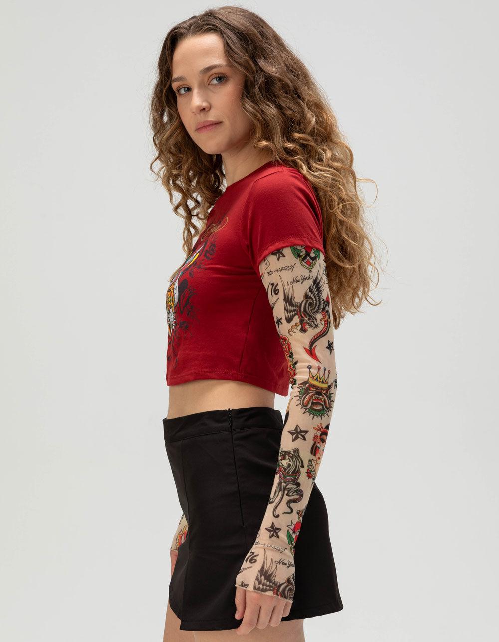 WINE. ED HARDY Love Tiger Long Sleeve 2fer Baby Tee. Ed Hardy's classic baby tee silhouette with mesh sleeves for the perfect layered look. Features a love runs wild tiger graphic and sleeves with an allover Ed Hardy tattoo print. Crew neck. Long sleeves. 65% Polyester 35% Cotton. Sleeves: 95% Polyester 5% Spandex. Machine wash. Imported.
