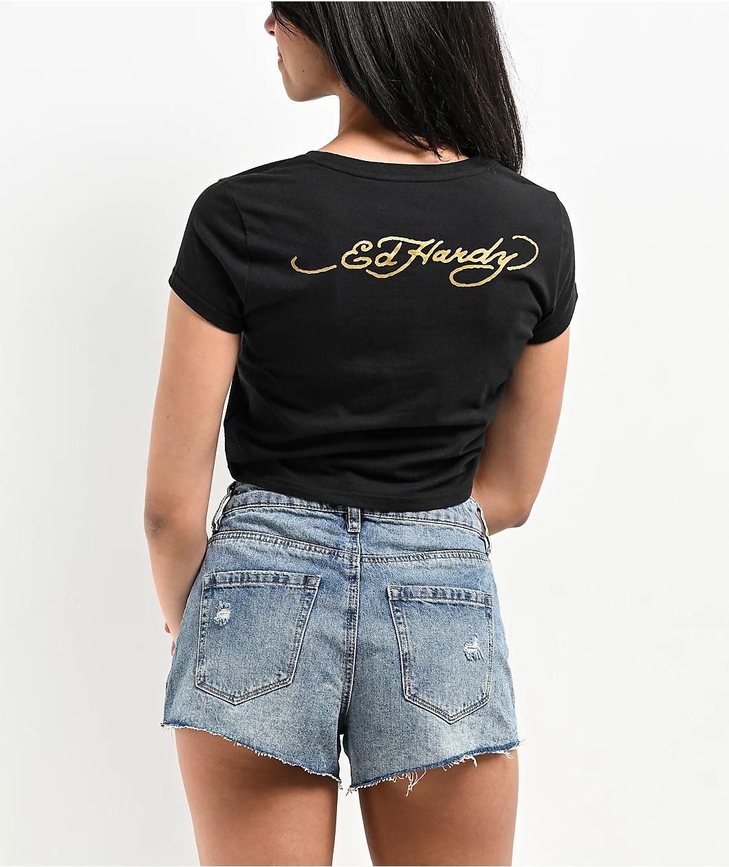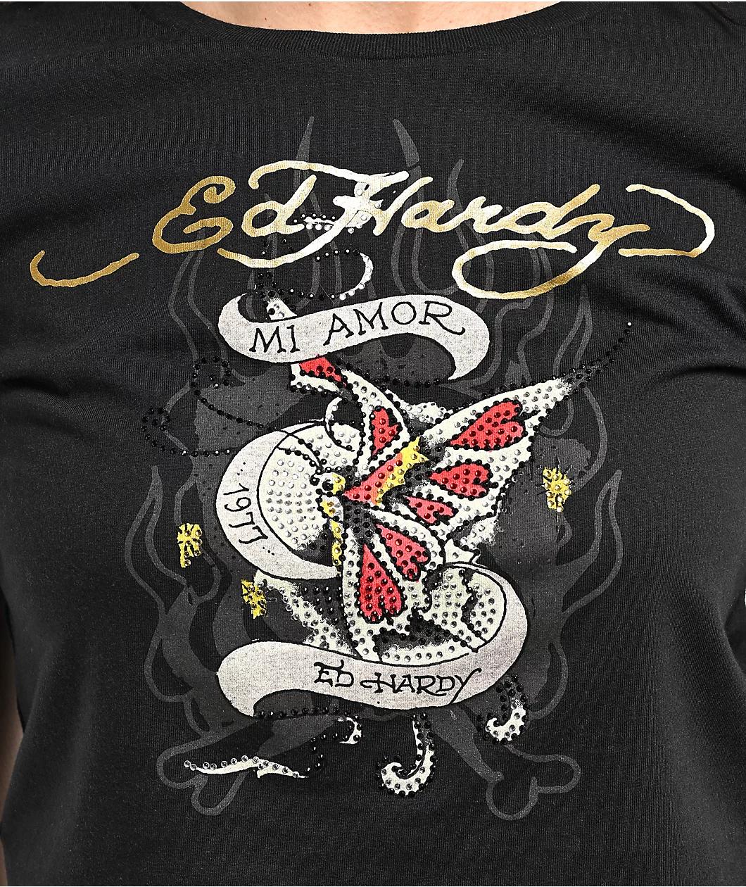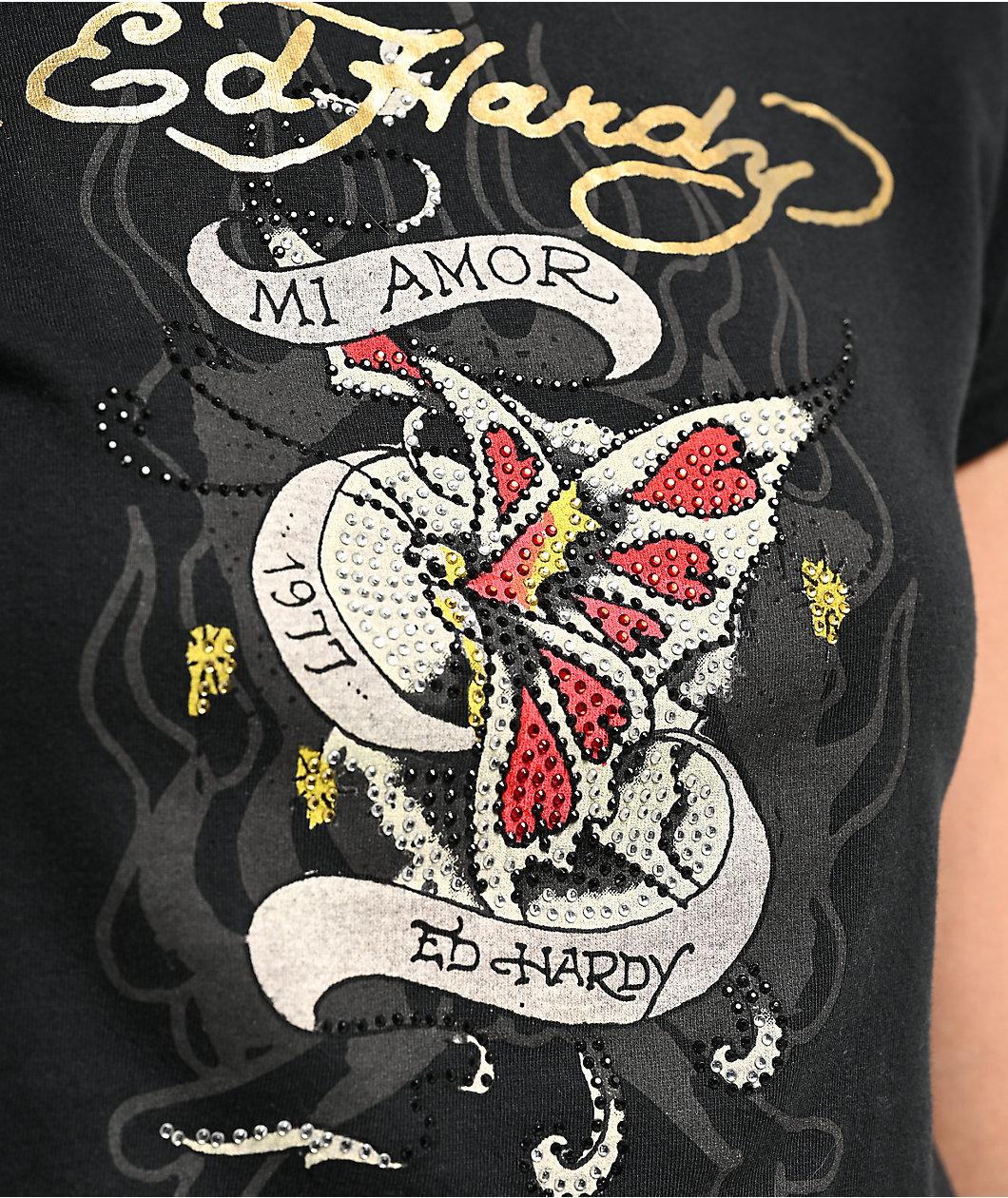 Ed Hardy presents the Mi Amor rhinestone crop t-shirt in a black colorway with screen-printed graphics on the front and back. This soft cotton blend fabric offers a cozy fit while boasting Y2K traditional tattoo artwork on the front. The design depic