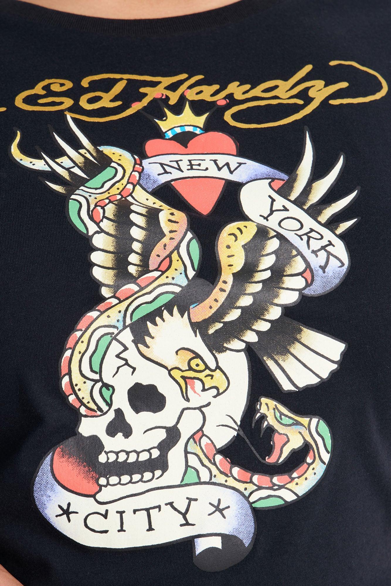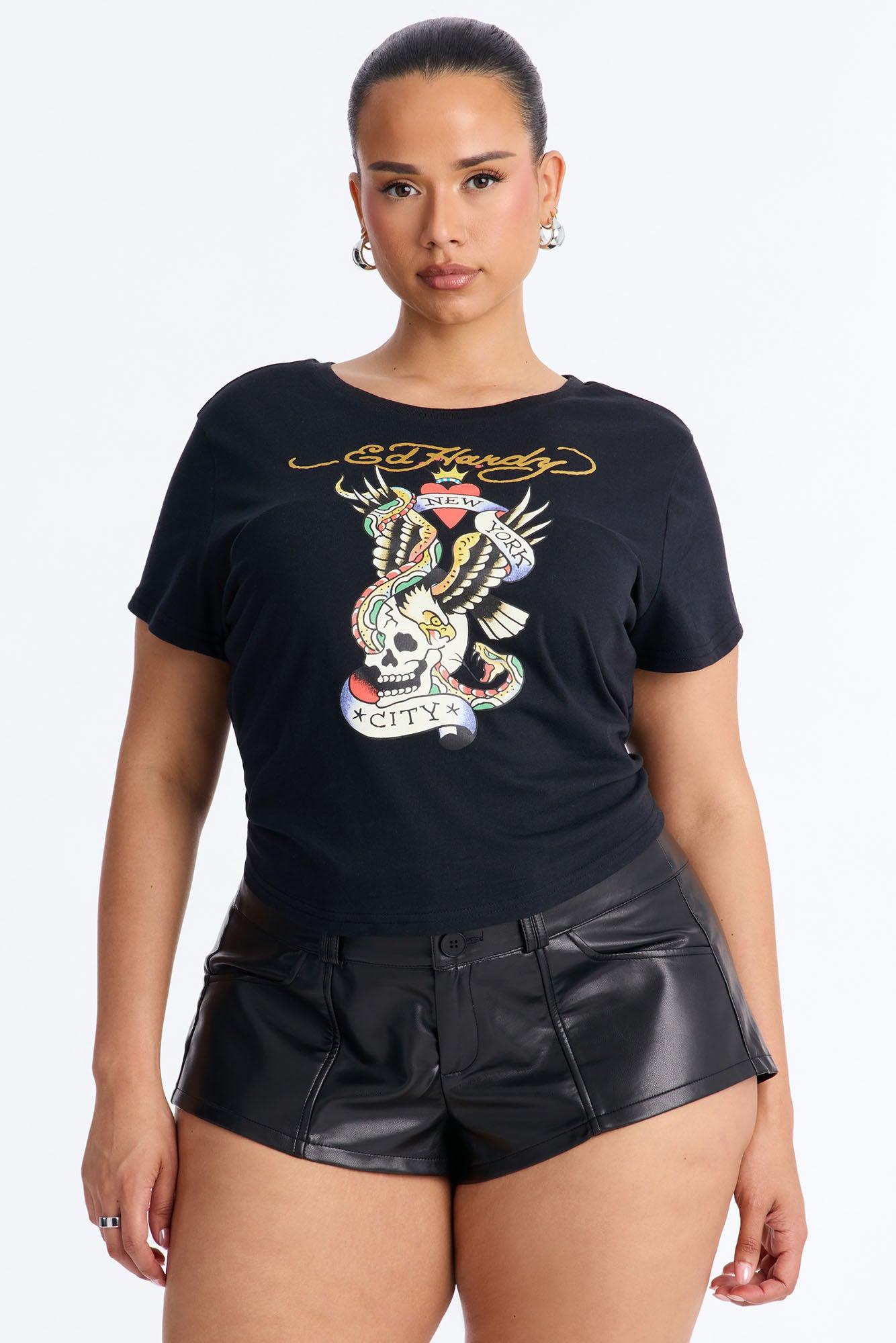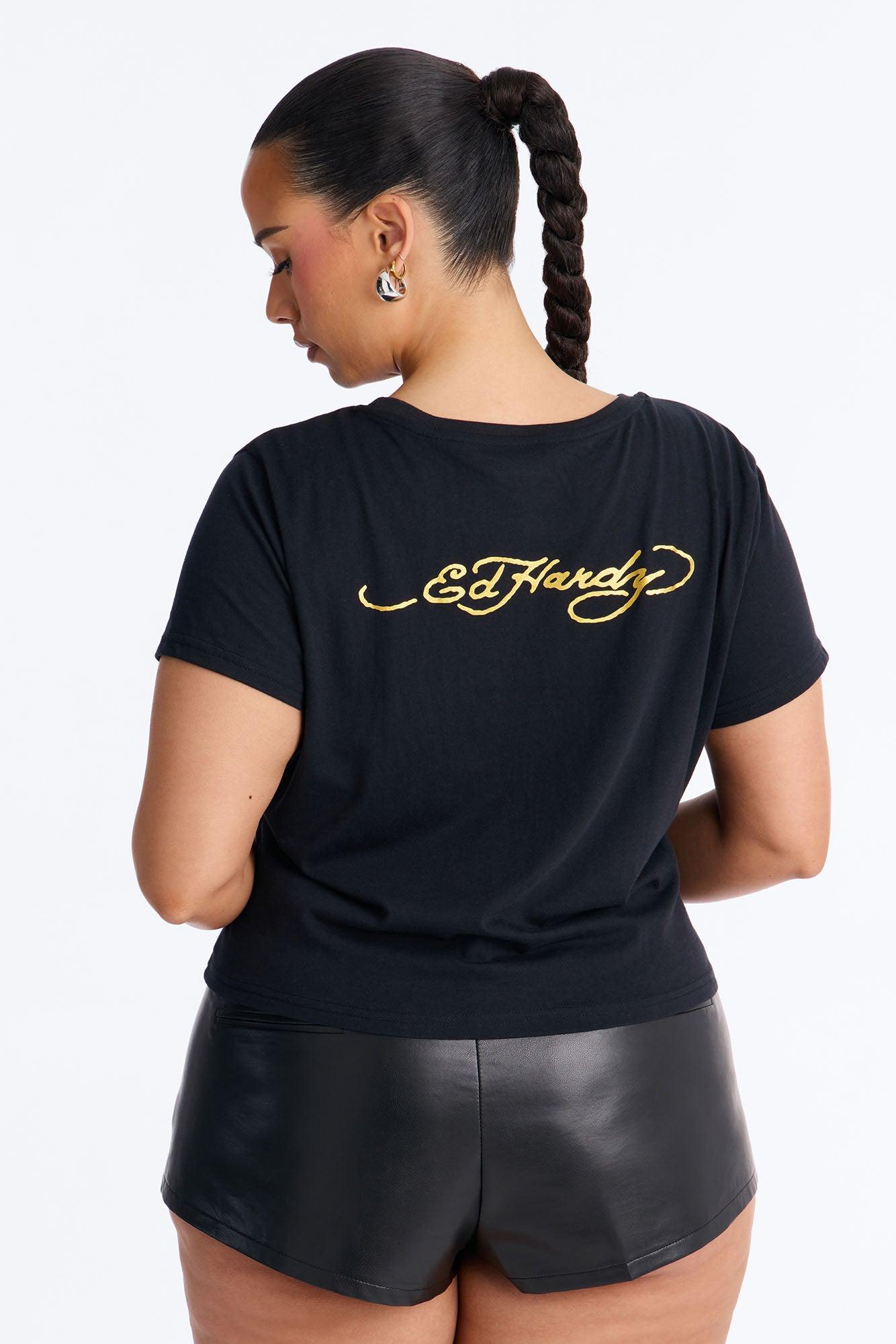 Available In Black. Baby Tee Crew Neck Short Sleeve Ed Hardy Graphic Cropped Stretch Disclaimer: Due To The Printing Process A Difference In Saturation May Occur. Each Garment Is Unique. Print Placement Will Vary. 65% Polyester 35% Cotton Imported