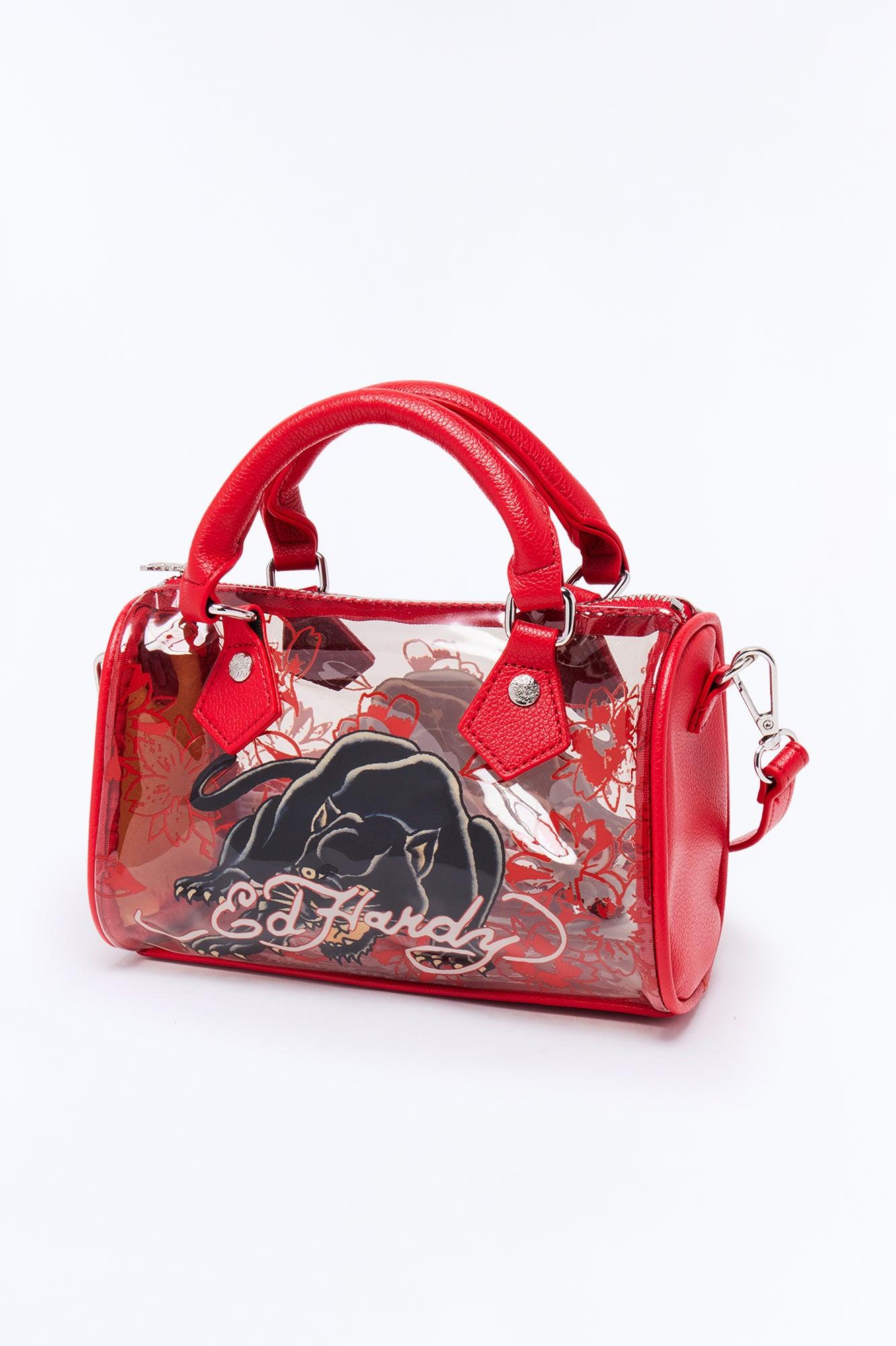 Available In Red/combo. Clear Satchel Bag Top Zip Closure Panther Detail Ed Hardy Branded Verbiage Detail 10.5" x 4" x 10" Imported California Proposition 65WARNING: Cancer and Reproductive Harm - www.P65Warnings.ca.gov.