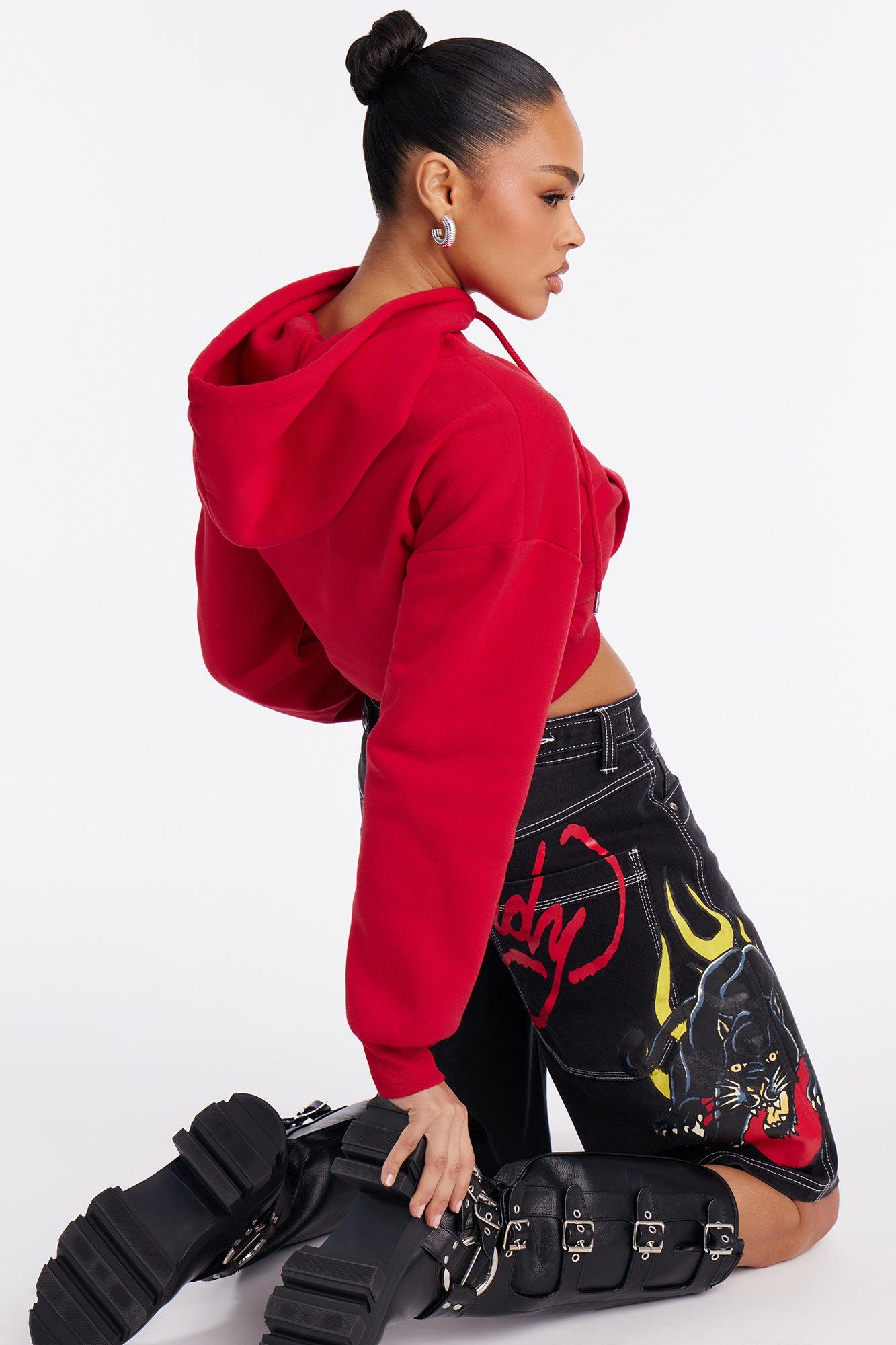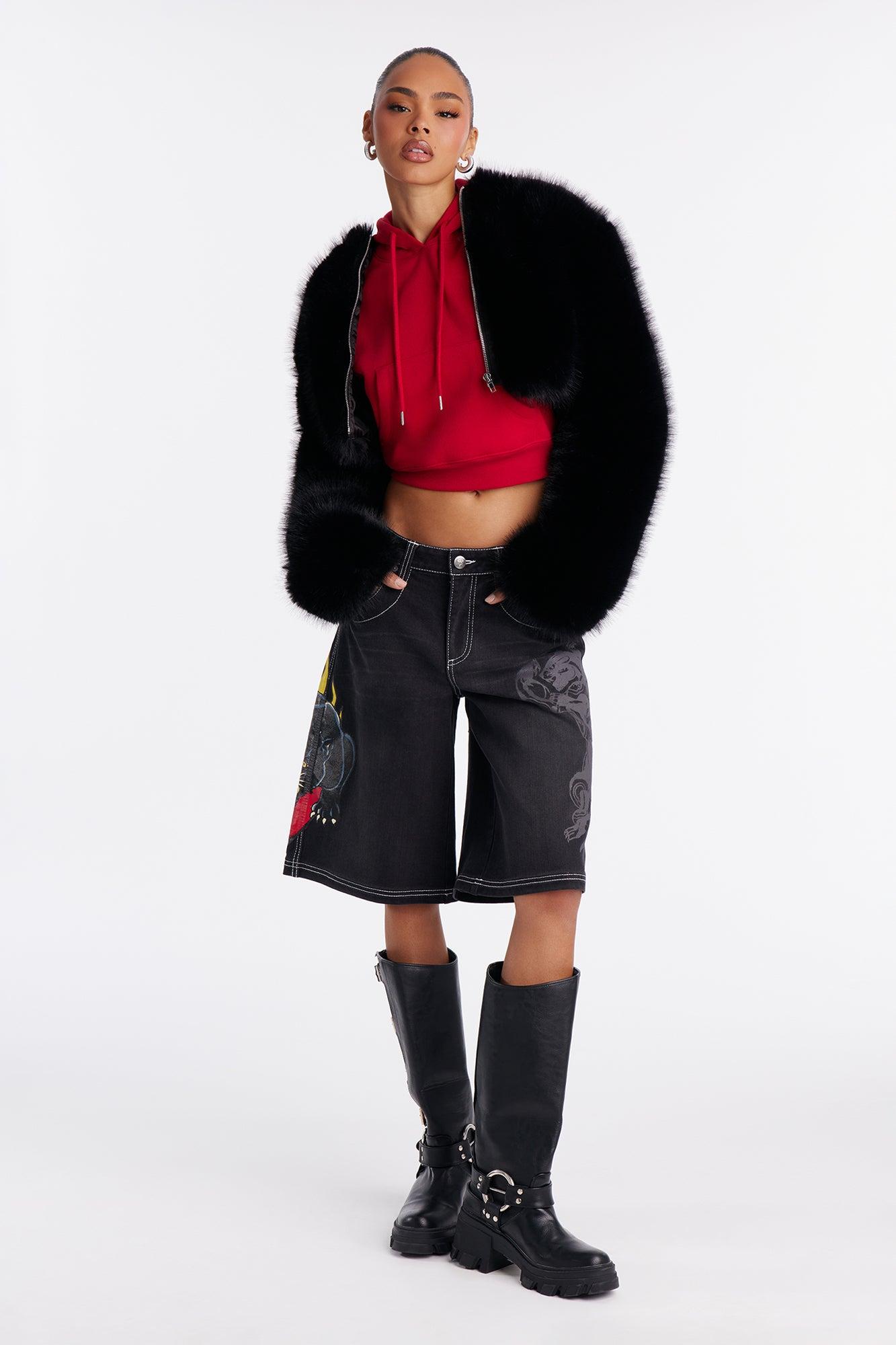 Available In Black Wash. Denim Jort 5 Pocket Printed Graphic 10.5" Rise 12.5" Inseam Medium Stretch Disclaimer: Due To The Printing Process A Difference In Saturation May Occur. Each Garment Is Unique. Self: 69% Cotton 27% Polyester 1% Spandex 3% Other Fiber Imported