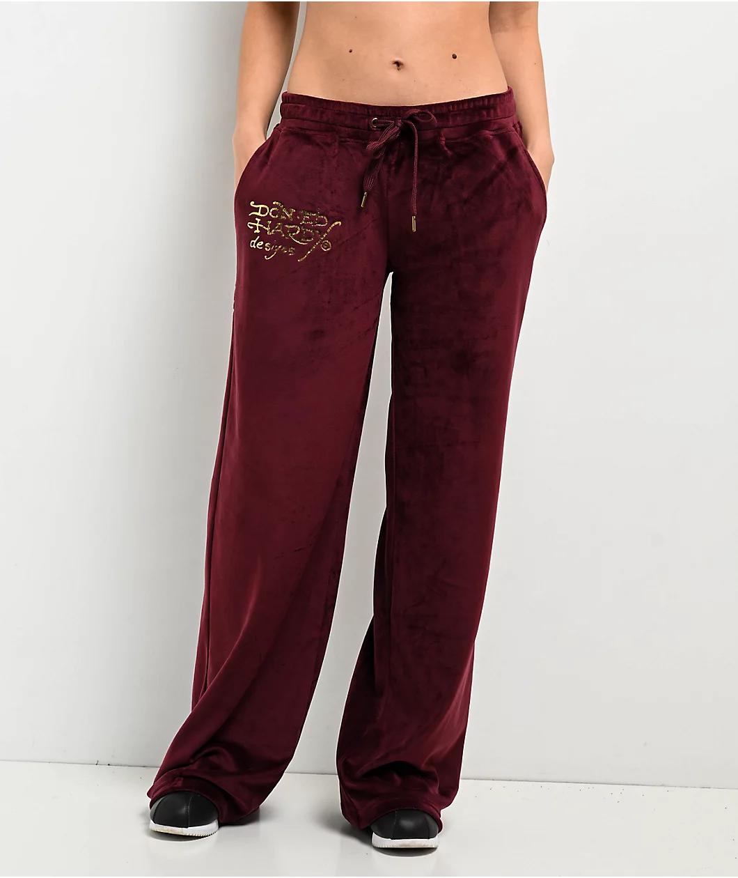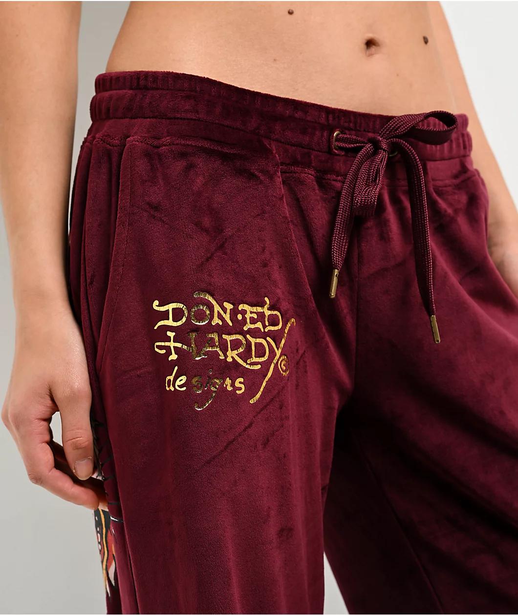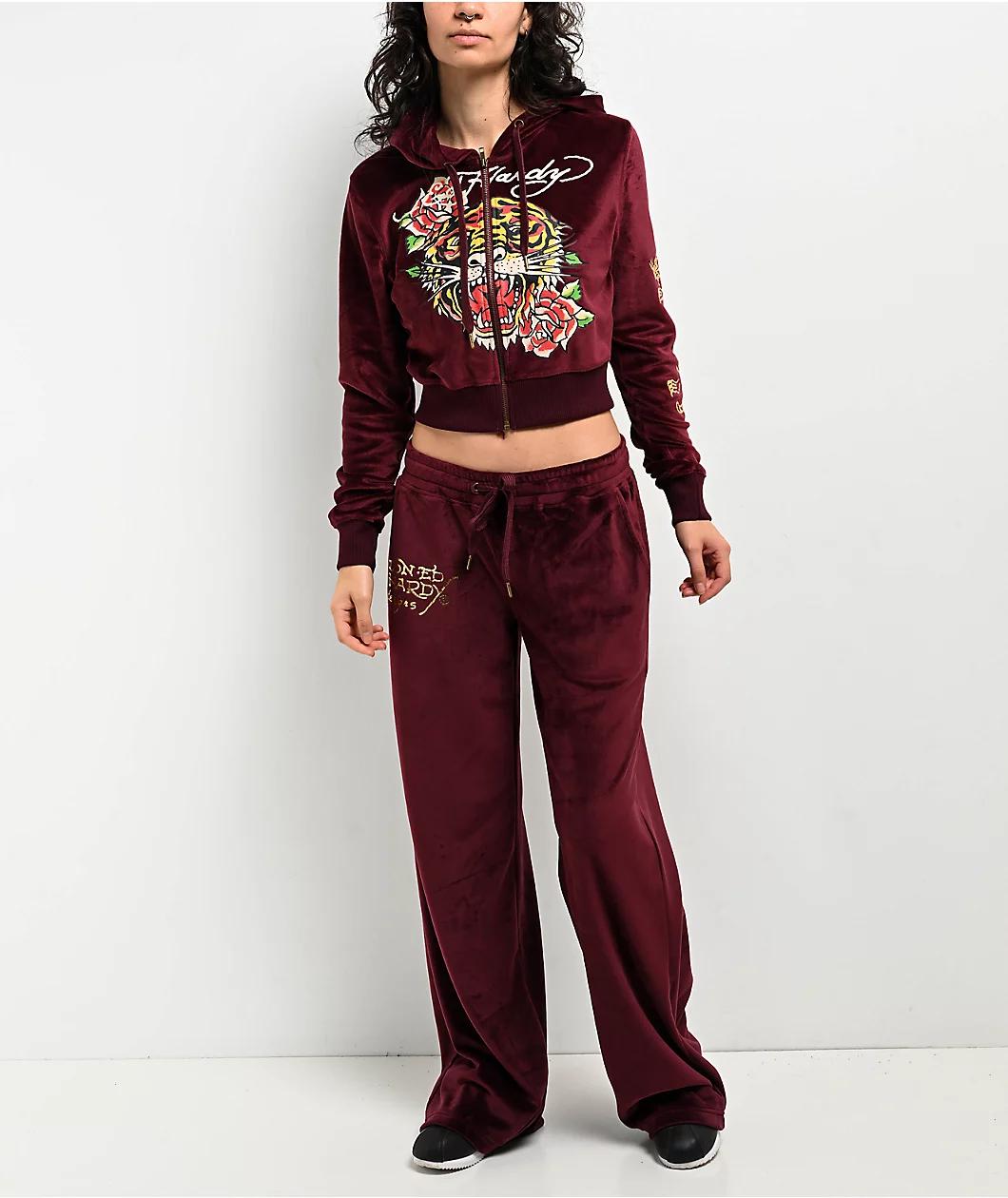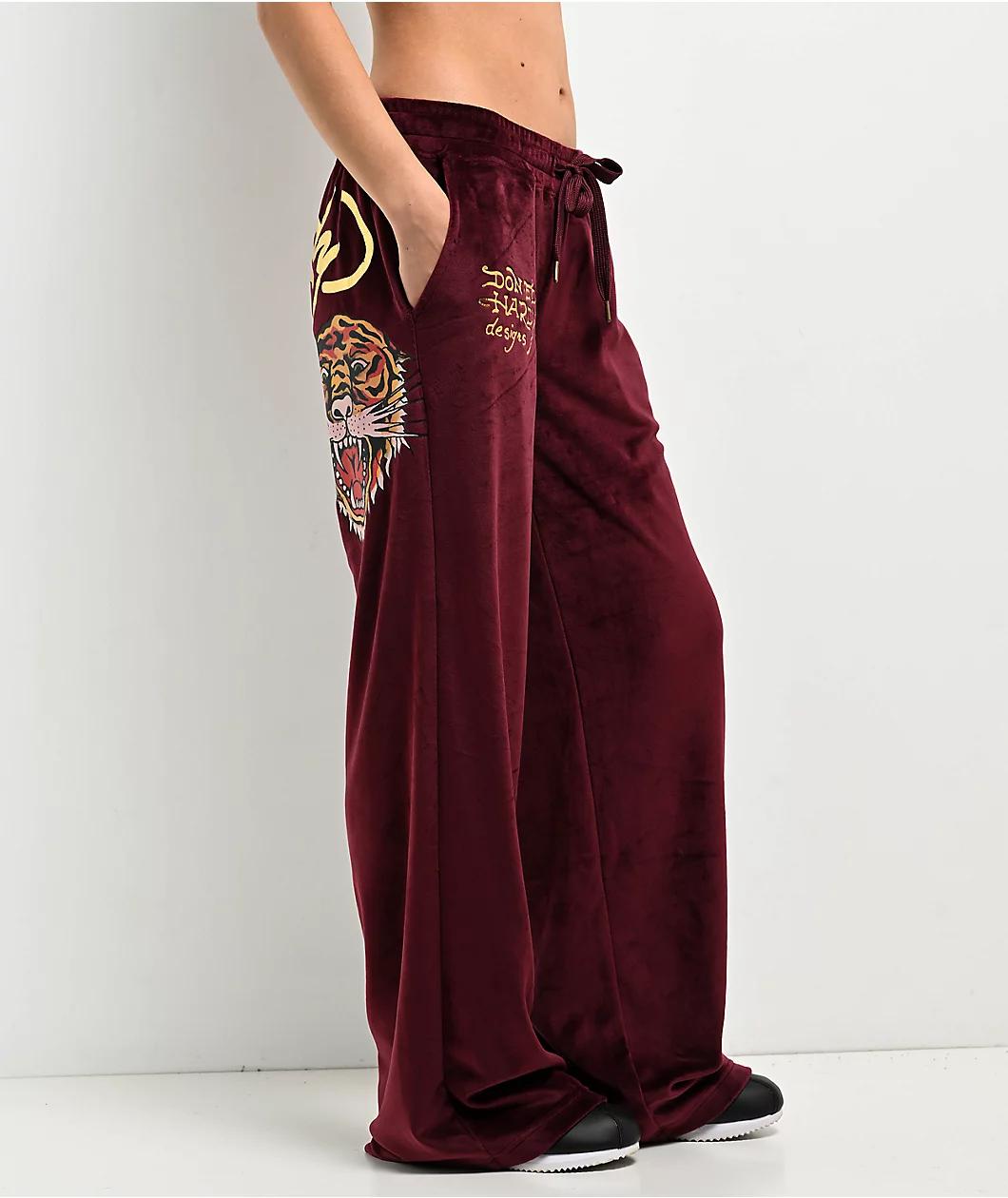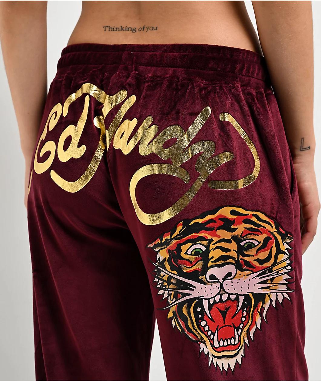 Elevate your cozy looks with the Retro Tiger velour track pants from Ed Hardy. Arriving in a rich burgundy colorway, these track pants are crafted from an ultra-soft velour for maximum comfort. A gold foil Ed Hardy logo at the rear with a tiger face